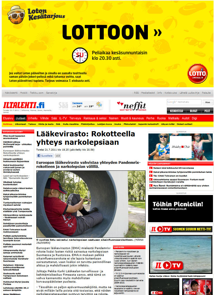 2011-07-21 Nettisanomat/Sanomanetti- julkaisujen TOP 30. Kävijätilastot toukokuu 2011. viikkosanomat.fi 25 621 - nettisanomat.com 21 030 - sanomanetti.fi 6 410 - 12.fi 5 817 - sanomatori.fi 1 578 - vuosisanomat.fi 1 145 - hs24.fi 1 001 - sanomapark.fi 824 - n24.fi 778 - infoinfo.fi 742 - jyppi.fi 742 - fy.fi 615 - wincapita.fi 530 - asiat.fi 417 - kuvasanomat.fi 412 - venus.fi 370 - vahtija.fi 361 - laukaansanomat.fi 348 - hs2.fi 312 - nettilehti.com 298 - helkinginsanomat.com 281 - nettifoto.fi 272 - sanala.fi 255 - infola.fi 234 - hs24.mobi 223 - fiftyfifty.fi 193 - nettila.fi 185 - sanomaa.com 181 - fotola.fi 168 - kuvaviikko.fi 160 (huhtikuu) - nettimobi.com 151 - mobix.fi 150. Yhteensä 68 429 eri kävijää. - Linkit! ILTALEHTI.fi Lääkevirasto: Rokotteella yhteys narkolepsiaan. Euroopan lääkevirasto vahvistaa yhteyden pandemrix-rokotteen ja narkolepsian välillä. http://www.iltalehti.fi/uutiset/2011072114093398_uu.shtml 2010: ILTALEHTI.fi 2010-08-30. Markku Partinen kertoo: Näin kaikki tapahtui. http://www.nettisanomat.com/2010/08/30/etusivu.htm |