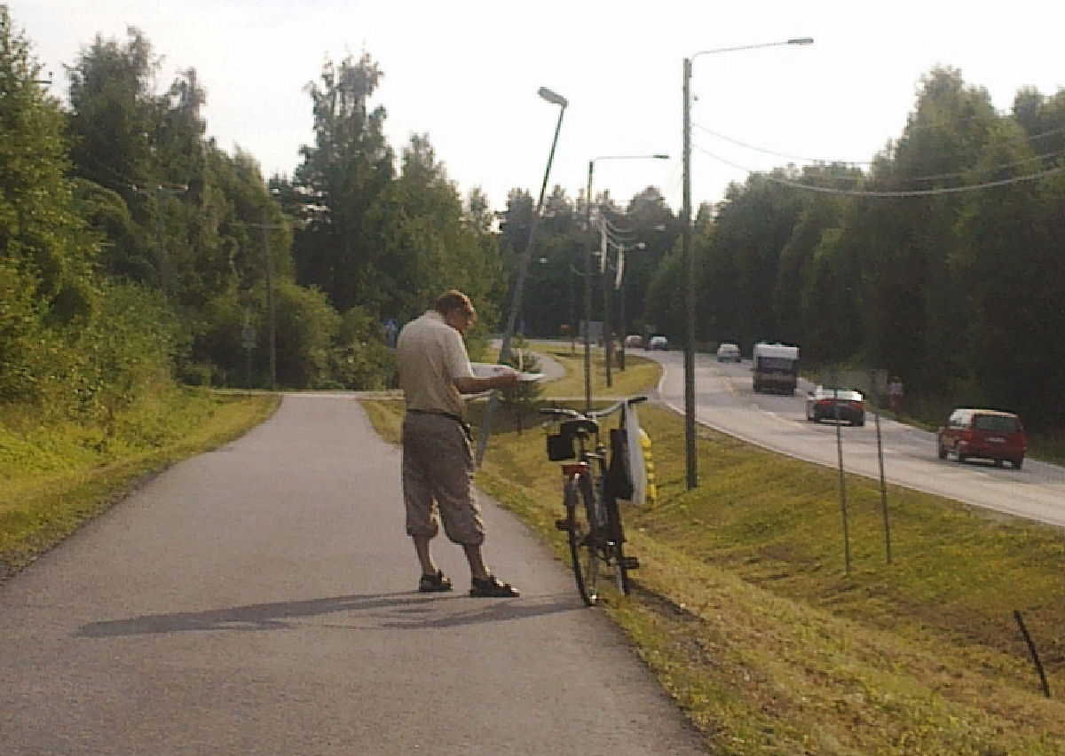 Neste Oil Rally Finland - Suomen MM-ralli - Jyväskylän MM-ralli. Viimeiset kuulumiset Radio-Keski-Suomen lähetyksestä kuuluvat hiljentyneellä kylällä leppoisassa illassa ja eikö vielä pyöräilijäkin ole pysähtynyt lukemaan viimeisiä rallijuttuja. Kuva: Keski-Suomi. Jyväskylän seutu. Laukaa. Keskusta. Kaupat ja kilometeri Jyväskylään päin. - Pertti Manninen sattumalta paikalle osuneena torstaina 2011-07-28 klo 18:39 ja 18:46. |
