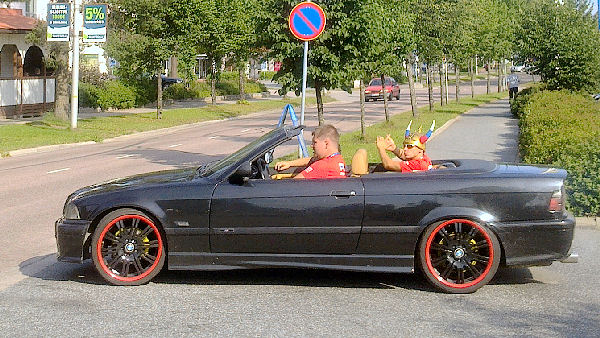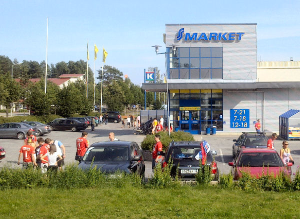 Neste Oil Rally Finland - Suomen MM-ralli - Jyväskylän MM-ralli. Venäläiset vieraat ovat pysähtyneet tankkaamaan Laukaan S-Markettiin jatkaen matkaaansa selittävissä tunnelmissa. Kuva: Keski-Suomi. Jyväskylän seutu. Laukaa. Keskusta. - Pertti Manninen sattumalta paikalle osuneena torstaina 2011-07-28 klo 16:55 ja 16:56. |