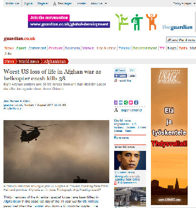 World news Afghanistan Worst US loss of life in Afghan war as helicopter crash kills 38 Eight Afghan soldiers and 30 US forces from unit that killed Bin Laden die after insurgents shoot down Chinook Jon Boone in Kabul guardian.co.uk, Sunday 7 August 2011 00.08 BST Thirty members of the American special forces have been killed in Afghanistan in the deadliest day of the 10-year war for US military personnel when the Taliban shot down a Chinook helicopter. The majority of those killed were from Navy Seal Team 6, the unit that killed Osama bin Laden in a night-time raid deep into Pakistan, but are not the same personnel. Eight members of the Afghan National Army were also killed when rebels destroyed the massive double-rotor transport helicopter with a rocket-propelled grenade. The Taliban claimed they had downed the helicopter with rocket fire while it was taking part in a raid on a house where insurgents were gathered in the province of Wardak. It said wreckage was strewn at the scene. Nato confirmed the crash and added that there "was enemy activity in the area". But it said it was still investigating the cause and conducting a recovery operation. It did not release details or casualty figures. The attack came during a surge of violence that has accompanied the beginning of a reduction in Nato and US troop numbers, and showed how deeply entrenched the insurgency remains. Barack Obama paid tribute to the victims of the crash. "We will draw inspiration from their lives and continue the work of securing our country and standing up for the values they embodied. We also mourn the Afghans who died alongside our troops in pursuit of a more peaceful and hopeful future for their country." In a statement to the US president, Hamid Karzai, the Afghan president, expressed "deep sorrow and sadness". The previous most deadly day for US personnel in Afghanistan was in June 2005, when 16 Seals were killed after a Taliban rocket hit a Chinook in the eastern province of Kunar. American officials said that 22 of the dead from yesterday's attack were Seals. At a time of