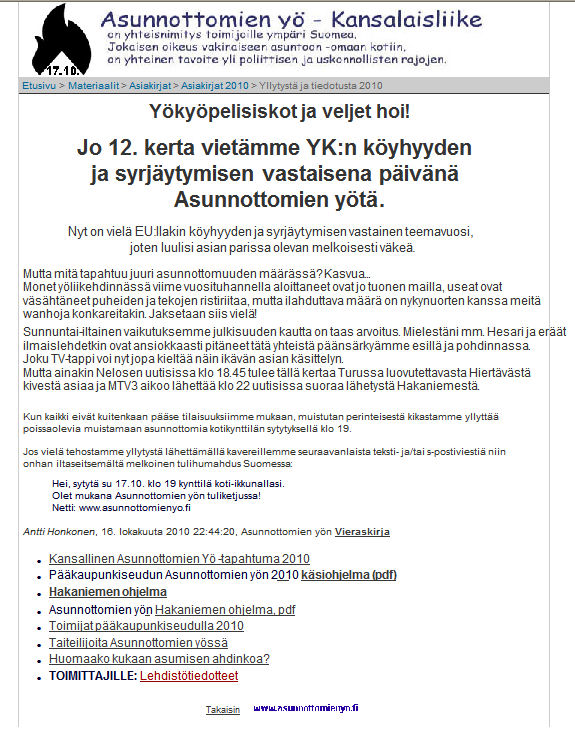Nettisanomat. Arkisto. "Lokakuun 17." 1999- 2011. "Asunnottomien yö".