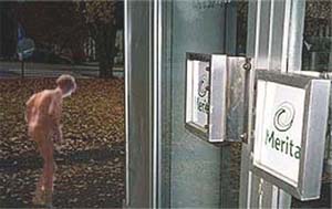 Velallinen kulkemassa riisuttuna pankin oven ohi. Kuva ja käsittely Pertti Manninen. 17.10.2002.