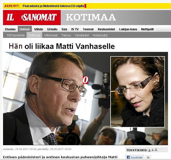 Nettisanomat 2011/10/19 -  "Hän oli liikaa Matti Vanhaselle" IL-Sanomat Kotimaa. - Matti Vanhanen – mies joka halusi olla olla nolla nolla, VSOP - Mies, joka halusi olla asia -Kuva: Asunnottomien yö tuli lopulta esiin kun nuoret tarjoilivat hernerokkaa hiukan viileässä illassa. -  Kuvat. Valoa. Kirkas syyspäivä on vaihtunut illan hämäryyteen kuun ja tähtien valaisemaa yötä kohti.  Pohjois-Savo. Keitele. Nilakka. - In the chaos of Sirte, anti-Gaddafi fighters are killing each other. Guardian - "Valoa kansalle!" Kuvat 1, 2 ja 3. Jyrki Katainen, vakuus, ymmärtämisen vaikeus - Kuva. Rytmi -  Kuva. Kissa ihmettelee ristiriitaisia uutisia samasta lehdestä samasta asiasta samana päivänä. - LAINAUS TALOUSMEDIA-blogista. Vakuushuijaus: - Vakuudet: Mallioppilas Suomi lähettää rahaa Kreikkaan etuajassa! - Kuva. Rasmus-kissa ihmettelee ... - Arkistosta "Syyskuun 6." 1999-2011 -  Kuvapari. "Ventti ja Kymppi" - Ventti 21 M. Syrjälä. Kymppi 10 J. Litmanen. Kuvat: Erika Manninen. - Kuva. Suomi voittaa aina - Neste Oil Rally Finland - Suomen MM-ralli - Jyväskylän MM-ralli. - Kuva. Käden ojennus. Karuselli. - lauantai 15.10.2011 - etusivu - Nettisanomat - Sanomanetti - Blogi: Viikkosanomat.fi - Kuvasanomat - Sanomatori  - Viikkosanomat - Härkää sarvista --- , , , , , , , , , , , , ,  - Matti Vanhanen, mies joka halusi olla, Asunnottomien yö, hernerokka, Katriina, Leena, Noora ja Salla, SDP:n nuoret, Vasemmistonuoret, Jyväskylä