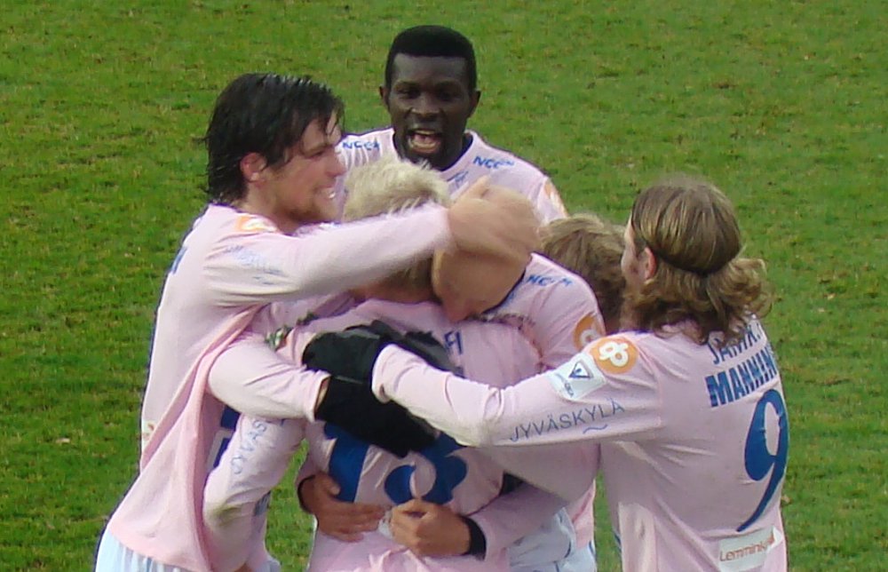 Kuvassa taputellaan Hyyrysen paljasta päätä ja riemuitaan osumasta. Päätä pitempi Bahatunde Wusu muutti  vielä numeroita pelin loppuhetkillä todellisella tahtomaalilla. Kuva. Pertti Manninen.