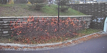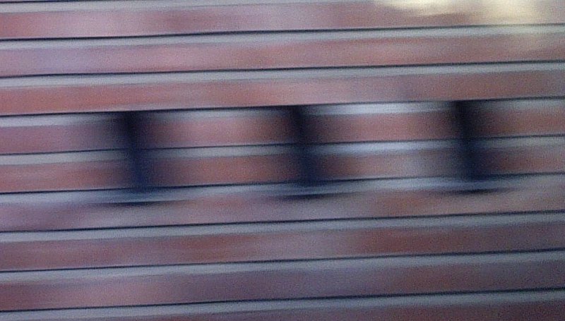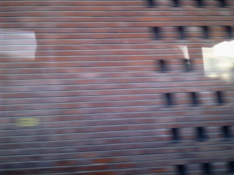 "Tiilenpäät". Kuvassa vilahtaa vanhan hienosti muuratun muuntoaseman seinä bussin ikkunasta kuvattuna. Keski-Suomi. Jyväskylä. Rajakatu. Lauantai 2011-11-29 klo 16:21. Kuva: Pertti Manninen.