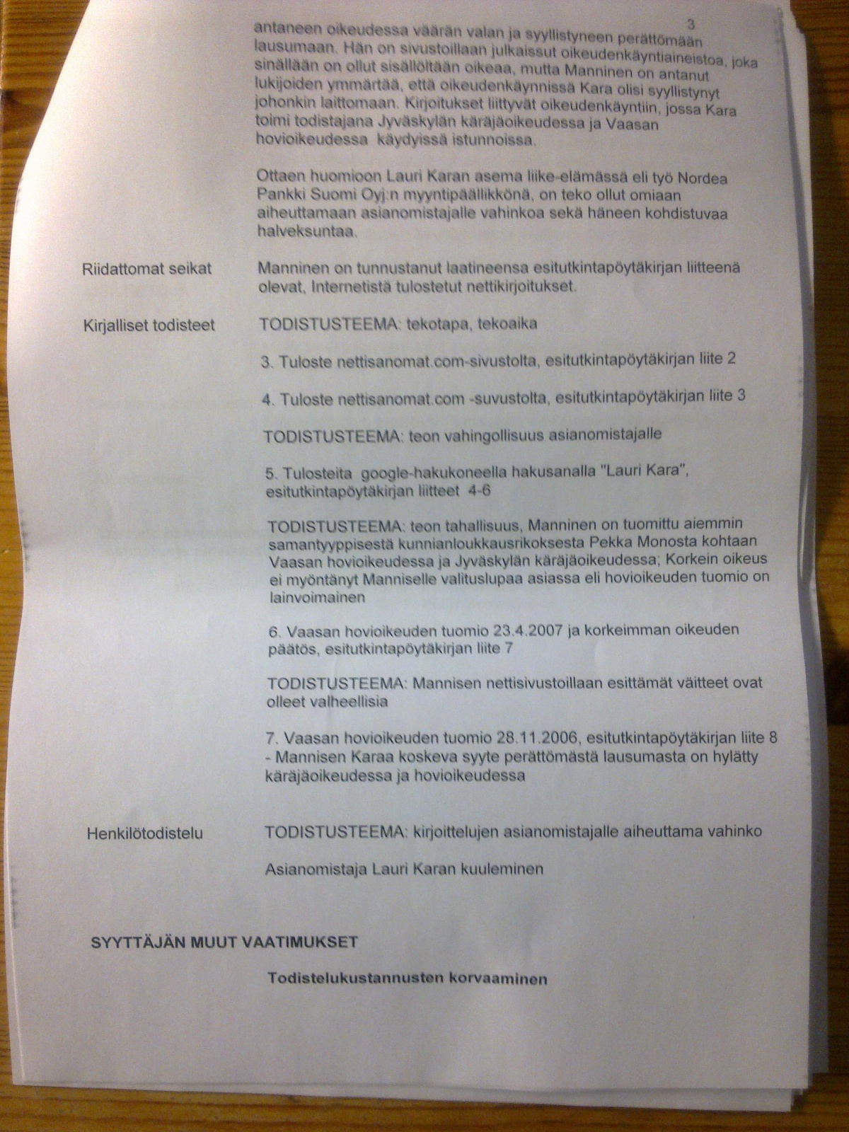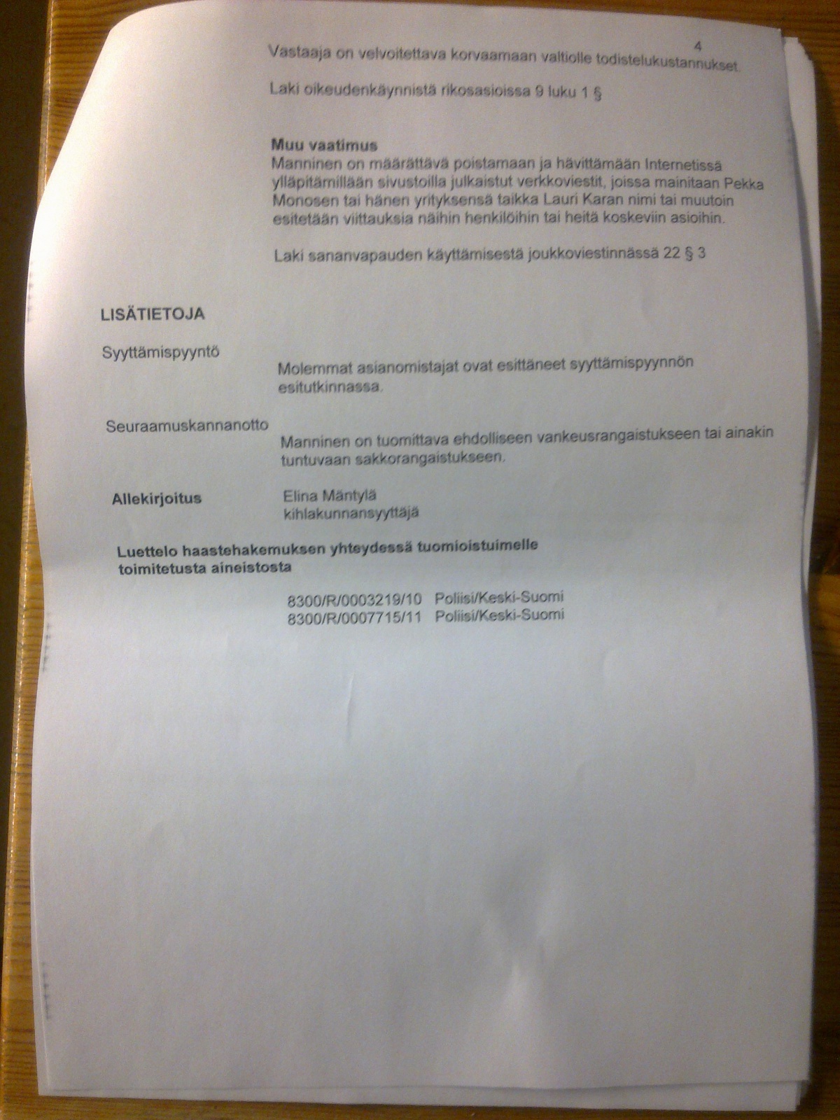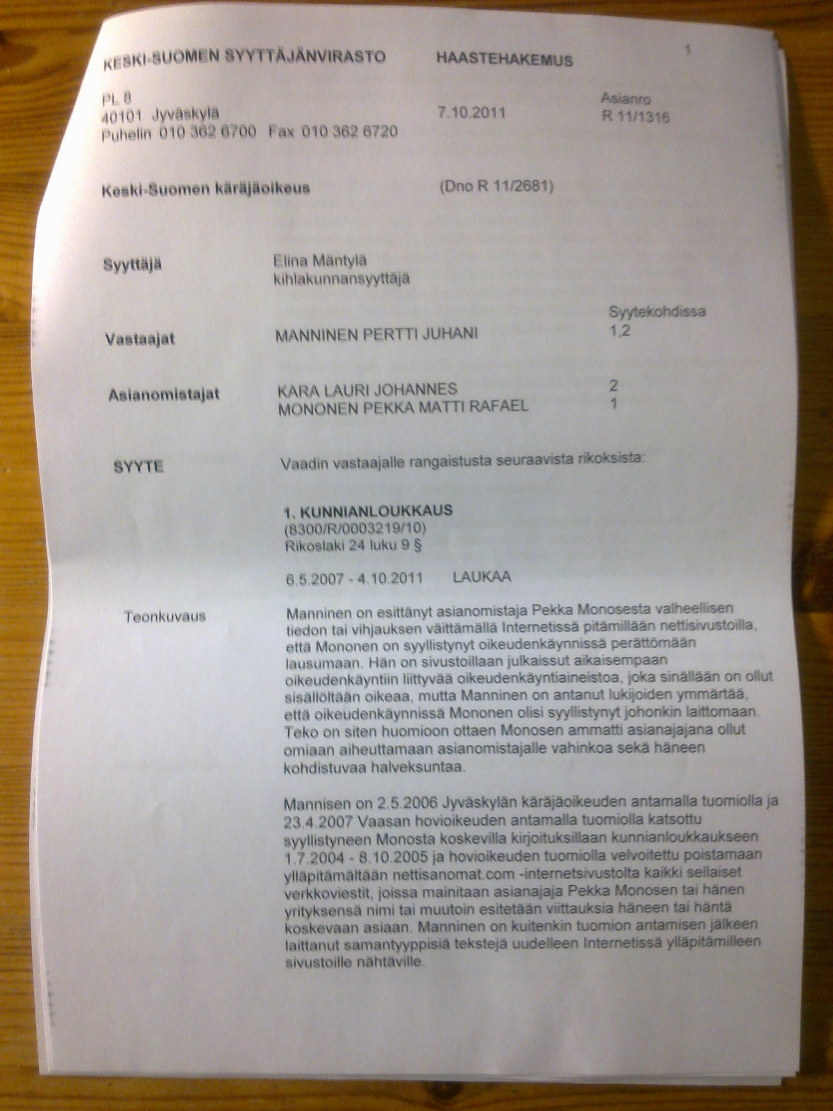 Nettisanomat 2011/10/29 - Haaste. Haastehakemus. Vankeutta vaaditaan. Päätoimittaja Pertti Manninen. Kunnianloukkaus. asianajaja Pekka Mononen. Myyntipäällikkä Lauri Kara. Keski-Suomen käräjäoikeus. Kunnianloukkausrikos - Kuva. Ratkaisu. JJK - IFK Mariehamn -peli - Kuvat. koululaiset saivat vaparit. - Kuva. Valot. Jyväskyä. Harjun kenttä. Ensimmäisen kerran. - Kuva: Asunnottomien yö tuli lopulta esiin kun nuoret tarjoilivat hernerokkaa hiukan viileässä illassa. - Kuva. Kirkas syyspäivä on vaihtunut illan hämäryyteen kuun ja tähtien valaisemaa yötä kohti. Pohjois-Savo. Keitele. Nilakka. - Kuvapari. "Ventti ja Kymppi" - Ventti 21 M. Syrjälä. Kymppi 10 J. Litmanen. Kuvat: Erika Manninen. - Kuva. Suomi voittaa aina - Neste Oil Rally Finland - Suomen MM-ralli - Jyväskylän MM-ralli. - Kuva. Käden ojennus. Karuselli. - lauantai 29.10.2011 - HAASTESIVU - Nettisanomat - Sanomanetti - Blogi: Viikkosanomat.fi - Kuvasanomat - Sanomatori - Viikkosanomat - Härkää sarvista --- Vankeus, sakko, kunnianloukkaus, Pertti Manninen, päätoimittaja, asianajaja, Asianajotoimisto Pekka Mononen, Myyntipäällikkö Lauri Kara, Nordea Pankki, haaste, haastehakemus, syytös, syyttäjä, JJK, IFK Mariehamn, koululaiset, vaparit, ottelu, yleisö, Jyväskylä, Harjun kenttä, valot, valopylväs, |