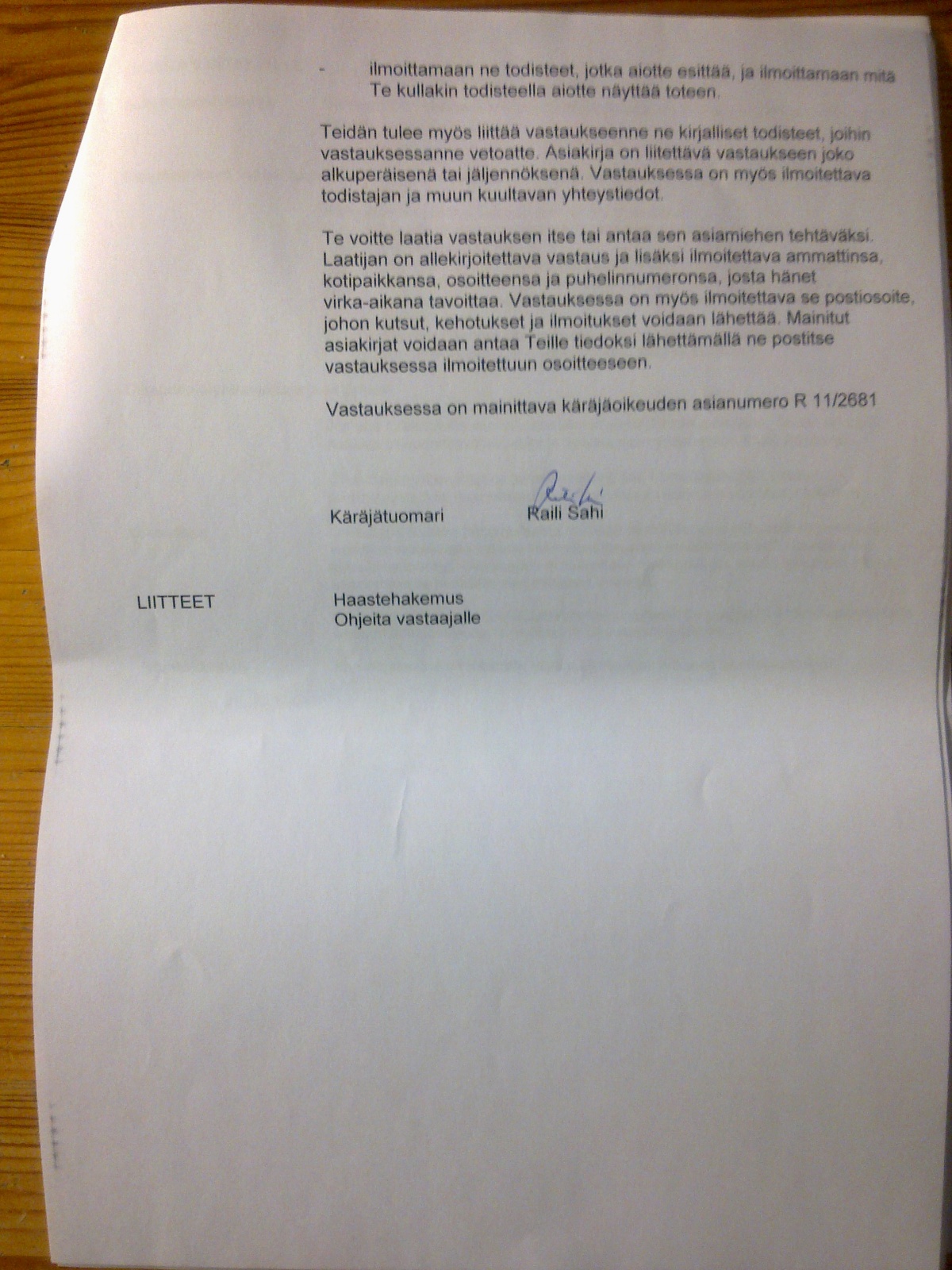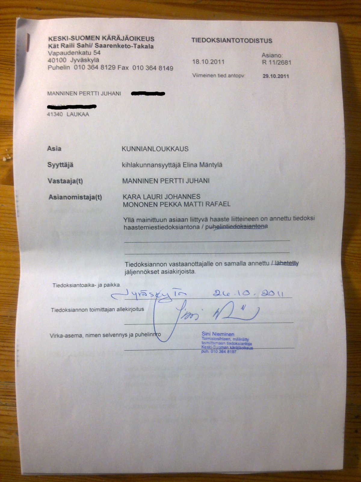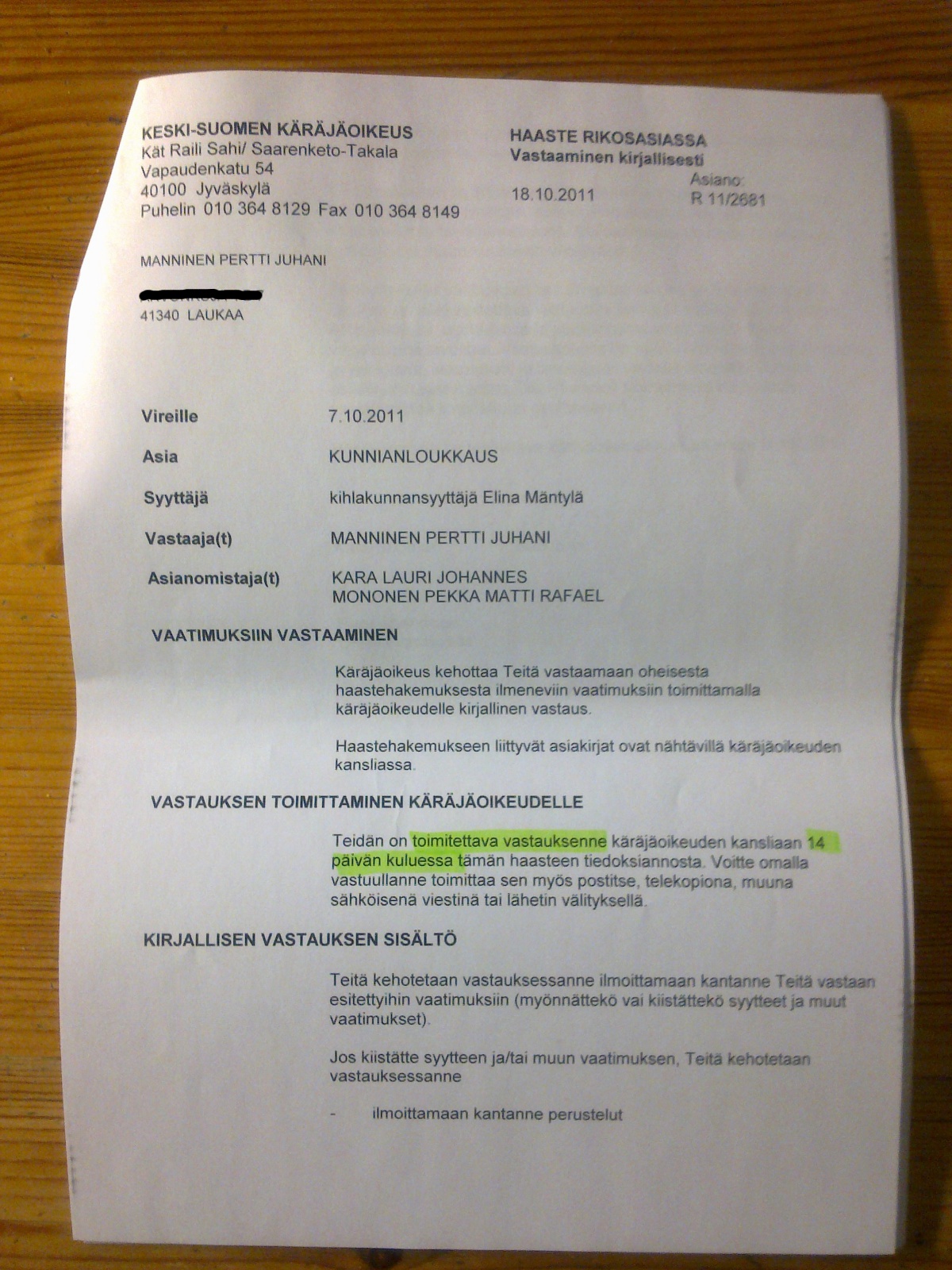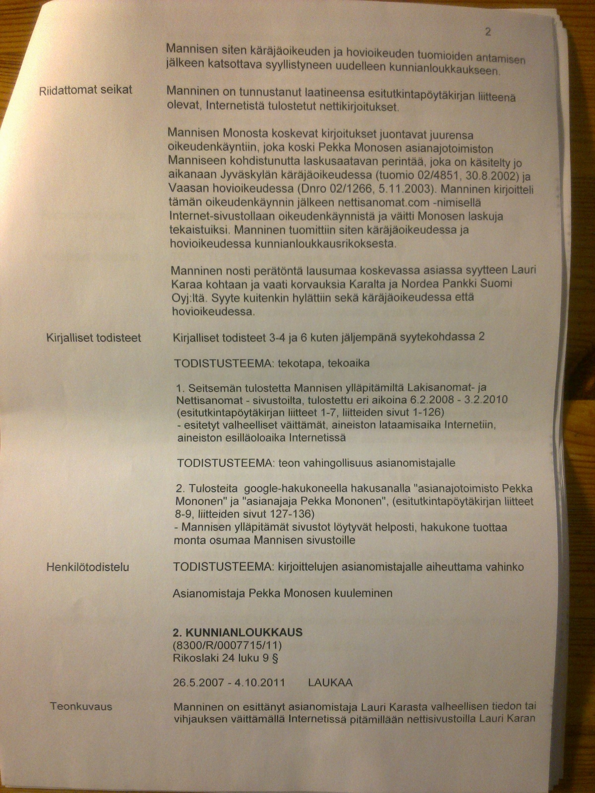 Nettisanomat 2011/10/29 - Haaste. Haastehakemus. Vankeutta vaaditaan. Päätoimittaja Pertti Manninen. Kunnianloukkaus. asianajaja Pekka Mononen. Myyntipäällikkä Lauri Kara. Keski-Suomen käräjäoikeus. Kunnianloukkausrikos - Kuva. Ratkaisu. JJK - IFK Mariehamn -peli - Kuvat. koululaiset saivat vaparit. - Kuva. Valot. Jyväskyä. Harjun kenttä. Ensimmäisen kerran. - Kuva: Asunnottomien yö tuli lopulta esiin kun nuoret tarjoilivat hernerokkaa hiukan viileässä illassa. - Kuva. Kirkas syyspäivä on vaihtunut illan hämäryyteen kuun ja tähtien valaisemaa yötä kohti. Pohjois-Savo. Keitele. Nilakka. - Kuvapari. "Ventti ja Kymppi" - Ventti 21 M. Syrjälä. Kymppi 10 J. Litmanen. Kuvat: Erika Manninen. - Kuva. Suomi voittaa aina - Neste Oil Rally Finland - Suomen MM-ralli - Jyväskylän MM-ralli. - Kuva. Käden ojennus. Karuselli. - lauantai 29.10.2011 - HAASTESIVU - Nettisanomat - Sanomanetti - Blogi: Viikkosanomat.fi - Kuvasanomat - Sanomatori - Viikkosanomat - Härkää sarvista --- Vankeus, sakko, kunnianloukkaus, Pertti Manninen, päätoimittaja, asianajaja, Asianajotoimisto Pekka Mononen, Myyntipäällikkö Lauri Kara, Nordea Pankki, haaste, haastehakemus, syytös, syyttäjä, JJK, IFK Mariehamn, koululaiset, vaparit, ottelu, yleisö, Jyväskylä, Harjun kenttä, valot, valopylväs, |