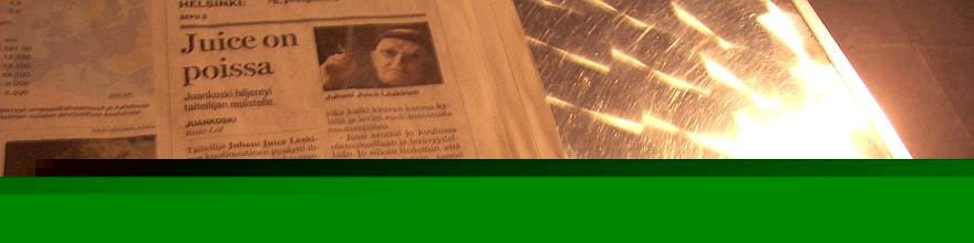 Kuva. "Saanko olla tässä, meitä löytämässä." Matkalta palattua Jyväskylän aseman teräspöydälle unohtunut lehti Keskisuomalainen: "Juice on poissa. Juankoski hiljentyi taiteilijan muistolle. Juhani Juice Leskinen" Kuva: Pertti Manninen sunnuntaina 2006-11-26 klo 21.51.
