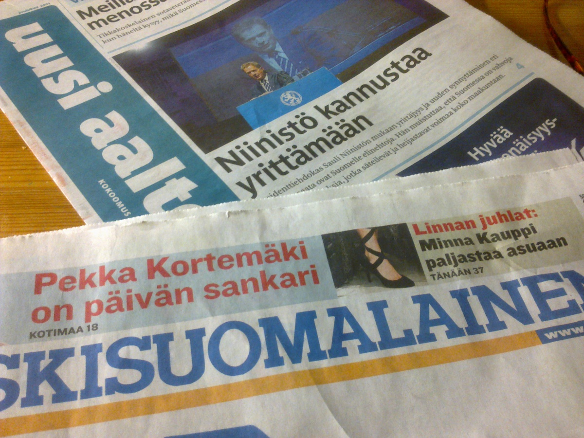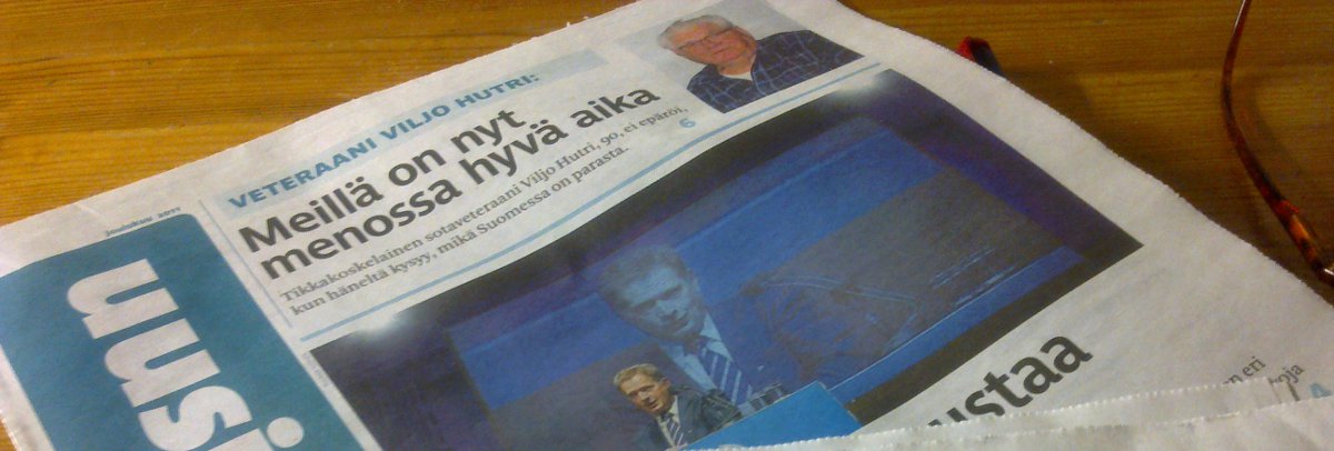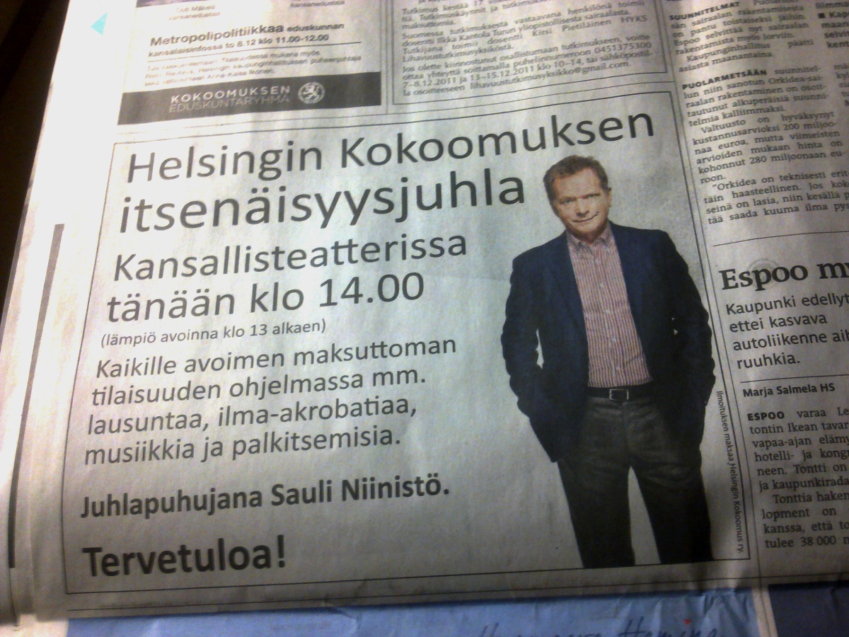 Nettisanomat 2011/12/11 - Kuva. "Spartacus" - Pressa 2012. Ennuste - Arkisto: Suomi ja Irakin sota 2003. - Kävijätilastot lokakuu 2011 - Veteraani Viljo Hutri: Meillä on nyt menossa hyvä aika. Tikkakoskelainen sotaveteraani Viljo Hutri, 90, ei epäröi, kun häneltä kysyy, mikä Suomessa on parasta. Itsenäisyyspäivänä 6. joulukuuta 2011 UUSI AALTO Keskisuomalaisen välissä. Julkaisijana Kokoomus. - Niinistö kannustaa yrittämään. Presidenttiehdokas Sauli Niinistön mukaan yrittäjyys ja uuden synnyttäminen ... Itsenäisyyspäivänä 6. joulukuuta 2011 UUSI AALTO Keskisuomalaisen välissä ensimmäisen kerran ilman ilmoitusliitenimikettä. Julkaisijana Kokoomus. - Itsenäisyyspäivänä 6. joulukuuta 2011 Kokoomuksen ilmoitus Itsenäisyyspäivän johdosta juhlapuhujanaan Sauli Niinistö. Ohjelmassa myös ilma-akrobatiaa. Ilmoituksen maksaa Helsingin kokoomus ry. Helsingin Sanomat tiistaina, Itsenäisyyspäivänä 6. joulukuuta 2011. Kuvat Pertti Manninen tiistaina 2011-12-06 klo 09:17 ja 09:32. - Kuva. Ensilumi - Kuva. Matkalle. Savonlinja. Jyväskylä, Mikkeli, Lappeenranta - Kuva. Kyyhky ja tähti". - Viikkosanomat-blogi. Lokakuu-Marraskuu 2011 -linkit. Lokakuun ennustus. Pressa 2012. - 2011: Iltalehti ohitti HS:n. Kommentti kankeudesta vuodelta 2007 Nettisanomista. - Lukijan kuva: "Katso tuolla on Hakkarainen!" - Kuva. Lahjuksen vastaanottamisesta epäilty ja syytetty Ilkka Kanerva. - Kuvat. "Stoppi päättyi onnellisesti. "- Kuva. Käden ojennus. Karuselli. - sunnuntai 11.12.2011 - etusivu - Nettisanomat - Sanomanetti - Blogi: Viikkosanomat.fi - Kuvasanomat - Sanomatori - Viikkosanomat - Härkää sarvista - Spartacus - Suomi ja Irakin sota 2003 - Haukka - Lipponen - Halonen - Tuomioja - Jäätteenmäki Itsenäisyyspäivä, Uusi aalto, Keskisuomalainen, Helsingin Sanomat, Viljo Hutri, sotaveteraani, Sauli Niinistö, presidenttiehdokas |