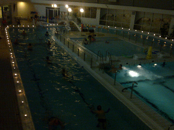 koko allas on ympäröity tuikkukynttilöin, tunnelma on hieno ja muutama