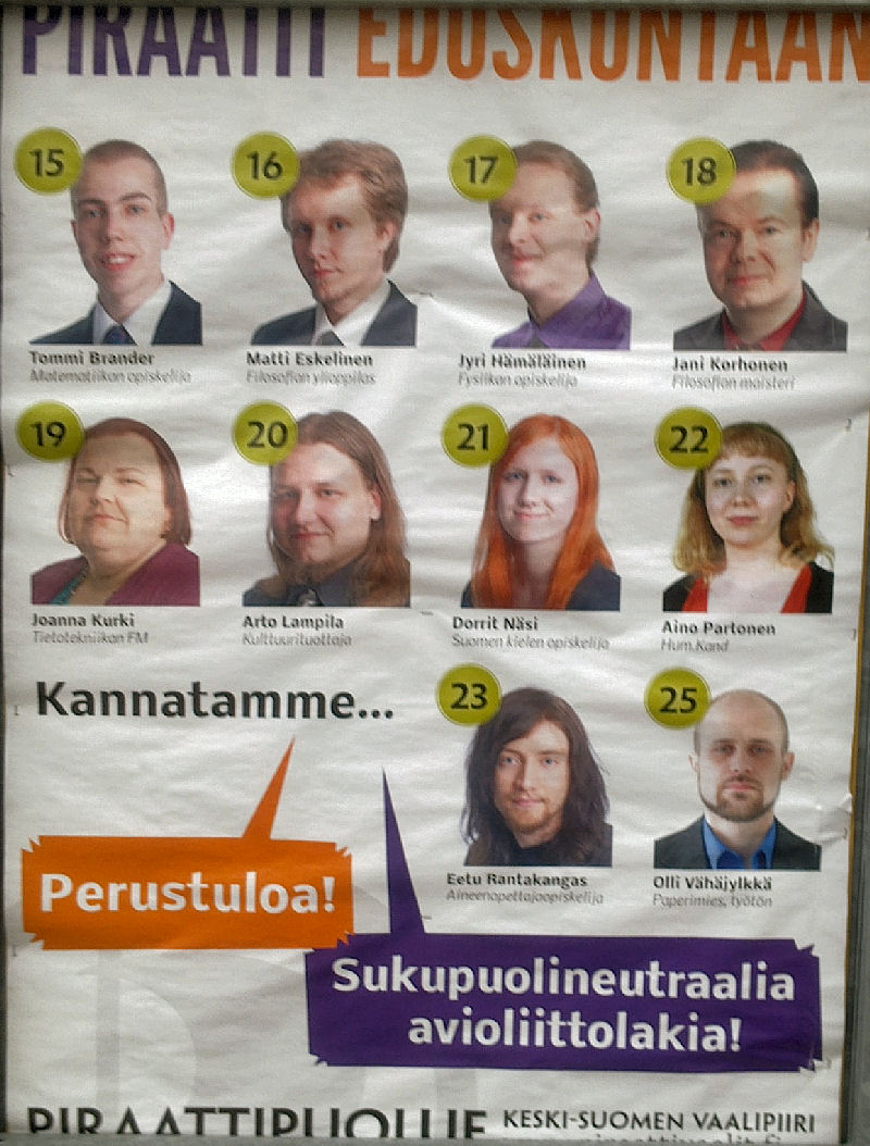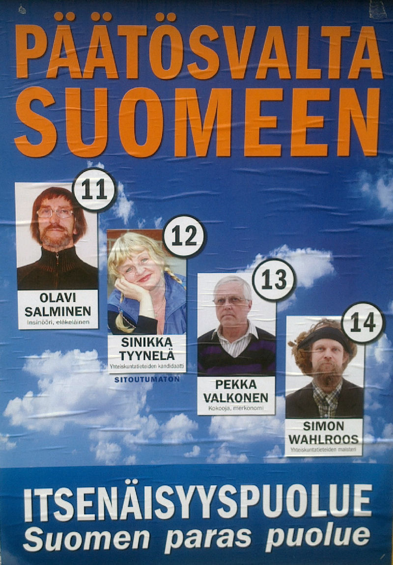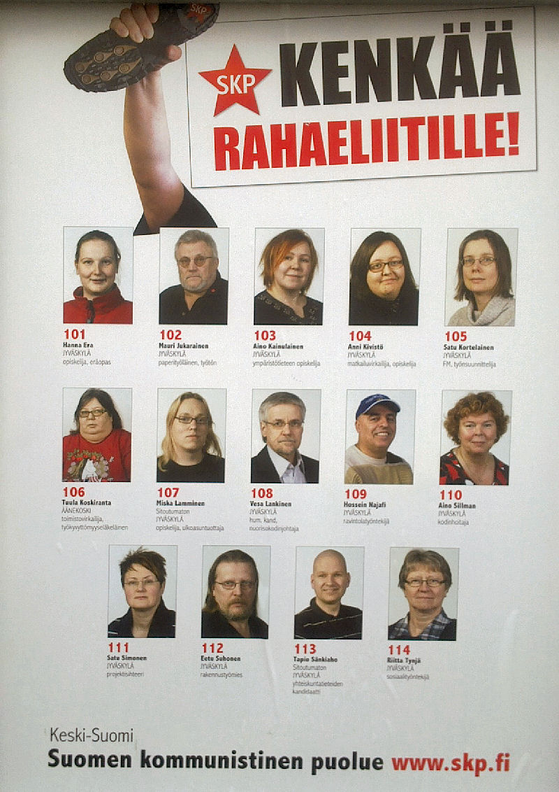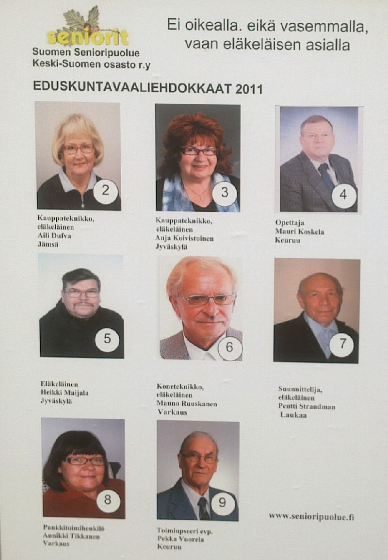 Kommunistinen Työväenpuolue, Hannu Harju - Suomen kommunistinen puolue, Yrjö Hakanen - Suomen Työväenpuolue, Juhani Tanski - Suomen Senioripuolue, Heikki Silván - Köyhien asialla, Terttu Savola - Piraattipuolue, Pasi Palmulehto - Muutos 2011, Jiri Keronen - Itsenäisyyspuolue, Antti Pesonen - Vapauspuolue, Kalevi Helo.