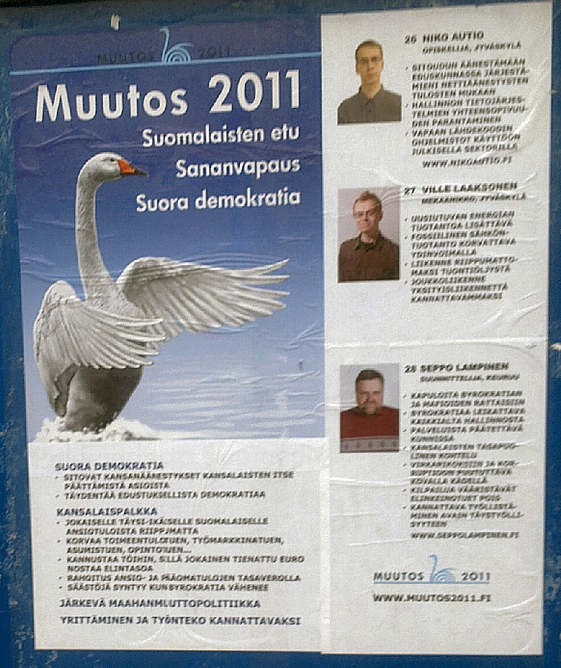 Eduskunnan ulkopuolisten puolueiden vaalijulisteet. Keski-Suomi. Jyväskylä. Vaajakoski. Kirjaston ja liikuntahallin ja urheilukentän kupeessa. Kuvat Pertti Manninen. Torstai 2011-04-07. Arvotussa järjestyksessä. Osalta mainokset puuttuivat, kuten myös eduskuntapuolue RKP:ltä.