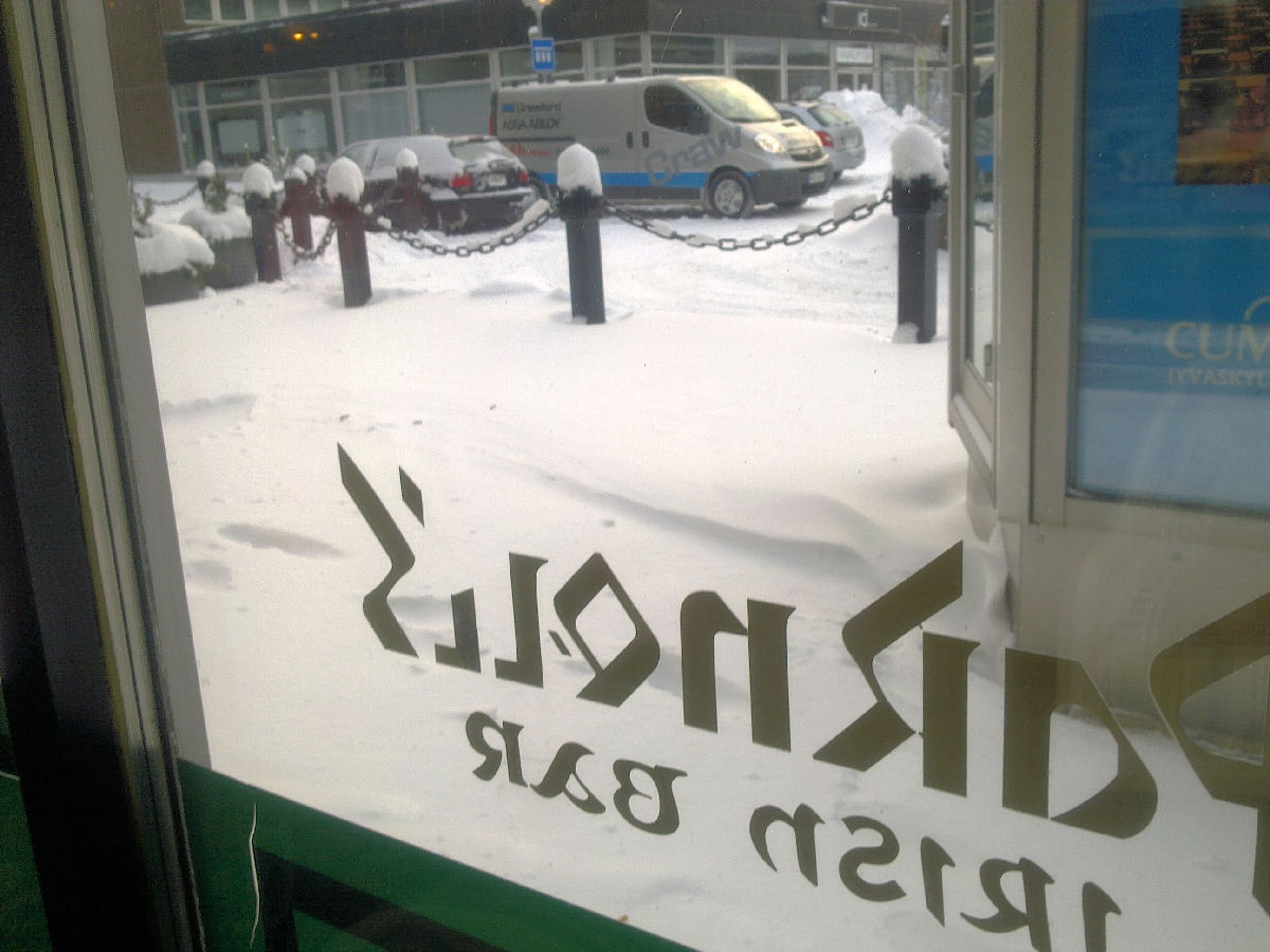 ennen presidentinvaaleja 2012. Kuvia lauantaina 2012-01-14 klo 11-15. Keski-Suomi. Jyväskylä. Tourujoki - Rajakatu - Harjukatu - Paviljonki - Irish Bar - Aalto-sali - Våinönkatu. 1. Tourujoki on jäätynyt. 2. "Liskopatsas", Kari Allonen, ammattikorkeakoulun ja Alvar Aallon suunnitteleman ensimmäisen (?) asuinkerrostalon kupeessa. 3. Kauppamiesten näköispatsas. 4. Harjun kioski on muuttunut kioski "55":ksi koulukompleksin vierellä. 5. Jyväskylän Paviljonki ja korkeutensa saavuttanut Sokos-hotelli. 6. Sisään. 7. Teuvo Hakkarainen hymyilee aulassa keskustelun välistä, pyynnöstä. 8. Rompepäivät vetävät väkeä niin, että on erehtyä sinne. 9. Toimi Kankaanniemikin on saapunut Timo Soinin puhetilaisuuteen. 10. Yleisön joukossa on julkinen Pekka Haaviston, "kakkosen", kannattaja. 11. Pieni kuulija ei innostu Soinin puheesta, jossa tämä mm. kertoo menettäneensä ulkoministerin tai valtiovarainministerin paikan pitäessään kiinni periaatteistaan. 12. Pentti Varkila soittaa huuliharpullaan "Finlandian" tilaisuuden alussa. Soini istuu ja Anitta Kangas seisoo. Paikalla on varmaankin parisataa kuulijaa, kun nonstop-kävijätkin lasketaan mukaan. 13. Paviljongin yläaulassa kahvittelusta tullessa törmää Jaakko Valon vuonna 2006 valmistuneeseen "Kulta-aikaan", vaneri, akryyliväri ja lyöntikulta. 14. Rompetorilta Isä on löytänyt kaipaamansa pakoputken. 15. Irish Barin lämpöisessä tunnelmasssa voi vain muistella, kuinka lämmintä ulkoterassillakin kerran kesällä oli kun siellä nyt talven viima puhaltelee. 16. OHOH- ILTASANOMAT repäisee ainakin kunnon otsikot, kun se taas kiihdyksissään unohtaa "tutkimuksen" virhemarginaalit! 17. Paavo Lipposen vaalimainokset lumessa Aalto-saliin houkuttelemassa. 18. "On the Sunny Side of the Street" vain soluu taitureiden esittämänä, pianisti Marian Petrescu ja basisti Mihai Petrescu. Sali on täynnä, ylhäällä parvella on kyllä hyvin tilaa myöhästyneellekin. 19. Puolueen puheenjohtaja, valtiovarainministeri Jutta Urpilainen kehuu Paavo Lipposta ja muistuttaa kuinka gallupit nujerrettiin viime eduskuntavaaleissa. "Tasavallan presidentin virka ei ole mikään ulkosuhteiden harjoittelupaikka". 20. Kahvia tarjoilemassa ihan samannäköinen nuori nainen, joka Asunnottomien yön iltatunneilla tarjoili hernekeittoa ulkona Kompassin nurkilla viime syksynä. 21. Kahvijonot. 22. Rompetorilta tai sitten muualta tullut sivuvaunuilija pyörähtää Väinönkadulla. 23. Pieni koira näkee toisen pienen koiran kadun aurinkoisella puolella. 24. Söpöliinille on laitettu töppöset jalkaan tässä kahdeksan asteen pakkasessa, joka tuntuu kovin kylmältä viimaisina hetkinä. - Mobikuvat: Pertti Manninen. Isonna! |