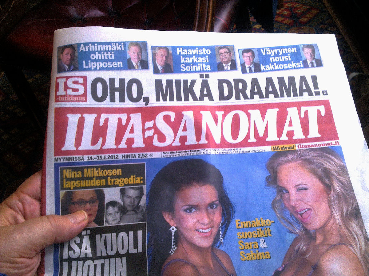 Nettisanomat 2012/01/14 - Vaaleja, OHOH - Ilta-Sanomat. Kuvia lauantaina 2012-01-14 klo 11-15. Keski-Suomi. Jyväskylä. Tourujoki - Rajakatu - Harjukatu - Paviljonki - Irish Bar - Aalto-sali - Våinönkatu. 1. Tourujoki on jäätynyt. 2. "Liskopatsas", Kari Allonen, ammattikorkeakoulun jaAlvar Aallon suunnitteleman ensimmäisen (?) asuinkerrostalon kupeessa. 3. Kauppamiesten näköispatsas. 4. Harjun kioski on muuttunut kioski "55":ksi koulukompleksin vierellä. 5. Jyväskylän Paviljonki ja korkeutensa saavuttanut Sokos-hotelli. 6. Sisään.7. Teuvo Hakkarainen hymyilee aulassa keskustelun välistä, pyynnöstä. 8. Rompepäivät vetävät väkeä niin, että on erehtyä sinne. 9. Toimi Kankaanniemikin on saapunut Timo Soinin puhetilaisuuteen. 10. Yleisön joukossa on julkinen Pekka Haaviston, "kakkosen", kannattaja. 11. Pieni kuulija ei innostu Soinin puheesta, jossa tämä mm. kertoo menettäneensä ulkoministerin tai valtiovarainministerin paikan pitäessään kiinni periaatteistaan. 12. Pentti Varkila soittaa huuliharpullaan "Finlandian" tilaisuuden alussa. Soini istuu ja Anitta Kangas seisoo. Paikalla on varmaankin parisataa kuulijaa, kun nonstop-kävijätkin lasketaan mukaan. 13. Paviljongin yläaulassa kahvittelusta tullessa törmää Jaakko Valon vuonna 2006 valmistuneeseen "Kulta-aikaan", vaneri, akryyliväri ja lyöntikulta.14. Rompetorilta Isä on löytänyt kaipaamansa pakoputken. 15. Irish Barin lämpöisessä tunnelmasssa voi vain muistella, kuinka lämmintä ulkoterassillakin kerran kesällä oli kun siellä nyt talven viima puhaltelee. 16. OHOH- ILTASANOMAT repäisee ainakin kunnon otsikot, kun se taas kiihdyksissään unohtaa "tutkimuksen" virhemarginaalit! 17. Paavo Lipposen vaalimainokset lumessa Aalto-saliin houkuttelemassa. 18. "On the Sunny Side of the Street" vain soluu taitureiden esittämänä, pianisti Marian Petrescu ja basisti Mihai Petrescu. Sali on täynnä, ylhäällä parvella on kyllä hyvin tilaa myöhästyneellekin. 19. Puolueen puheenjohtaja, valtiovarainministeri Jutta Urpilainen kehuu Paavo Lipposta ja muistuttaa kuinka gallupit nujerrettiin viime eduskuntavaaleissa. "Tasavallan presidentin virka ei ole mikään ulkosuhteiden harjoittelupaikka". 20. Kahvia tarjoilemassa ihan samannäköinen nuori nainen, joka Asunnottomien yön iltatunneilla tarjoili hernekeittoa ulkona Kompassin nurkilla viime syksynä. 21. Kahvijonot. 22. Rompetorilta tai sitten muualta tullut sivuvaunuilija pyörähtää Väinönkadulla. 23. Pieni koira näkee toisen pienen koiran kadun aurinkoisella puolella. 24. Söpöliinille on laitettu töppöset jalkaan tässä kahdeksan asteen pakkasessa, joka tuntuu kovin kylmältä viimaisina hetkinä. - Mobikuvat: Pertti Manninen. - TOP 20 Joulukuu 2011 - Presidentinvaalit 2012 - Julisteet tänään katukuvassa. Kuva: " 2, 3, 4, 5, 6, 7 tai joku muu". - Kuvat. "01.01.2012". - "The Jazzman" Kuva. - "Kiven hehku". Kari Alonen 2010. -- Lukijan kuva: "Katso tuolla on Hakkarainen!" - Kuva. Käden ojennus. Karuselli. - lauantai 14.01.2012 - kuvasivu - Nettisanomat - Sanomanetti - Blogi: Viikkosanomat.fi - Kuvasanomat - Sanomatori - Viikkosanomat - Härkää sarvista |