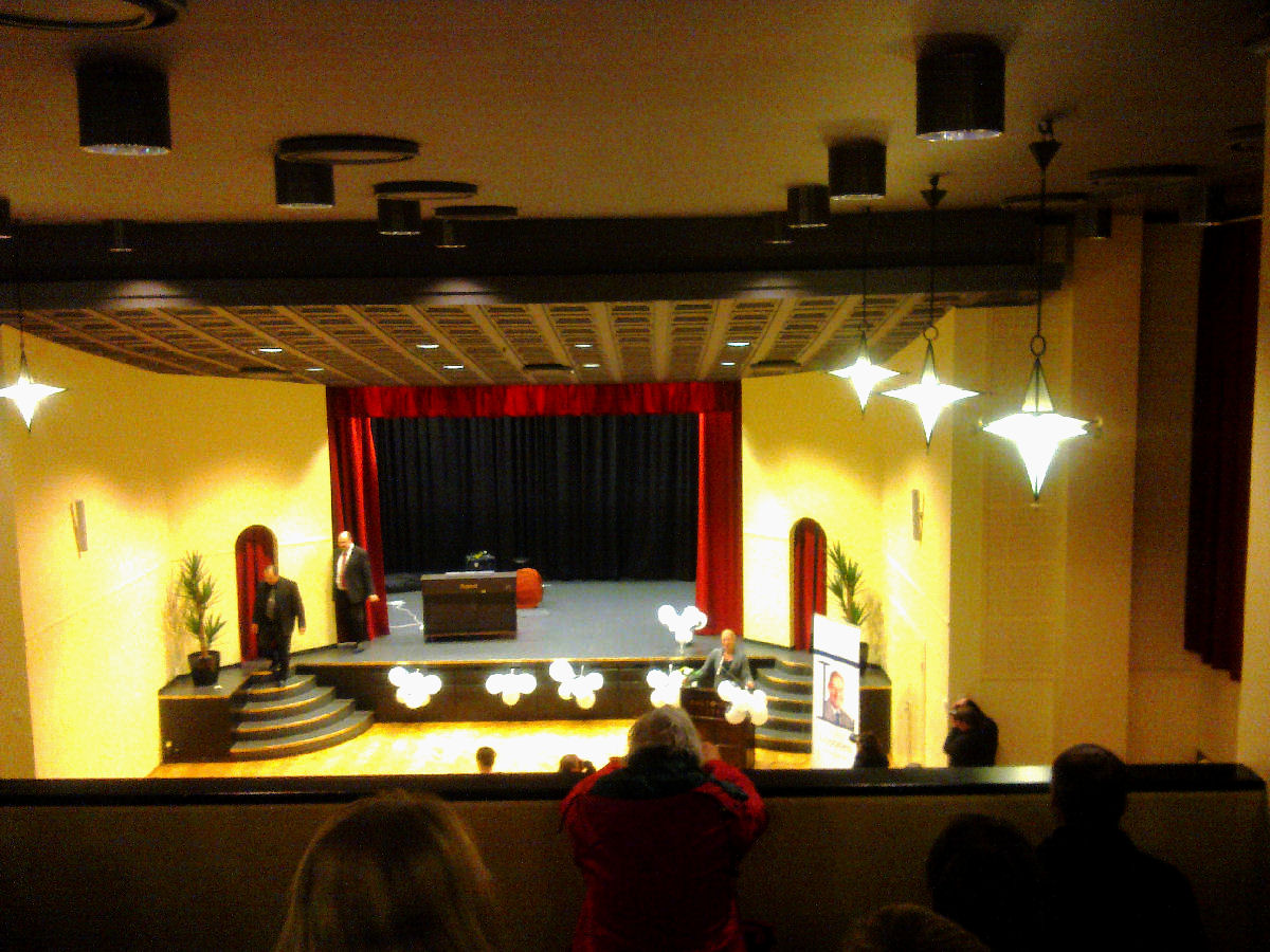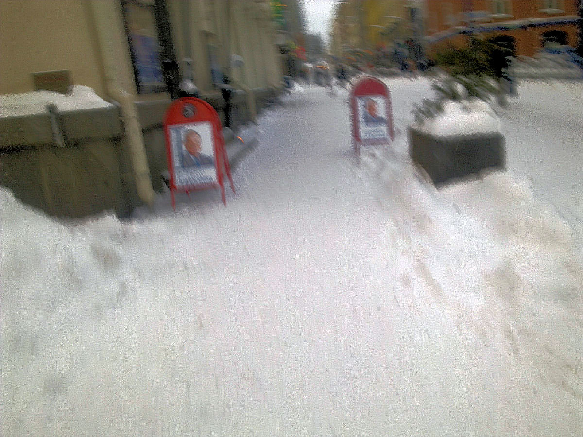 ennen presidentinvaaleja 2012. Kuvia lauantaina 2012-01-14 klo 11-15. Keski-Suomi. Jyväskylä. Tourujoki - Rajakatu - Harjukatu - Paviljonki - Irish Bar - Aalto-sali - Våinönkatu. 1. Tourujoki on jäätynyt. 2. "Liskopatsas", Kari Allonen, ammattikorkeakoulun ja Alvar Aallon suunnitteleman ensimmäisen (?) asuinkerrostalon kupeessa. 3. Kauppamiesten näköispatsas. 4. Harjun kioski on muuttunut kioski "55":ksi koulukompleksin vierellä. 5. Jyväskylän Paviljonki ja korkeutensa saavuttanut Sokos-hotelli. 6. Sisään. 7. Teuvo Hakkarainen hymyilee aulassa keskustelun välistä, pyynnöstä. 8. Rompepäivät vetävät väkeä niin, että on erehtyä sinne. 9. Toimi Kankaanniemikin on saapunut Timo Soinin puhetilaisuuteen. 10. Yleisön joukossa on julkinen Pekka Haaviston, "kakkosen", kannattaja. 11. Pieni kuulija ei innostu Soinin puheesta, jossa tämä mm. kertoo menettäneensä ulkoministerin tai valtiovarainministerin paikan pitäessään kiinni periaatteistaan. 12. Pentti Varkila soittaa huuliharpullaan "Finlandian" tilaisuuden alussa. Soini istuu ja Anitta Kangas seisoo. Paikalla on varmaankin parisataa kuulijaa, kun nonstop-kävijätkin lasketaan mukaan. 13. Paviljongin yläaulassa kahvittelusta tullessa törmää Jaakko Valon vuonna 2006 valmistuneeseen "Kulta-aikaan", vaneri, akryyliväri ja lyöntikulta. 14. Rompetorilta Isä on löytänyt kaipaamansa pakoputken. 15. Irish Barin lämpöisessä tunnelmasssa voi vain muistella, kuinka lämmintä ulkoterassillakin kerran kesällä oli kun siellä nyt talven viima puhaltelee. 16. OHOH- ILTASANOMAT repäisee ainakin kunnon otsikot, kun se taas kiihdyksissään unohtaa "tutkimuksen" virhemarginaalit! 17. Paavo Lipposen vaalimainokset lumessa Aalto-saliin houkuttelemassa. 18. "On the Sunny Side of the Street" vain soluu taitureiden esittämänä, pianisti Marian Petrescu ja basisti Mihai Petrescu. Sali on täynnä, ylhäällä parvella on kyllä hyvin tilaa myöhästyneellekin. 19. Puolueen puheenjohtaja, valtiovarainministeri Jutta Urpilainen kehuu Paavo Lipposta ja muistuttaa kuinka gallupit nujerrettiin viime eduskuntavaaleissa. "Tasavallan presidentin virka ei ole mikään ulkosuhteiden harjoittelupaikka". 20. Kahvia tarjoilemassa ihan samannäköinen nuori nainen, joka Asunnottomien yön iltatunneilla tarjoili hernekeittoa ulkona Kompassin nurkilla viime syksynä. 21. Kahvijonot. 22. Rompetorilta tai sitten muualta tullut sivuvaunuilija pyörähtää Väinönkadulla. 23. Pieni koira näkee toisen pienen koiran kadun aurinkoisella puolella. 24. Söpöliinille on laitettu töppöset jalkaan tässä kahdeksan asteen pakkasessa, joka tuntuu kovin kylmältä viimaisina hetkinä. - Mobikuvat: Pertti Manninen. Isonna! |