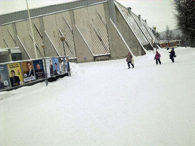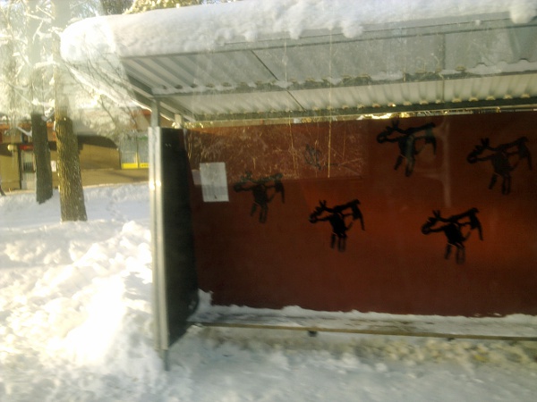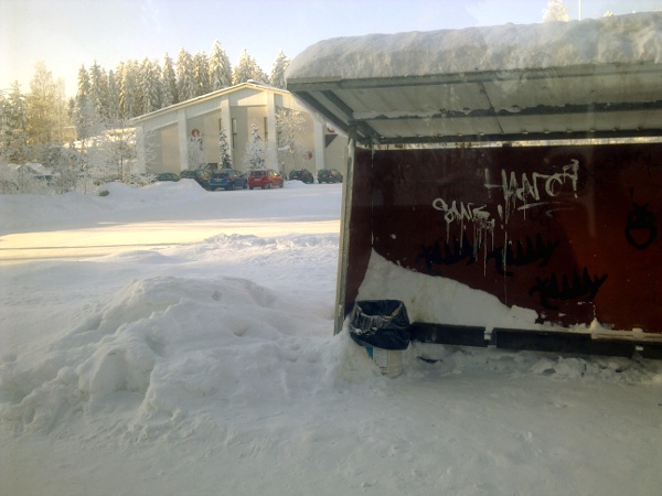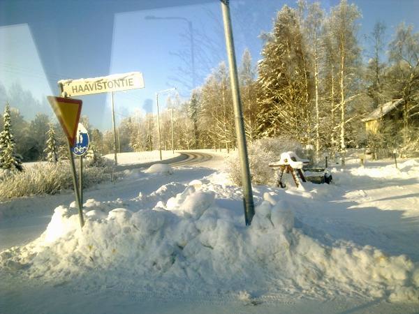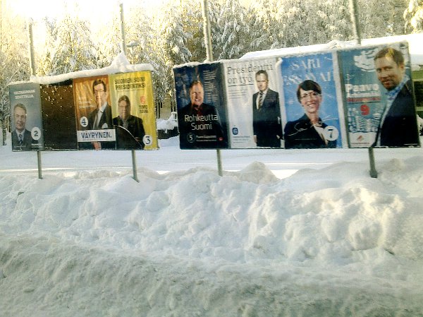 Keski-Suomi. Jyväskylän seutu. Laukaa. Vihtavuori. Haavistontie (Kulkusuunnassa oikea puoli). Mobikuvat: Pertti Manninen perjantaina 2012-02-03 klo 11.22.20 - 11.28.12. Kuva presidenttiehdokkaista Leppävedeltä 10 minuuttia myöhemmin sijoitettuna siihen kohtaan, jossa ehdokasrivi oli Vihtavuoressa.