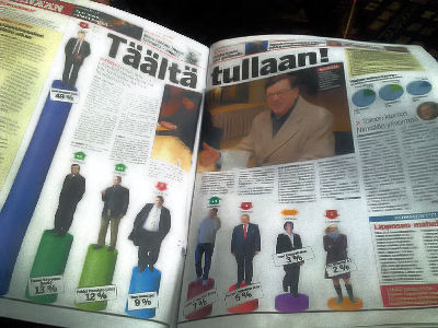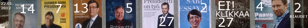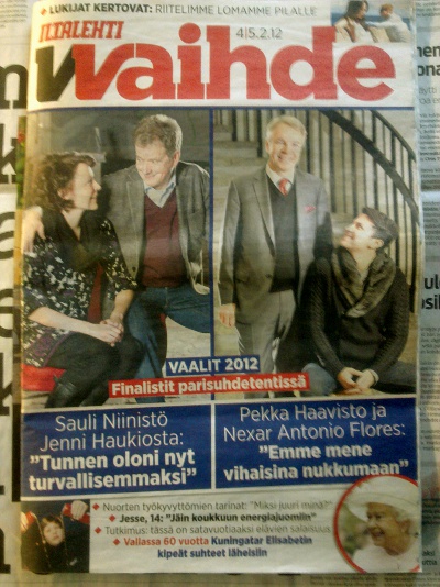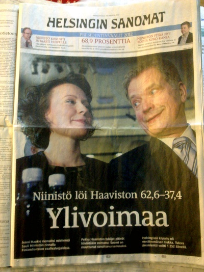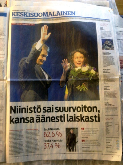 Nettisanomat 2012/02/13 - Yle saamelaisten kansallispäivänä. Osa 7. Oddasat. Suomen uudeksi presidentiksi on valittu kokoomuksen Sauli Niinistö. - Yle saamelaisten kansallispäivänä. Osa 4. Oddasat. - "Nyt on saamelaisten syntymäpäivä." Kuva -  Osa 3.    Osa 2. Oddasat. - Dragsvikista keskustellaan jo bussissakin Keski-Suomessa. Helmikuu 9, 2012. - Yle saamelaisten kansallispäivänä: Apinatkin maininnanarvoisia, saamelaiset ei. - Niinistö sai 43 prosentin kannatuksen koko maassa. Koko kansan presidentti? - Tutkimusjohtaja Rahkonen sekoilee.  Gallup. Taloustutkimus. Ennusti muka niinistön voiton jo vuosia sitten! - TOP 20 - Tammikuu 2011 - Nettisanomat/ Sanomanetti-sivustot. Eri kävijät. - Presidentivaalit 2012 - Kuvia - Tulos: Ääniosuudet ja äänimäärät pyöristettyinä: Niinistö 43 8 (1. 8 miljoonaa), EI 31 (1.3 miljoonaa), Haavisto 26 (1.1 miljoonaa) - Kuvia sunnuntaina 2012-02-05: FIN - Niinistö - Haavisto. Kuvia maanantaina 2012-02-06: Finalistit parisuhdetentissä (Iltalehti 4.2.2012) - Niinistö löi Haaviston Ylivoimaa (HS) - Niinistö sai suurvoiton, kansa äänesti laiskasti (Keskisuomalainen) - Suomisen Olli rakastuu (Orvo Saarikivi 1944 Yle 1:ssä): "On se hirveän paljon Ollia vanhempi, ainakin seitsemän vuotta - Älä välitä, elämä on joskus niin kenkkua. - Rakkaus, tiedätkö, on episodi miehen elämässä, joka rikastuttaa sitä. -  Riittääkö roihu tällä kertaa? Arkistokuva 2006. - 1. kierroksen tulos suhteutettuna äänioikeutettuihin:  Ei äänestänyt 27, Niinistö 27, Haavisto 14, Väyrynen 13, Soini 7, Lipponen 5, Arhinmäki 4, Biaudet 2 ja Essayah 2. Presidentinvaalit 2012.  - Kuva. Isonenä. -   Kuvat. "01.01.2012". -- "Kiven hehku". Kari Alonen 2010. -- Lukijan kuva: "Katso tuolla on Hakkarainen!" - Kuva. Käden ojennus. Karuselli. - maanantai  13.02.2012 - etusivu - Nettisanomat - Sanomanetti - Blogi: Viikkosanomat.fi - Kuvasanomat - Sanomatori  - Viikkosanomat - Härkää sarvista  -