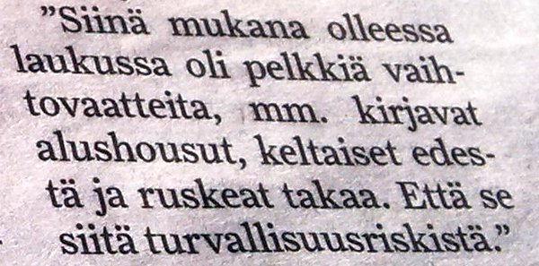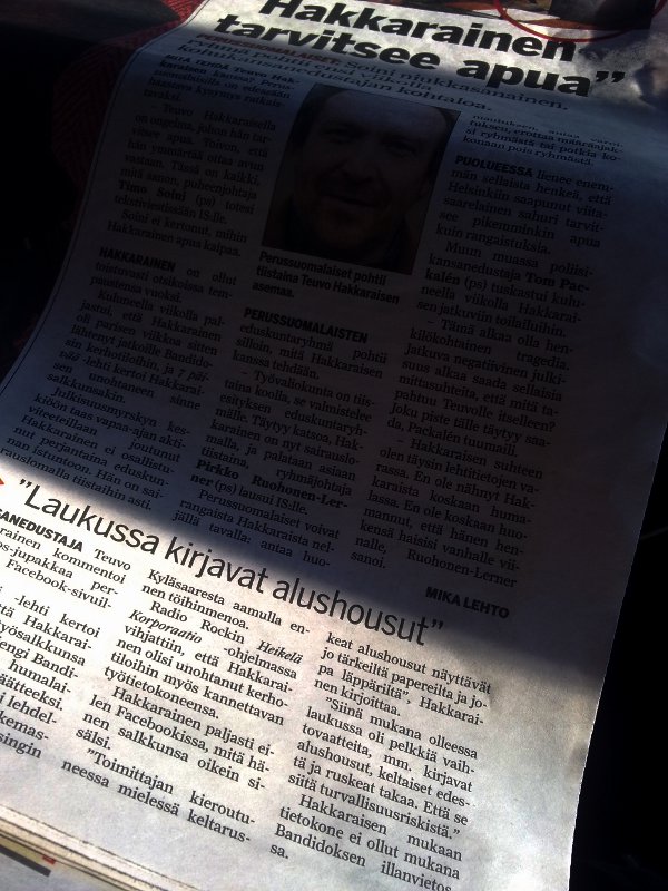 Maanantai 2012-03-05"Harrastakaa!"Keski-Suomi. Jyväskylä, Vaajakoski. Mobikuva Pertti Manninen torstaina 2012-02-16 15:32.Hakkarainen, kalsarit ja Ilta-Sanomat.ILTA-SANOMAT ON SAANUT TIEDON KANSANEDUSTAJA TEUVO HAKKARAISEN KALSAREISTA.NE OVAT EDESTÄ KELTAISET JA TAKAA RUSKEAT ...Lue lisää! |