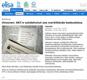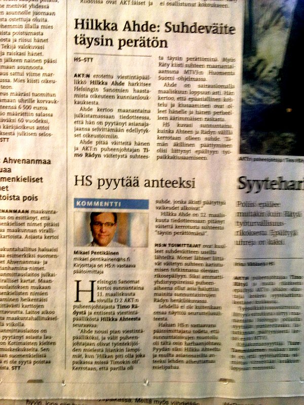 Viikkosanomat-blogi NETISSÄ PYYSI ANTEEKSI ALLEKIRJOITUKSIN JA PÄIVÄYKSIN. TÄNÄÄN PAPERILEHDESSÄ ANTEEKSIPYYNTÖ OLI MUUTTUNUT KOMMENTIKSI, JOSSA KYLLÄ PYYDETTIIN ANTEEKSI. TÄSSÄ ON VISSI ERO JA VALTAKUNNAN SUURIMMAN LEHDEN RYHTYMINEN PILLUPOLIISIKSI ON KYLLÄ AIKA HÄPEÄLLISTÄ. VASTAAVA PÄÄTOIMITTAJA ON SIIS MIKAEL PENTIKÄINEN. KOMMENTAATTORI? VIIKKOSANOMAT. PERTTI MANNINEN 2012 03 13 N 14 00 (Painovirheitä korjattu. Nettisanomat) Viikkosanomat-blogi Julkisen sanan neuvoston puheenjohtaja Risto Uimonen nuoleslelee Helsingin Sanomia, joka raukkamaisesti kertoo ns. anteeksipyynnössään, että kirjoitus perustuikin huhuihin. Tätä lehti ei tuonut esille alkuperäisessä kirjoituksessaan, vaan kyllä siitä sai sellaisen käsityksen, että lehdellä oli joku tieto asiasta ja joku, joka oli kertonut asiasta, jonka lähteen alkuperää ei sitten kuitenkaan tarvitsisi lähdesuojaan vedoten kertoa edes oikeudessa. Lehdellä menikin pupu pöksyyn ja suunnitellusti väitettiin härskisti, että mitään tietoa tai siis henkilöä ei lehdellä olekaan tiedossaan, joten ei tarvitse mitään kertoa sitten oikeudessa, jos sellainen juttu tulisi vastaan. Julkisen sanan neuvoston puheenjohtajan lause on sitten kuvottava, jota tässä kyllä härskisti on käännetty kansankielelle. Vaikka väite olisi tosikin, niin silti se olisi kunniaa loukkaava, tai ainakin voisi olla, koska se on törkeä solvaus ja sen ymppääminen tähän kiusaamisjuttuun ei ole muuta kuin sensaation nälkää. Tässä nälässä poljetaan sitten ihmisiä laskelmoidusti. Tässä ohessa on kuva siitä jutusta ja sen yksi silmiinpistävämpi lause oli tekstin joukkoon muina miehinä saatu ympättyä niin näkyvästi, että sen varmasti huomasi. Täysin tarkoituksellinen ja tahallinen esitystapa. Lehden päätoimittaja Mikael Pentikäinen luistelee nyt huhupuheiden taakse ja julkaisee jopa anteeksipyynnön kommenttina tänään paperilehdessä! Viikkosanomat. Pertti Manninen. Keskiviikko 2012-03-14 00:57. Elisa Uimonen: AKT:n suhdehuhut osa merkittävää keskustelua Julkisen sanan neuvoston puheenjohtaja Risto Uimonen ei tyrmää yksiselitteisesti sitä, että huhut AKT:n Timo Rädyn ja Hilkka Ahteen suhteesta kerrottiin julkisuuteen. Uimosen mukaan suhdehuhut liittyivät yhteiskunnallisesti merkittävään keskusteluun, jonka yhteydessä huhujenkin kertominen voi periaatteessa olla hyväksyttävää. Olisi kuitenkin suotavaa kertoa yleisölle myös, miten tiedot on varmistettu. Helsingin Sanomat mainitsi sunnuntaina jutussaan suhdehuhut. Eilen lehden vastaava päätoimittaja pyysi anteeksi sitä, ettei lehti kertonut selvemmin, ettei tiedolle ole vahvistusta. Sekä Ahde että Räty ovat kiistäneet jyrkästi huhut seurustelusuhteesta. Ahde on kertonut harkitsevansa Helsingin Sanomien haastamista oikeuteen kunnianloukkauksesta. STT ei ole tavoittanut Ahteen asianajajaa kertomaan, tyytyykö Ahde anteeksipyyntöön. STT Kuvateksti: Helsingin Sanomien vastaava päätoimittaja pyysi eilen anteeksi, että lehti oli julkaissut huhuihin perustuvaa tietoa Hilkka Ahteen ja Timo Rädyn välisestä suhteesta. Kuva: Lehtikuva / Jussi Nukari KOMMENTTI: Sama Tags: anteeksipyyntö, Helsingin Sanomat, Hilkka Ahde, HS, mikael pentikäinen, pillupoliisi, Risto Uimonen, suhde, Timo Räty http://viikkosanomat.fi/2012/03/14/pillupoliisina-toimiminen-on/ |