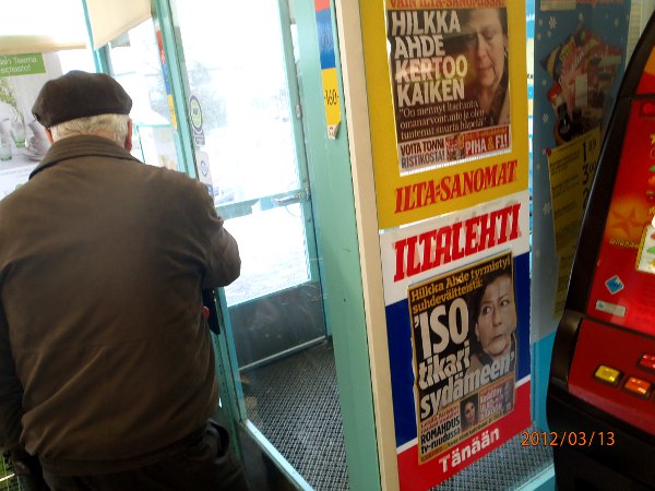Nettisanomat 2012/03/21 - Kuva. Pysäkki 3. - Tänään keskiviikkona 2012-03-21 on Rasismin vastainen päivä. Edellisellä viikolla Keskisuomalainen kertoi opintotuen epäkohdista. Jyväskylän yliopiston professori Jaakko Pehkonen selosti suomalaista arkipäivän rasismia sen hyväksyen. Suora lainaus: "Pehkosen mukaan ehdollinen tukimalli ei muuttaisi koulutukseen hakeutumista, sillä korkeakouluopiskelijat tulevat jo nyt pääsääntöisesti koulutetuista kodeista. - Korkeakoulutettujen vanhempien lapsilla on jo nyt noin viisi kertaa suurempi todennäköisyys opiskella korkeakoulussa kuin nuorilla joiden vanhemmilla on keskikoulutausta." Kuva. "Venus ja Jupiter sunnuntaina 2012-03-18 20:30." - Arkisto 2000-2002. - Kuva. "Venus ja Jupiter tiistaina 2012-03-13 19:06." - "Iso tikari sydämeen eli Hilkka Ahde tyrmistyi suhdeväitteistä" - Tästä kaikki alkoi ... Kuva - HS (Mikael Pentikäinen) pyytää anteeksi Ahteelta. Lue! - Anteeksipyyntö muuttui kommentiksi. Lue! - Risto Uimonen: ”Pillupoliisina toimiminen on osa yhteiskunnallisesti merkittävää keskustelua.” Lue! - Uimonen: AKT:n suhdehuhut osa merkittävää keskustelua. Lue! - Kommentti. Lue! - Kuva. "Power, power". Nuorisojoukko intoutuu ,,, - Kuvia. Instanssi 2012. Digitaalisen tekemisen festivaali. - Kuva. Ylämäessä. Tapaus: AKT. Hilkka Ahde, Timo Räty ja Naisten päivän hiljainen minuutti - Kuva. Rahaa! - Pikavippien kieltoaloite eduskunnassa, - Kuva. 4 koiraa lumisella kadulla taitavan taluttajan ohjauksessa. - Kuva: Harrastakaa! - "Hakkarainen, kalsarit ja Ilta-Sanomat" - Kuvia. Jyväskylä 7's Snow Rugby Tournament 2012. Kuva. "Baanalle on päästävä maaliskuun alun aurinkoisena päivänä." - Kuva. "GRAND CENTRAL TERMINAL HELSINKI torstaina 2012-03-01 12:15." - Eduskunnan puhemies Eero Heinäluoma puhuu vieressään väistyvä presidentti Tarja Halonen vieressään alkava presidentti Sauli Niinistö. Kuvan kello käy Suomen aikaa Café Laukaassa Keski-Suomessa ja viiden minuutin päästä lähtee bussi, johon kuvaajan Pertti Mannisen on kiirehdittävä. Kellossa: GRAND CENTRAL TERMINAL NEW YORK. - TOP 20 - Tammikuu 2011 - Nettisanomat/ Sanomanetti-sivustot. Eri kävijät. - Presidentivaalit 2012 - Kuvia - Tulos: Ääniosuudet ja äänimäärät pyöristettyinä: Niinistö 43 8 (1. 8 miljoonaa), EI 31 (1.3 miljoonaa), Haavisto 26 (1.1 miljoonaa) - Kuvat. "01.01.2012". -- Lukijan kuva: "Katso tuolla on Hakkarainen!" - Kuva. Käden ojennus. Karuselli. -tiistai 28.02.2012 - etusivu - Nettisanomat - Sanomanetti - Blogi: Viikkosanomat.fi - Kuvasanomat - Sanomatori - Viikkosanomat - Härkää sarvista - "Venus ja Jupiter tiistaina 2012-03-13 19:06." - Keski-Suomi. Jyväskylän seutu. Laukaa. Keskusta. Kantolantie. Kuva tiistaina 2012-03-13 19:06. Pertti Manninen. |