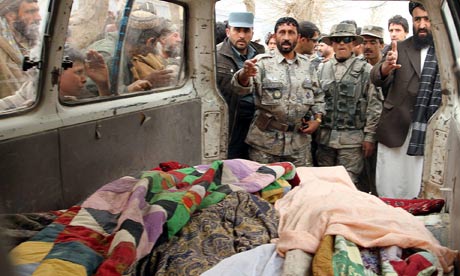 ![]() Afghan police and residents gather around a van containing the bodies of civilians killed in the shooting. Photograph: I Sameem/EPA |