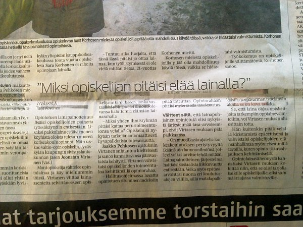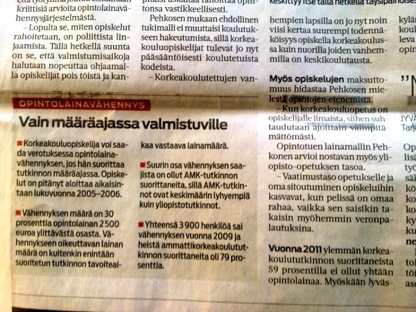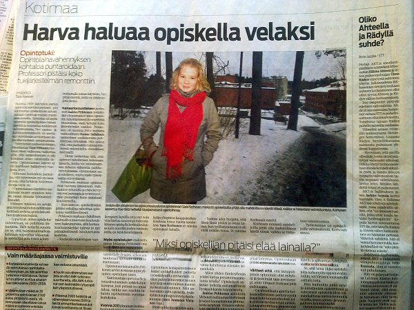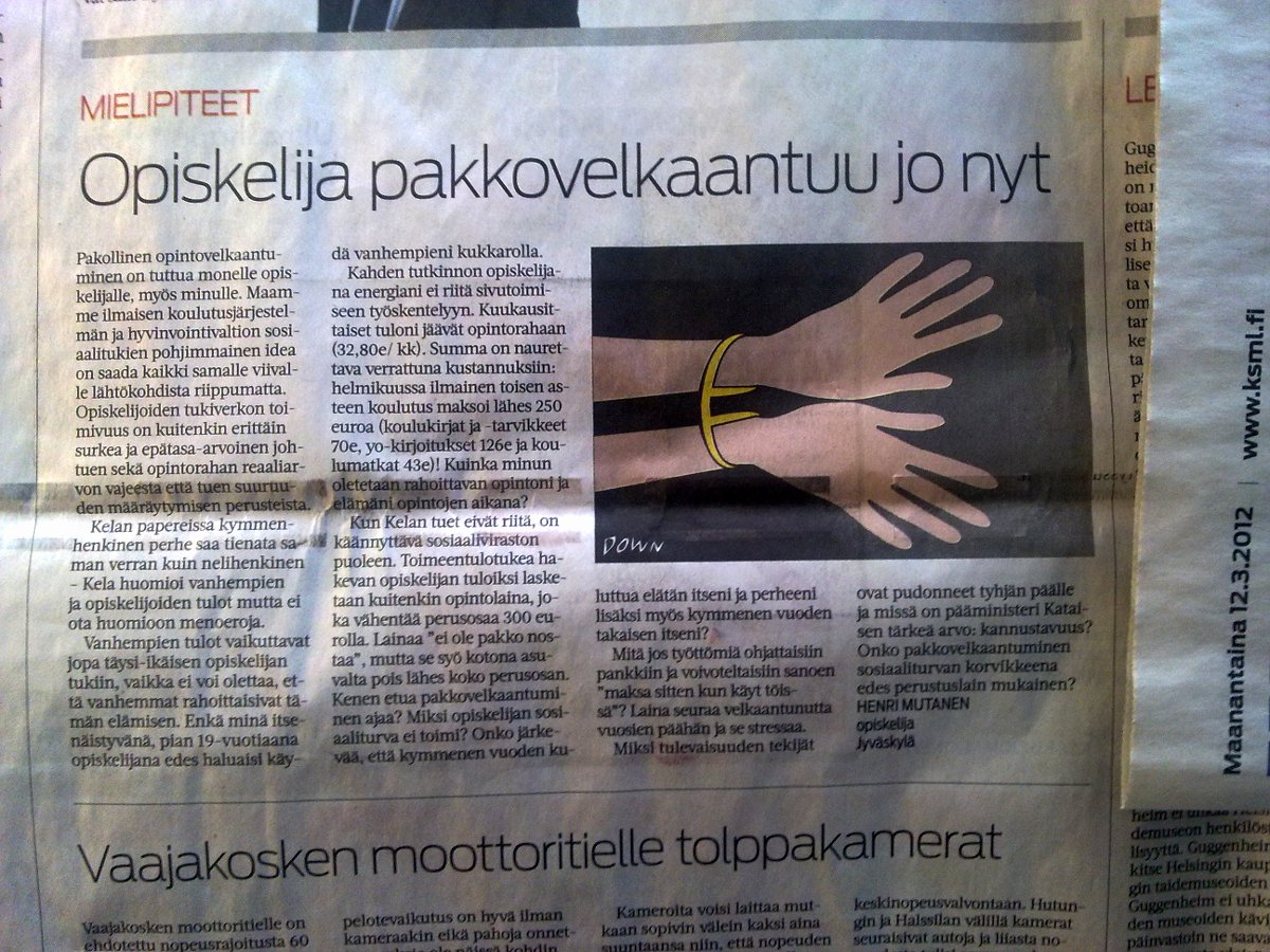 Harva haluaa opiskella velaksi. Keskisuomalainen maanantaina 2012-03-13. |