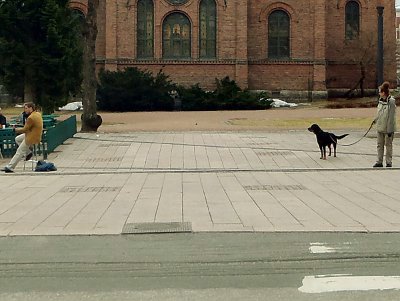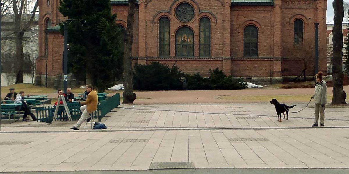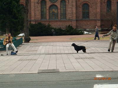 Lauantai 2012-04-28 "Koiran kiinnostus".Kioski on avannut ovensa. Ulkona jo tarkenee. Trubaduurikin on paikalla, jota koira pysähtyi hetkeksi ihmettelemään. Jyväskylä. Kirkkopuisto. 2012-04-28 13:20. Kuva: Pertti Manninen. |