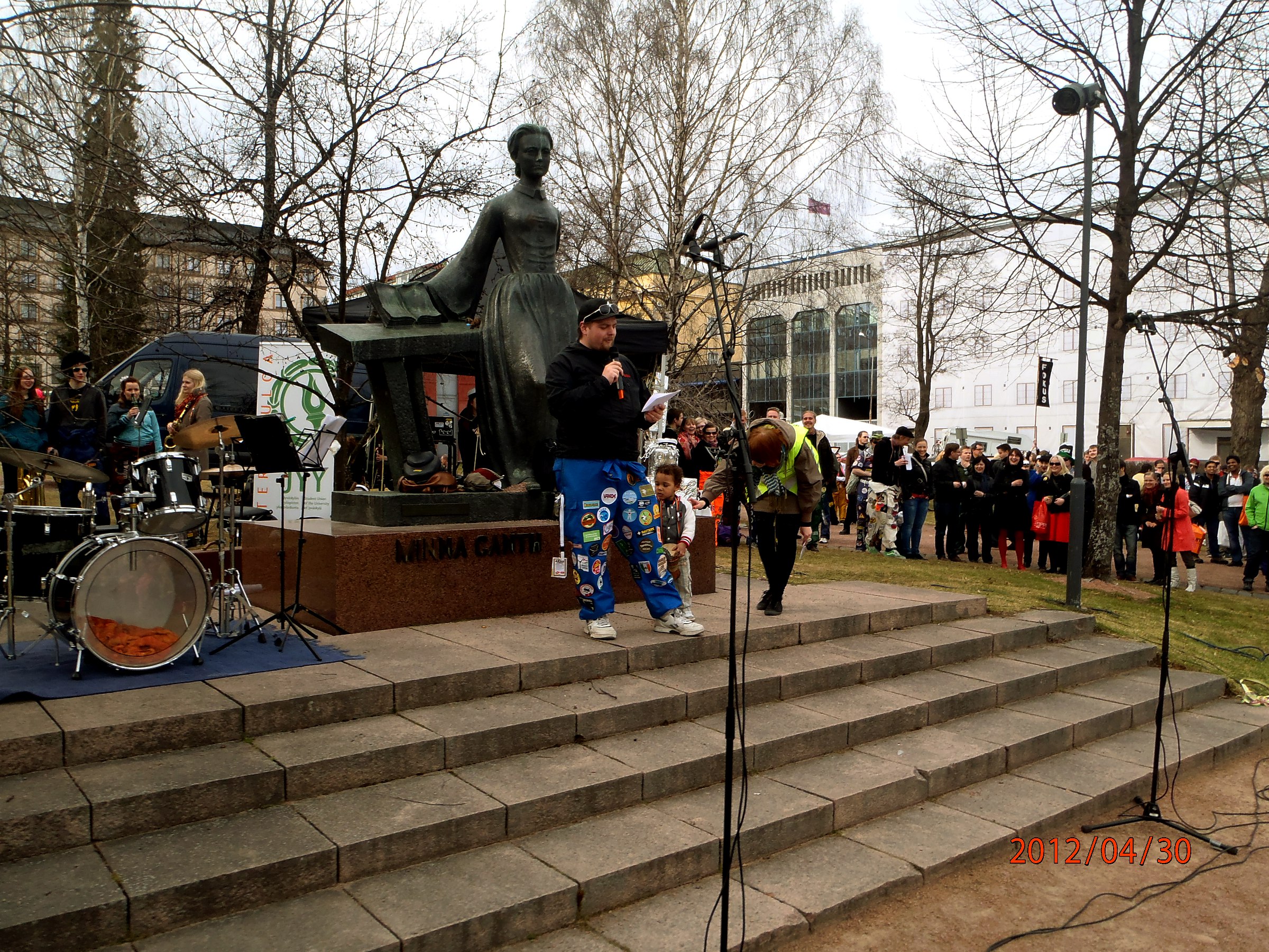 "Keskustelua & Kuuntelua".Minna Canthin patsaalla Jyväskylän opiskelijoiden järjestämässä vapun aaton tapahtumassa maanantaina 2012-04-30 17:16." Kuva: Pertti Manninen. |