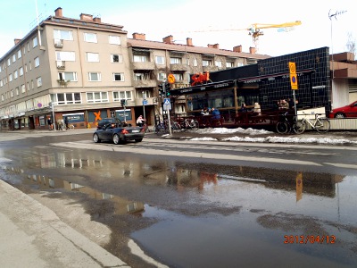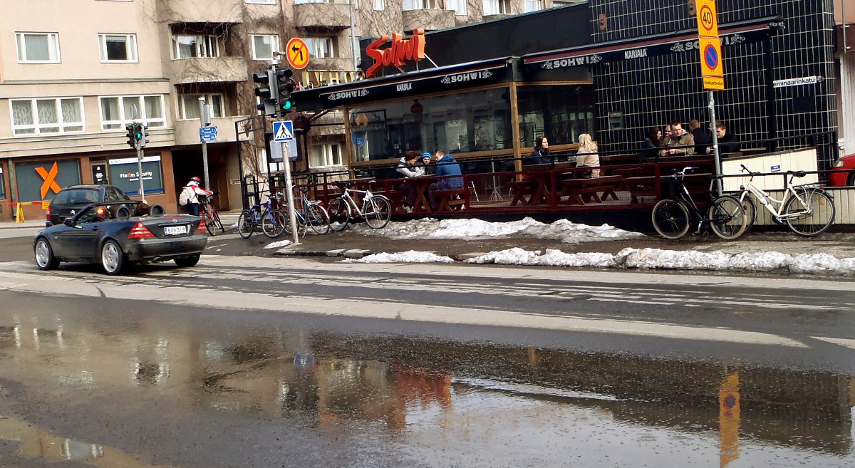 Torstaina 2012-04-12 15:49. Keski-Suomi. Jyväskylä. Kauppakatu on juuri vaihtunut Seminaarinkaduksi. Sohvi. Aurinkoinen terassi. Joillakin on pipot vielä päässään ja avomersukin näyttää pyyhältävän tässä lämmössä. Vesi on katujen pesuvettä, joka on valunut Vaasankadulta kääntyen myös Seminaarinkadulle ja Yliopistolle sekä Ylä-Ruthille, jossa nautin kupposen kahvia ja mietin menenkö tänään vielä Caj Bremerin valokuvanäyttelyyn Keski-Suomen museoon, jonne alustavasti on lupautunut seuraksi nuorempaakin sukupolvea. Kuva Pertti Manninen. |