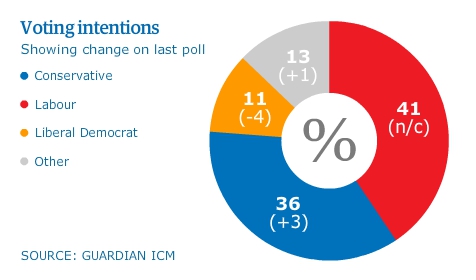 Meanwhile, the Liberal Democrats have slid back four to stand at 11%, and the combined total of other parties is up one, to 13%. |