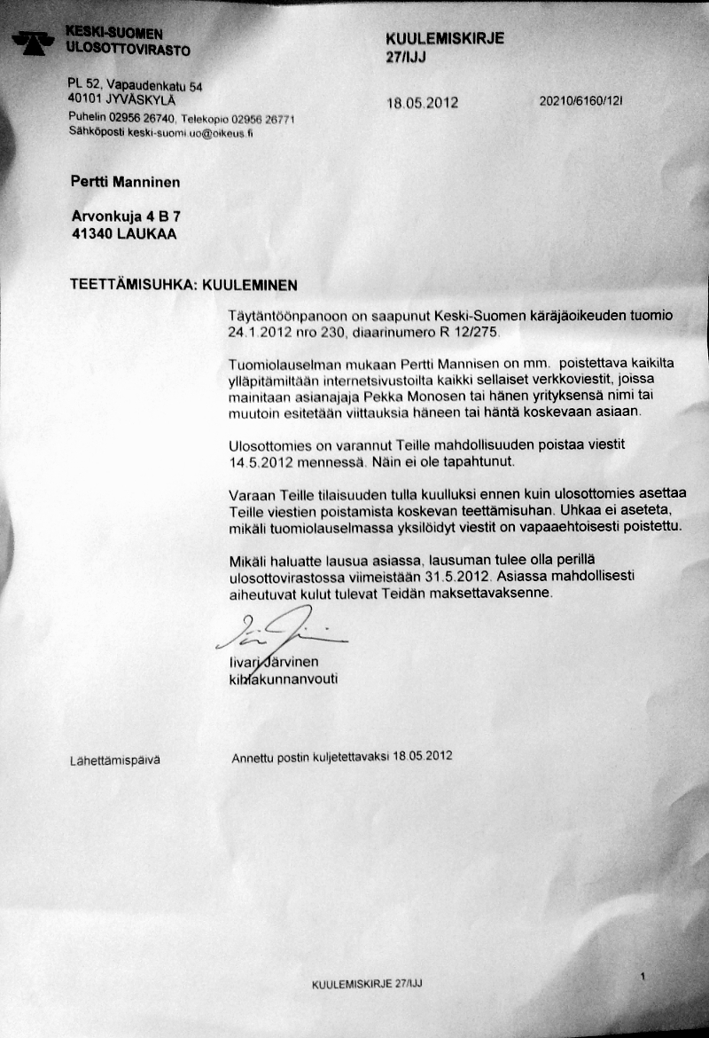 KESKI-SUOMEN ULOSOTTOVIRASTO Täytäntöönpanoon on saapunut Keski-Suomen käräjäoikeuden tuomio 24.1.2012 nro 230, diaarinumero R 12/275. Tuomiolauselman mukaan Pertti Mannisen on mm. poistettava kaikilta ylläpitämiltään internetsivustoilta kaikki sellaiset verkkoviestit, joissa mainitaan asianajaja Pekka Monosen tai hänen yrityksensä nimi tai muutoin esitetään viittauksia häneen tai häntä koskevaan asiaan. Ulosottomies on varannut Teille Mahdollisuuden poistaa viestit 14.5,2012 mennessä. Näin ei ole tapahtunut. Varaan Teille tilaisuuden tulla kuulluksi ennen kuin ulosottomies asettaa Teille viestien poistamista koskevan tettämisuhan. Uhkaa ei aseteta, mikäli tuomiolauselmassa yksilöidyt viestit on vapaaehtoisesti poistettu. Mikäli haluatte lausua asiassa, lausuman tulee olla perillä ulosottovirastossa viimeistään 31.5.2012. Asiassa mahdollisesti aiheutuvat kulut tulevat Teidän maksettavaksenne. Iivari Järvinen Lähettämispäivä Annettu postin kuljetettavaksi 18.05.2012 |