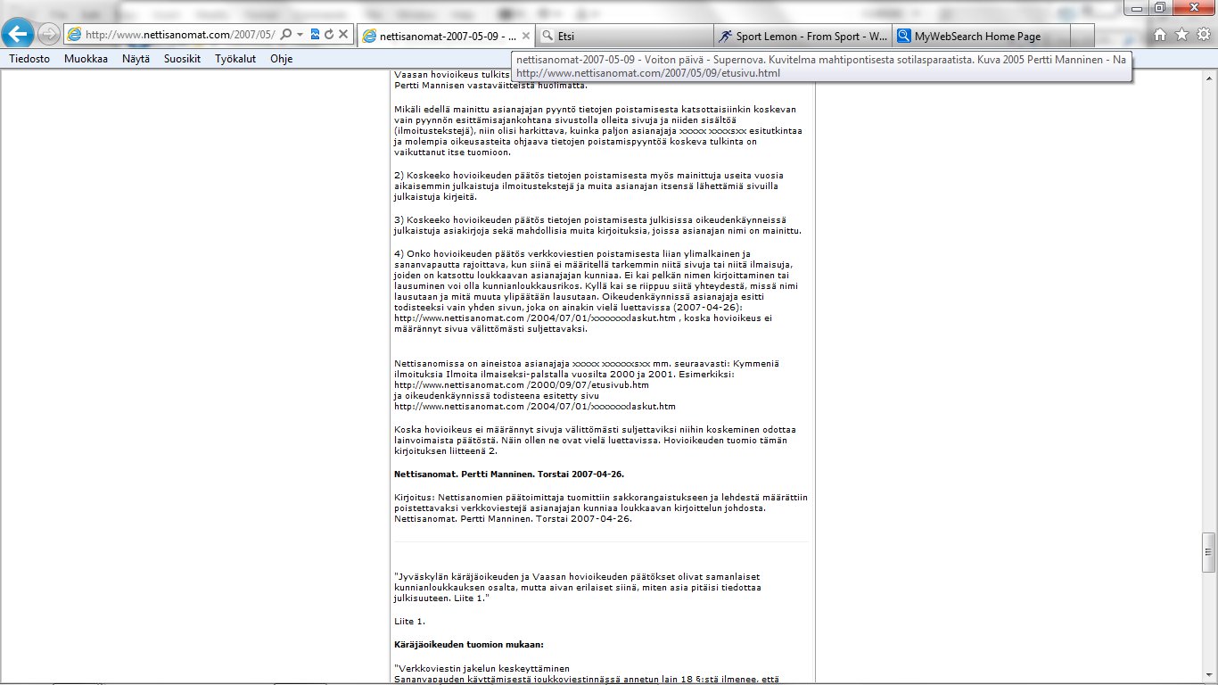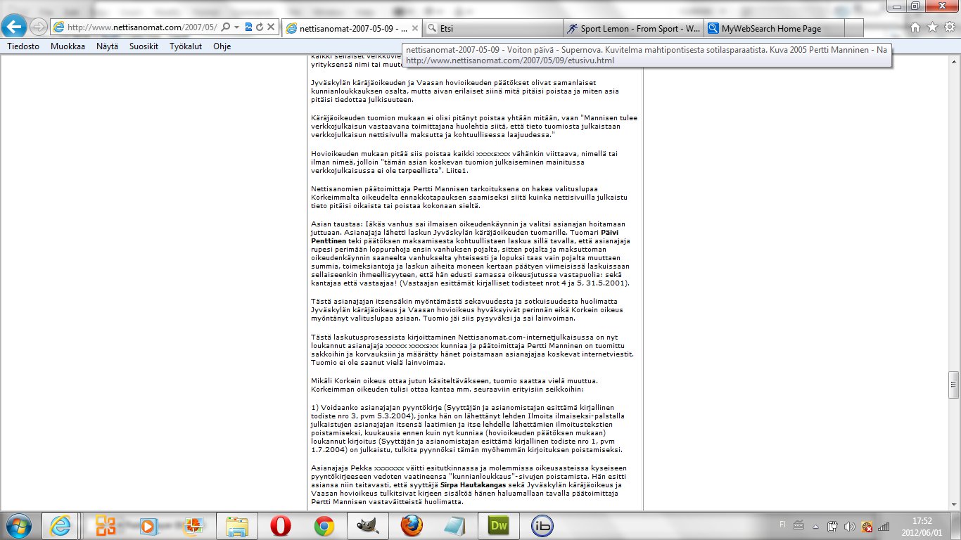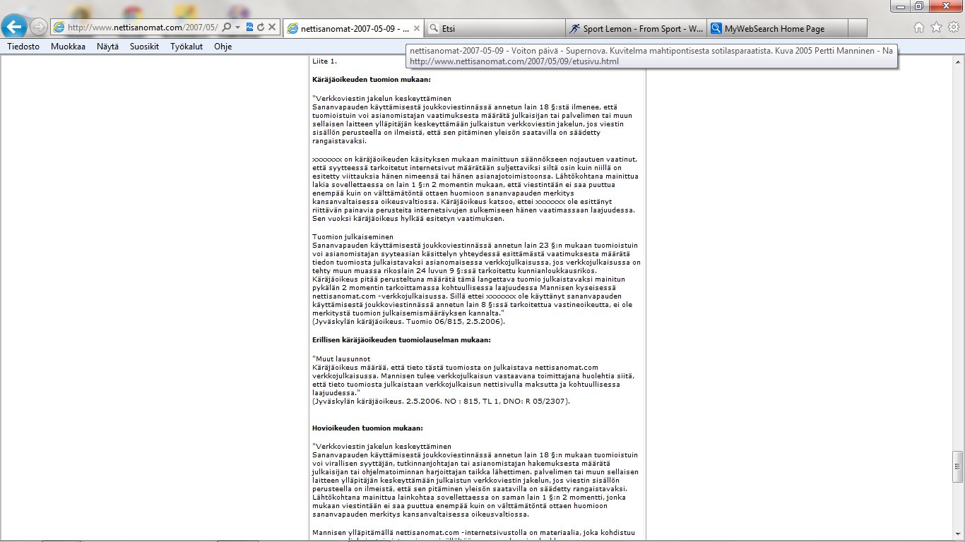 Nettisanomat 2012/06/19 - LIITE. Sivuja, joissa tuomio on pantu täytäntöön. Sivut 1-10/565 - VALITUSLUPAHAKEMUS KORKEIMMALLE OIKEUDELLE: Tuomio ja seuraamismääräys sellaisesta rikolliseksi väitetystä teosta, jota ei ole käsitelty oikeudessa ja oikeudessa rikolliseksi todettu, ei ole kansanvaltaisen oikeusvaltion oikeusjärjestyksen mukainen. - Kuva. Poika ja koira. - Kuva. Käden ojennus. Karuselli. - Tiistai 19.06.2012 - etusivu - Nettisanomat - Sanomanetti - Blogi: Viikkosanomat.fi - Kuvasanomat - Sanomatori - Viikkosanomat - Härkää sarvista - 12.fi -Korkein oikeus, sananvapaus, rajoittaminen, tuomio, käräjäoikeus, kansanvaltainen oikeusvaltio, oikeusjärjestys |