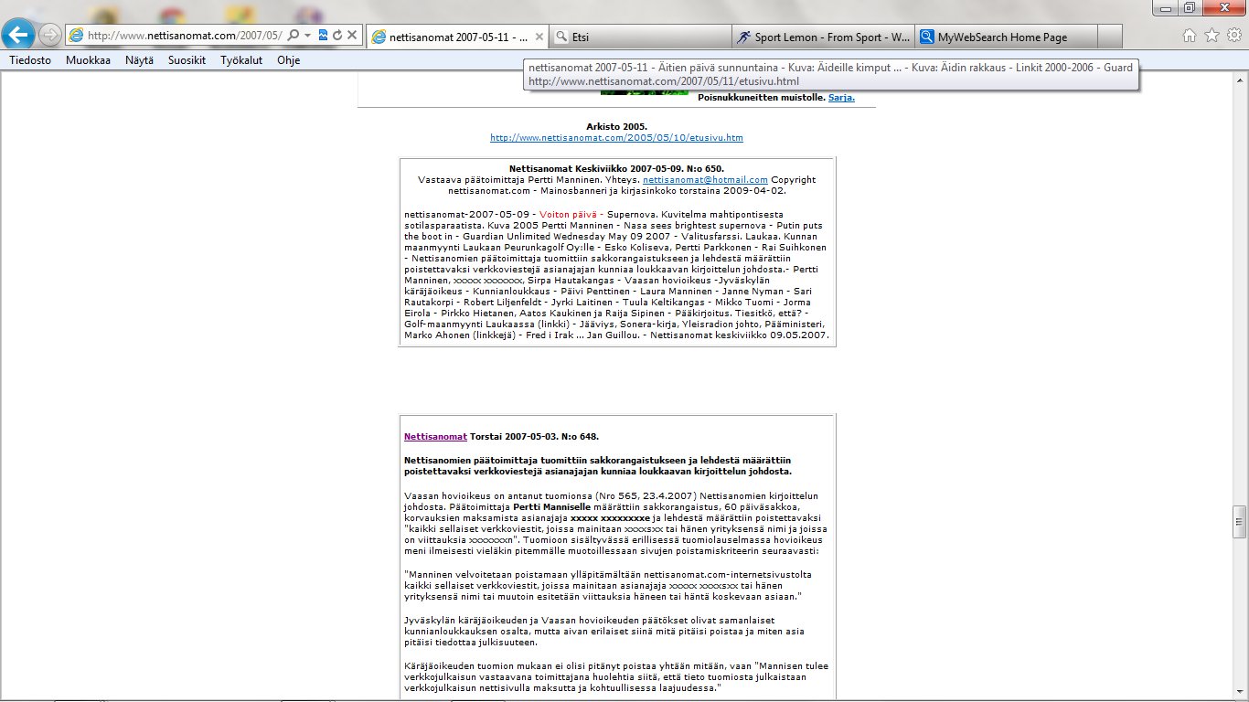 ASIA Valituslupahakemus ja valitus. MUUTOKSENHAUN KOHDE Vaasan hovioikeuden 20.4.2012 antama tuomio nro 438 kunnianloukkausasiassa R 12/275 HAKIJA Manninen, Pertti Juhani I VALITUSLUPAHAKEMUS PERUSTE Pyydän kunnioittavasti, että korkein oikeus myöntäisi minulle luvan hakea muutosta yllämainittuun hovioikeuden tuomioon, koska 1) siihen on erityistä aihetta asiassa tapahtuneen sellaisen oikeudenkäyntivirheen takia, jonka perusteella ratkaisu olisi purettava tai poistettava 2) siihen on erityistä aihetta asiassa tapahtuneen muun virheen takia, jonka perusteella ratkaisu olisi purettava tai poistettava 3) lain soveltamisen kannalta muissa samanlaisissa tapauksissa on tärkeätä saattaa asia Korkeimman oikeuden ratkaistavaksi PERUSTELUT 1. Hovioikeus on evännyt jatkokäsittelyluvan perustelunaan, ettei ole syytä epäillä käräjäoikeuden ratkaisun lopputuloksen oikeellisuutta. Ratkaisu on sananvapauslain vastainen, kun siinä vastoin lain määräystä rajoitetaan tarpeettomasti sananvapautta. 2. Hovioikeus on jättänyt voimaan sellaisen käräjäoikeuden tuomion, jossa käräjäoikeus on määrännyt rangaistuksen ja seuraamukset sellaisista asioista (kirjoituksista), joita ei ollenkaan käsitelty käräjäoikeudessa. Lisäksi käräjäoikeus on määrännyt poistettavaksi sellaisenaan (ilman minkäänlaista kommentointia) julkaistut oikeudenkäyntipöytäkirjat. II VALITUS VAATIMUKSET Kunnioittavasti pyydän, että korkein oikeus kumoaa käräjäoikeuden ja hovioikeuden tuomiot. PERUSTELUT Toistan kaikki tässä asiassa aikaisemmin suullisesti lausumani ja esille tuomani kirjallisen materiaalin. Tarkoitukseni ei ole ollut loukata asianomistajien kunniaa, vaan kirjoittaa ja selostaa asianomistajien toimintaa niin kuin se on oikeasti tapahtunut. Tällaisten asioiden esille tuominen ja siitä kirjoittaminen ei voi olla loukkaavaa eikä tällä mitenkään väitetä, että asianomistajat olisivat olleet mukana jossakin lainvastaisessa toiminnassa. Asianomistaja Lauri Kara on esittänyt kaksi kirjoitusta, jotka ovat mukana oikeudenkäyntiaineistossa ja lukuisan joukon hakutuloksia, jotka tulevat näistä kirjoituksista ja myös oikeudenkäyntipöytäkirjoista. Käräjäoikeus on määrännyt näistä kirjoituksista poistettavaksi asiaosaistiedot, jotka olivat edellä kerrotun mukaan jo poistettu ennen oikeudenkäyntiä, joista dokumentit esitettiin käräjäoikeuden istunnon aikana ja jotka ovat mukana oikeudenkäyntiaineistossa. Käräjäoikeus on vastoin lain selvää määräystä siitä, että sananvapautta ei pidä tarpeettomasti rajoittaa, menetellyt juuri näin. Näiden kirjoitusten lisäksi käräjäoikeus määräsi poistettavaksi asianosaistiedot myös sellaisista kirjoituksista ja oikeudenkäyntipöytäkirjoista, jotka eivät olleet kirjallisina todisteina tai joita ei muutenkaan käsitelty oikeudenkäynnissä. Oikeudenkäyntipöytäkirjojen osalta tosin käräjäoikeus totesi riittämättömin perustein, että niistä asianosaistiedot piti poistaa, koska pöytäkirjat oli julkaistu "kunnianloukkaustarkoituksessa". Muiden kirjoitusten osalta oikeus katsoi niitä siis mitenkään käsittelemättä, että ne loukkasivat asianomistajan kunniaa. Käräjäoikeus on vastoin lain selvää määräystä siitä, että sananvapautta ei pidä tarpeettomasti rajoittaa, menetellyt juuri näin. TÄYTÄNTÖÖNPANO ja "Vastaus kuulemiskirjeeseen 27/IJJ (Kihlakunnanvouti Iivari Järvinen) Oheisissa liitteissä on sivut siitä aineistosta, jotka käräjäoikeuden tuomion mukaan piti poistaa, mutta jota aineistoa ei ollenkaan käsitelty oikeudenistunnossa. Pyydän, että tämä aineisto otetaan huomioon kirjallisina todisteina, koska sitä ei ollut vielä silloin poistot tehtyinä, kun hovioikeus teki päätöksensä siitä, että se ei ota valitustani käsittelyyn. Nämä todisteet osoittavat sen, että käräjäoikeus on tarpeettomasti rajoittanut sananvapautta, koska niissä ei ole mitään asianomistajien kunniaa loukkaavaa. ASIANOMISTAJIEN ERILLISYYS Vaikka käräjäoikeuden tuomio on yhteinen molempien asianomistajien kanssa, niin tietenkään Lauri Karan esittämät kunniaansa loukkaavaksi väittämänsä kirjoitukset eivät loukkaa Pekka Monosen kunniaa, jollei tämä asianomistaja näin väitä. Näin hän ei oikeudenkäynnissä missään yhteydessä väittänyt, joten asianosaistietojen poistovaatimus voi koskea vain Lauri Karaa näissä kirjoituksissa. Käräjäoikeus ei ole tätä rajannut ja on siis tältäkin osin rajoittanut tarpeettomasti sananvapautta tässä asiassa. Mikäli korkein oikeus kuitenkin katsoo minun syyllistyneen kunnianloukkausrikokseen ja määrää siitä rangaistuksen pyydän kunnioittavasti seuraavaa: 1) Rangaistusseuraamus Pyydän lieventämään rangaistusta. 2) Korvausvelvollisuus Pyydän lieventämään korvausvelvollisuutta hovioikeuteen jättämäni pyynnön mukaisesti koskien Pekka Monosen ja Lauri Karan vaatimuksia.. 3) Verkkoviestin jakelun keskeyttäminen Lähtökohtana mainittua lakia sovellettaessa on lain 1 §:n 2 momentin mukaan, että viestintään ei saa puuttua enempää kuin on välttämätöntä ottaen huomioon sananvapauden merkitys kansanvaltaisessa oikeusvaltiossa. Asianomistajien vaatimus ja käräjäoikeuden tuomio on edellä esitettyjen lainkohtien mukaan liian laaja. Poistamisvaatimus voi näin ollen kohdistua vain siihen aineistoon, joka oikeudessa esiteltiin ja käsiteltiin ja joka todettiin rikolliseksi, kunniaa loukkaavaksi. Tuomio ja seuraamismääräys sellaisesta rikolliseksi väitetystä teosta, jota ei ole käsitelty oikeudessa ja oikeudessa rikolliseksi todettu, ei ole kansanvaltaisen oikeusvaltion oikeusjärjestyksen mukainen. LIITTEET Kunnioittavasti PÄIVÄYS Laukaassa kesäkuun 18. päivänä 2012 Pertti Manninen |