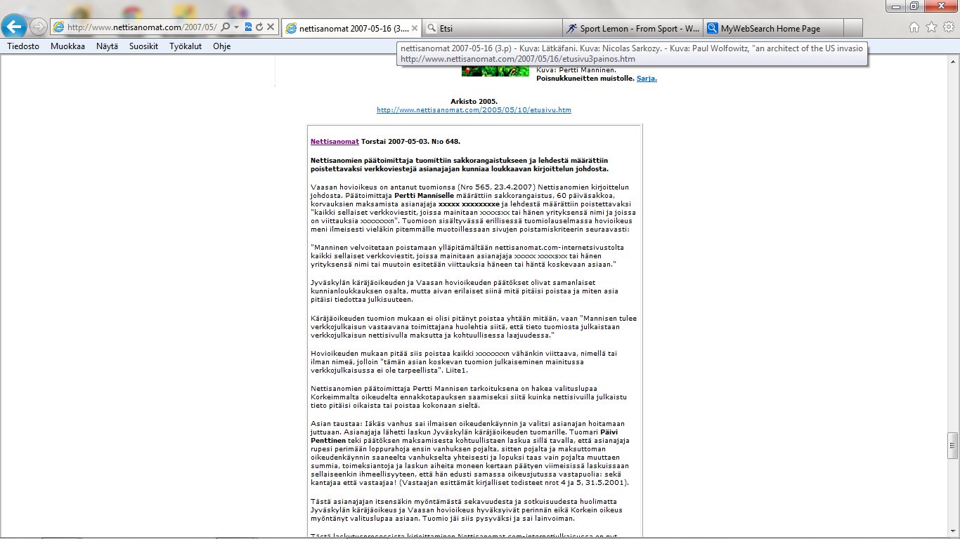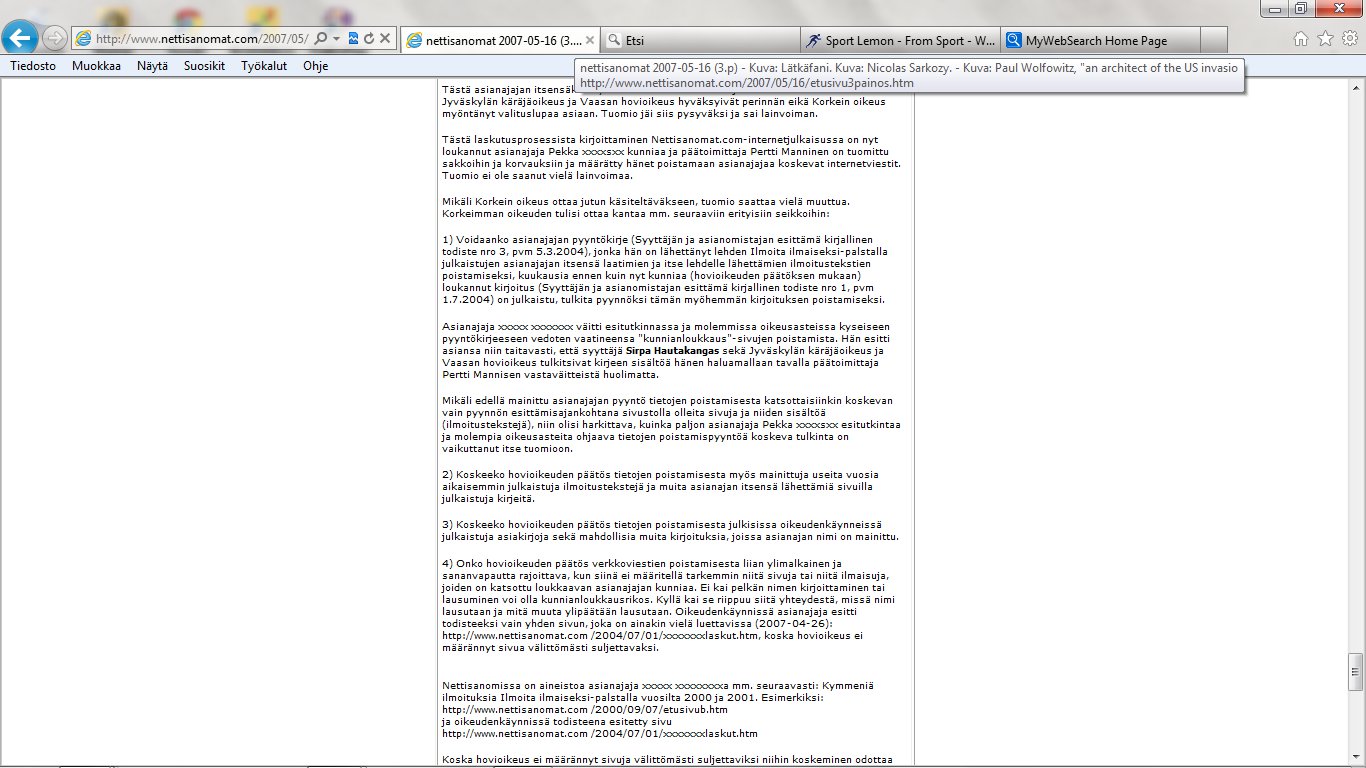 Nettisanomat 2012/06/22 - LIITE. Sivuja, joissa tuomio on pantu täytäntöön. Sivut 21-30/565 - VALITUSLUPAHAKEMUS KORKEIMMALLE OIKEUDELLE: Tuomio ja seuraamismääräys sellaisesta rikolliseksi väitetystä teosta, jota ei ole käsitelty oikeudessa ja oikeudessa rikolliseksi todettu, ei ole kansanvaltaisen oikeusvaltion oikeusjärjestyksen mukainen. - Kuva. Poika ja koira. - Kuva. Käden ojennus. Karuselli. - Perjantai 22.06.2012 - etusivu - Nettisanomat - Sanomanetti - Blogi: Viikkosanomat.fi - Kuvasanomat - Sanomatori - Viikkosanomat - Härkää sarvista - 12.fi -Korkein oikeus, sananvapaus, rajoittaminen, tuomio, käräjäoikeus, kansanvaltainen oikeusvaltio, oikeusjärjestys |