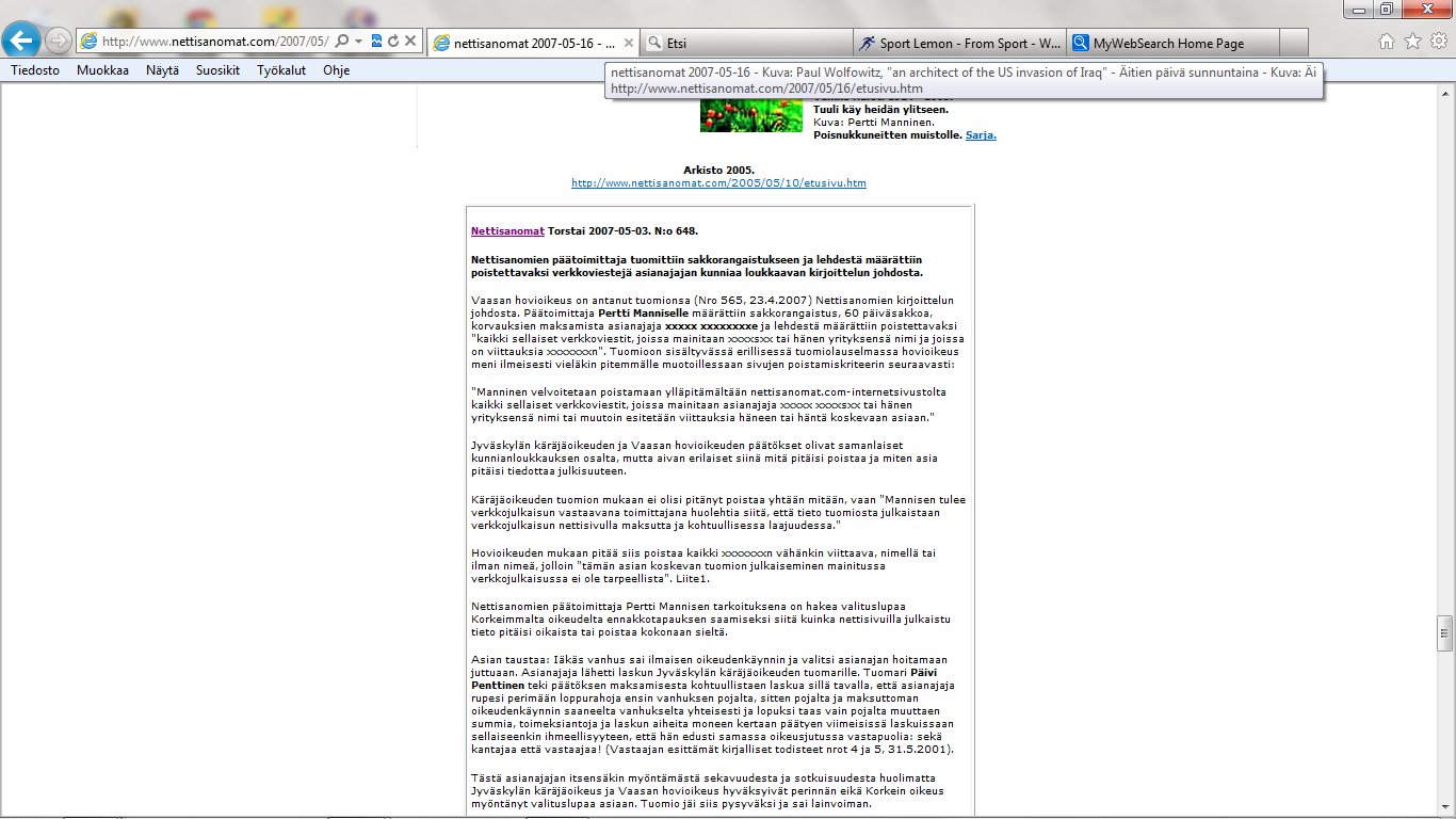 ASIA Valituslupahakemus ja valitus. MUUTOKSENHAUN KOHDE Vaasan hovioikeuden 20.4.2012 antama tuomio nro 438 kunnianloukkausasiassa R 12/275 HAKIJA Manninen, Pertti Juhani I VALITUSLUPAHAKEMUS PERUSTE Pyydän kunnioittavasti, että korkein oikeus myöntäisi minulle luvan hakea muutosta yllämainittuun hovioikeuden tuomioon, koska 1) siihen on erityistä aihetta asiassa tapahtuneen sellaisen oikeudenkäyntivirheen takia, jonka perusteella ratkaisu olisi purettava tai poistettava 2) siihen on erityistä aihetta asiassa tapahtuneen muun virheen takia, jonka perusteella ratkaisu olisi purettava tai poistettava 3) lain soveltamisen kannalta muissa samanlaisissa tapauksissa on tärkeätä saattaa asia Korkeimman oikeuden ratkaistavaksi PERUSTELUT 1. Hovioikeus on evännyt jatkokäsittelyluvan perustelunaan, ettei ole syytä epäillä käräjäoikeuden ratkaisun lopputuloksen oikeellisuutta. Ratkaisu on sananvapauslain vastainen, kun siinä vastoin lain määräystä rajoitetaan tarpeettomasti sananvapautta. 2. Hovioikeus on jättänyt voimaan sellaisen käräjäoikeuden tuomion, jossa käräjäoikeus on määrännyt rangaistuksen ja seuraamukset sellaisista asioista (kirjoituksista), joita ei ollenkaan käsitelty käräjäoikeudessa. Lisäksi käräjäoikeus on määrännyt poistettavaksi sellaisenaan (ilman minkäänlaista kommentointia) julkaistut oikeudenkäyntipöytäkirjat. II VALITUS VAATIMUKSET Kunnioittavasti pyydän, että korkein oikeus kumoaa käräjäoikeuden ja hovioikeuden tuomiot. PERUSTELUT Toistan kaikki tässä asiassa aikaisemmin suullisesti lausumani ja esille tuomani kirjallisen materiaalin. Tarkoitukseni ei ole ollut loukata asianomistajien kunniaa, vaan kirjoittaa ja selostaa asianomistajien toimintaa niin kuin se on oikeasti tapahtunut. Tällaisten asioiden esille tuominen ja siitä kirjoittaminen ei voi olla loukkaavaa eikä tällä mitenkään väitetä, että asianomistajat olisivat olleet mukana jossakin lainvastaisessa toiminnassa. Asianomistaja Lauri Kara on esittänyt kaksi kirjoitusta, jotka ovat mukana oikeudenkäyntiaineistossa ja lukuisan joukon hakutuloksia, jotka tulevat näistä kirjoituksista ja myös oikeudenkäyntipöytäkirjoista. Käräjäoikeus on määrännyt näistä kirjoituksista poistettavaksi asiaosaistiedot, jotka olivat edellä kerrotun mukaan jo poistettu ennen oikeudenkäyntiä, joista dokumentit esitettiin käräjäoikeuden istunnon aikana ja jotka ovat mukana oikeudenkäyntiaineistossa. Käräjäoikeus on vastoin lain selvää määräystä siitä, että sananvapautta ei pidä tarpeettomasti rajoittaa, menetellyt juuri näin. Näiden kirjoitusten lisäksi käräjäoikeus määräsi poistettavaksi asianosaistiedot myös sellaisista kirjoituksista ja oikeudenkäyntipöytäkirjoista, jotka eivät olleet kirjallisina todisteina tai joita ei muutenkaan käsitelty oikeudenkäynnissä. Oikeudenkäyntipöytäkirjojen osalta tosin käräjäoikeus totesi riittämättömin perustein, että niistä asianosaistiedot piti poistaa, koska pöytäkirjat oli julkaistu "kunnianloukkaustarkoituksessa". Muiden kirjoitusten osalta oikeus katsoi niitä siis mitenkään käsittelemättä, että ne loukkasivat asianomistajan kunniaa. Käräjäoikeus on vastoin lain selvää määräystä siitä, että sananvapautta ei pidä tarpeettomasti rajoittaa, menetellyt juuri näin. TÄYTÄNTÖÖNPANO ja "Vastaus kuulemiskirjeeseen 27/IJJ (Kihlakunnanvouti Iivari Järvinen) Oheisissa liitteissä on sivut siitä aineistosta, jotka käräjäoikeuden tuomion mukaan piti poistaa, mutta jota aineistoa ei ollenkaan käsitelty oikeudenistunnossa. Pyydän, että tämä aineisto otetaan huomioon kirjallisina todisteina, koska sitä ei ollut vielä silloin poistot tehtyinä, kun hovioikeus teki päätöksensä siitä, että se ei ota valitustani käsittelyyn. Nämä todisteet osoittavat sen, että käräjäoikeus on tarpeettomasti rajoittanut sananvapautta, koska niissä ei ole mitään asianomistajien kunniaa loukkaavaa. ASIANOMISTAJIEN ERILLISYYS Vaikka käräjäoikeuden tuomio on yhteinen molempien asianomistajien kanssa, niin tietenkään Lauri Karan esittämät kunniaansa loukkaavaksi väittämänsä kirjoitukset eivät loukkaa Pekka Monosen kunniaa, jollei tämä asianomistaja näin väitä. Näin hän ei oikeudenkäynnissä missään yhteydessä väittänyt, joten asianosaistietojen poistovaatimus voi koskea vain Lauri Karaa näissä kirjoituksissa. Käräjäoikeus ei ole tätä rajannut ja on siis tältäkin osin rajoittanut tarpeettomasti sananvapautta tässä asiassa. Mikäli korkein oikeus kuitenkin katsoo minun syyllistyneen kunnianloukkausrikokseen ja määrää siitä rangaistuksen pyydän kunnioittavasti seuraavaa: 1) Rangaistusseuraamus Pyydän lieventämään rangaistusta. 2) Korvausvelvollisuus Pyydän lieventämään korvausvelvollisuutta hovioikeuteen jättämäni pyynnön mukaisesti koskien Pekka Monosen ja Lauri Karan vaatimuksia.. 3) Verkkoviestin jakelun keskeyttäminen Lähtökohtana mainittua lakia sovellettaessa on lain 1 §:n 2 momentin mukaan, että viestintään ei saa puuttua enempää kuin on välttämätöntä ottaen huomioon sananvapauden merkitys kansanvaltaisessa oikeusvaltiossa. Asianomistajien vaatimus ja käräjäoikeuden tuomio on edellä esitettyjen lainkohtien mukaan liian laaja. Poistamisvaatimus voi näin ollen kohdistua vain siihen aineistoon, joka oikeudessa esiteltiin ja käsiteltiin ja joka todettiin rikolliseksi, kunniaa loukkaavaksi. Tuomio ja seuraamismääräys sellaisesta rikolliseksi väitetystä teosta, jota ei ole käsitelty oikeudessa ja oikeudessa rikolliseksi todettu, ei ole kansanvaltaisen oikeusvaltion oikeusjärjestyksen mukainen. LIITTEET Kunnioittavasti PÄIVÄYS Laukaassa kesäkuun 18. päivänä 2012 Pertti Manninen |