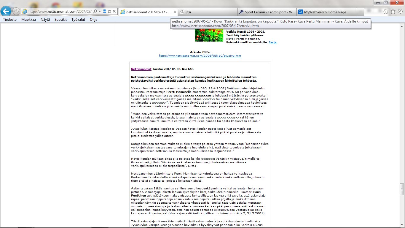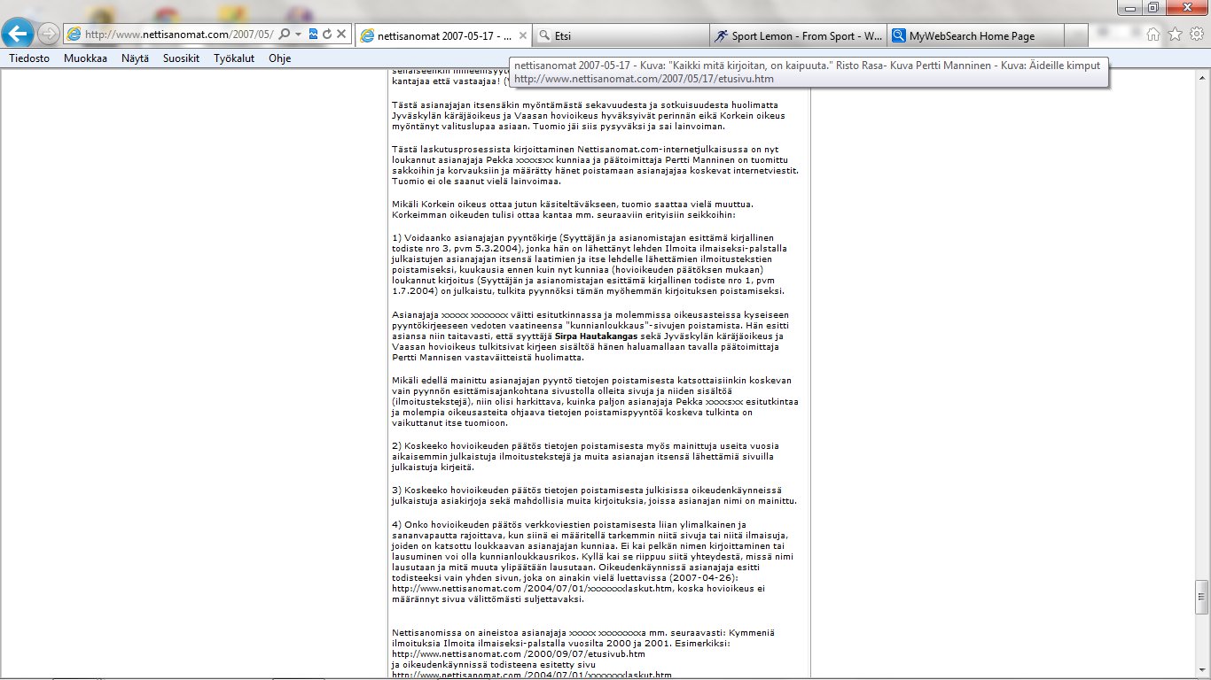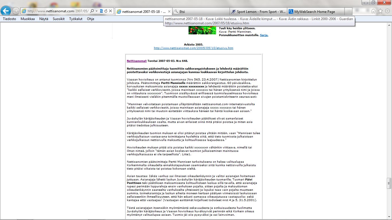 ASIA Valituslupahakemus ja valitus. MUUTOKSENHAUN KOHDE Vaasan hovioikeuden 20.4.2012 antama tuomio nro 438 kunnianloukkausasiassa R 12/275 HAKIJA Manninen, Pertti Juhani I VALITUSLUPAHAKEMUS PERUSTE Pyydän kunnioittavasti, että korkein oikeus myöntäisi minulle luvan hakea muutosta yllämainittuun hovioikeuden tuomioon, koska 1) siihen on erityistä aihetta asiassa tapahtuneen sellaisen oikeudenkäyntivirheen takia, jonka perusteella ratkaisu olisi purettava tai poistettava 2) siihen on erityistä aihetta asiassa tapahtuneen muun virheen takia, jonka perusteella ratkaisu olisi purettava tai poistettava 3) lain soveltamisen kannalta muissa samanlaisissa tapauksissa on tärkeätä saattaa asia Korkeimman oikeuden ratkaistavaksi PERUSTELUT 1. Hovioikeus on evännyt jatkokäsittelyluvan perustelunaan, ettei ole syytä epäillä käräjäoikeuden ratkaisun lopputuloksen oikeellisuutta. Ratkaisu on sananvapauslain vastainen, kun siinä vastoin lain määräystä rajoitetaan tarpeettomasti sananvapautta. 2. Hovioikeus on jättänyt voimaan sellaisen käräjäoikeuden tuomion, jossa käräjäoikeus on määrännyt rangaistuksen ja seuraamukset sellaisista asioista (kirjoituksista), joita ei ollenkaan käsitelty käräjäoikeudessa. Lisäksi käräjäoikeus on määrännyt poistettavaksi sellaisenaan (ilman minkäänlaista kommentointia) julkaistut oikeudenkäyntipöytäkirjat. II VALITUS VAATIMUKSET Kunnioittavasti pyydän, että korkein oikeus kumoaa käräjäoikeuden ja hovioikeuden tuomiot. PERUSTELUT Toistan kaikki tässä asiassa aikaisemmin suullisesti lausumani ja esille tuomani kirjallisen materiaalin. Tarkoitukseni ei ole ollut loukata asianomistajien kunniaa, vaan kirjoittaa ja selostaa asianomistajien toimintaa niin kuin se on oikeasti tapahtunut. Tällaisten asioiden esille tuominen ja siitä kirjoittaminen ei voi olla loukkaavaa eikä tällä mitenkään väitetä, että asianomistajat olisivat olleet mukana jossakin lainvastaisessa toiminnassa. Asianomistaja Lauri Kara on esittänyt kaksi kirjoitusta, jotka ovat mukana oikeudenkäyntiaineistossa ja lukuisan joukon hakutuloksia, jotka tulevat näistä kirjoituksista ja myös oikeudenkäyntipöytäkirjoista. Käräjäoikeus on määrännyt näistä kirjoituksista poistettavaksi asiaosaistiedot, jotka olivat edellä kerrotun mukaan jo poistettu ennen oikeudenkäyntiä, joista dokumentit esitettiin käräjäoikeuden istunnon aikana ja jotka ovat mukana oikeudenkäyntiaineistossa. Käräjäoikeus on vastoin lain selvää määräystä siitä, että sananvapautta ei pidä tarpeettomasti rajoittaa, menetellyt juuri näin. Näiden kirjoitusten lisäksi käräjäoikeus määräsi poistettavaksi asianosaistiedot myös sellaisista kirjoituksista ja oikeudenkäyntipöytäkirjoista, jotka eivät olleet kirjallisina todisteina tai joita ei muutenkaan käsitelty oikeudenkäynnissä. Oikeudenkäyntipöytäkirjojen osalta tosin käräjäoikeus totesi riittämättömin perustein, että niistä asianosaistiedot piti poistaa, koska pöytäkirjat oli julkaistu "kunnianloukkaustarkoituksessa". Muiden kirjoitusten osalta oikeus katsoi niitä siis mitenkään käsittelemättä, että ne loukkasivat asianomistajan kunniaa. Käräjäoikeus on vastoin lain selvää määräystä siitä, että sananvapautta ei pidä tarpeettomasti rajoittaa, menetellyt juuri näin. TÄYTÄNTÖÖNPANO ja "Vastaus kuulemiskirjeeseen 27/IJJ (Kihlakunnanvouti Iivari Järvinen) Oheisissa liitteissä on sivut siitä aineistosta, jotka käräjäoikeuden tuomion mukaan piti poistaa, mutta jota aineistoa ei ollenkaan käsitelty oikeudenistunnossa. Pyydän, että tämä aineisto otetaan huomioon kirjallisina todisteina, koska sitä ei ollut vielä silloin poistot tehtyinä, kun hovioikeus teki päätöksensä siitä, että se ei ota valitustani käsittelyyn. Nämä todisteet osoittavat sen, että käräjäoikeus on tarpeettomasti rajoittanut sananvapautta, koska niissä ei ole mitään asianomistajien kunniaa loukkaavaa. ASIANOMISTAJIEN ERILLISYYS Vaikka käräjäoikeuden tuomio on yhteinen molempien asianomistajien kanssa, niin tietenkään Lauri Karan esittämät kunniaansa loukkaavaksi väittämänsä kirjoitukset eivät loukkaa Pekka Monosen kunniaa, jollei tämä asianomistaja näin väitä. Näin hän ei oikeudenkäynnissä missään yhteydessä väittänyt, joten asianosaistietojen poistovaatimus voi koskea vain Lauri Karaa näissä kirjoituksissa. Käräjäoikeus ei ole tätä rajannut ja on siis tältäkin osin rajoittanut tarpeettomasti sananvapautta tässä asiassa. Mikäli korkein oikeus kuitenkin katsoo minun syyllistyneen kunnianloukkausrikokseen ja määrää siitä rangaistuksen pyydän kunnioittavasti seuraavaa: 1) Rangaistusseuraamus Pyydän lieventämään rangaistusta. 2) Korvausvelvollisuus Pyydän lieventämään korvausvelvollisuutta hovioikeuteen jättämäni pyynnön mukaisesti koskien Pekka Monosen ja Lauri Karan vaatimuksia.. 3) Verkkoviestin jakelun keskeyttäminen Lähtökohtana mainittua lakia sovellettaessa on lain 1 §:n 2 momentin mukaan, että viestintään ei saa puuttua enempää kuin on välttämätöntä ottaen huomioon sananvapauden merkitys kansanvaltaisessa oikeusvaltiossa. Asianomistajien vaatimus ja käräjäoikeuden tuomio on edellä esitettyjen lainkohtien mukaan liian laaja. Poistamisvaatimus voi näin ollen kohdistua vain siihen aineistoon, joka oikeudessa esiteltiin ja käsiteltiin ja joka todettiin rikolliseksi, kunniaa loukkaavaksi. Tuomio ja seuraamismääräys sellaisesta rikolliseksi väitetystä teosta, jota ei ole käsitelty oikeudessa ja oikeudessa rikolliseksi todettu, ei ole kansanvaltaisen oikeusvaltion oikeusjärjestyksen mukainen. LIITTEET Kunnioittavasti PÄIVÄYS Laukaassa kesäkuun 18. päivänä 2012 Pertti Manninen |