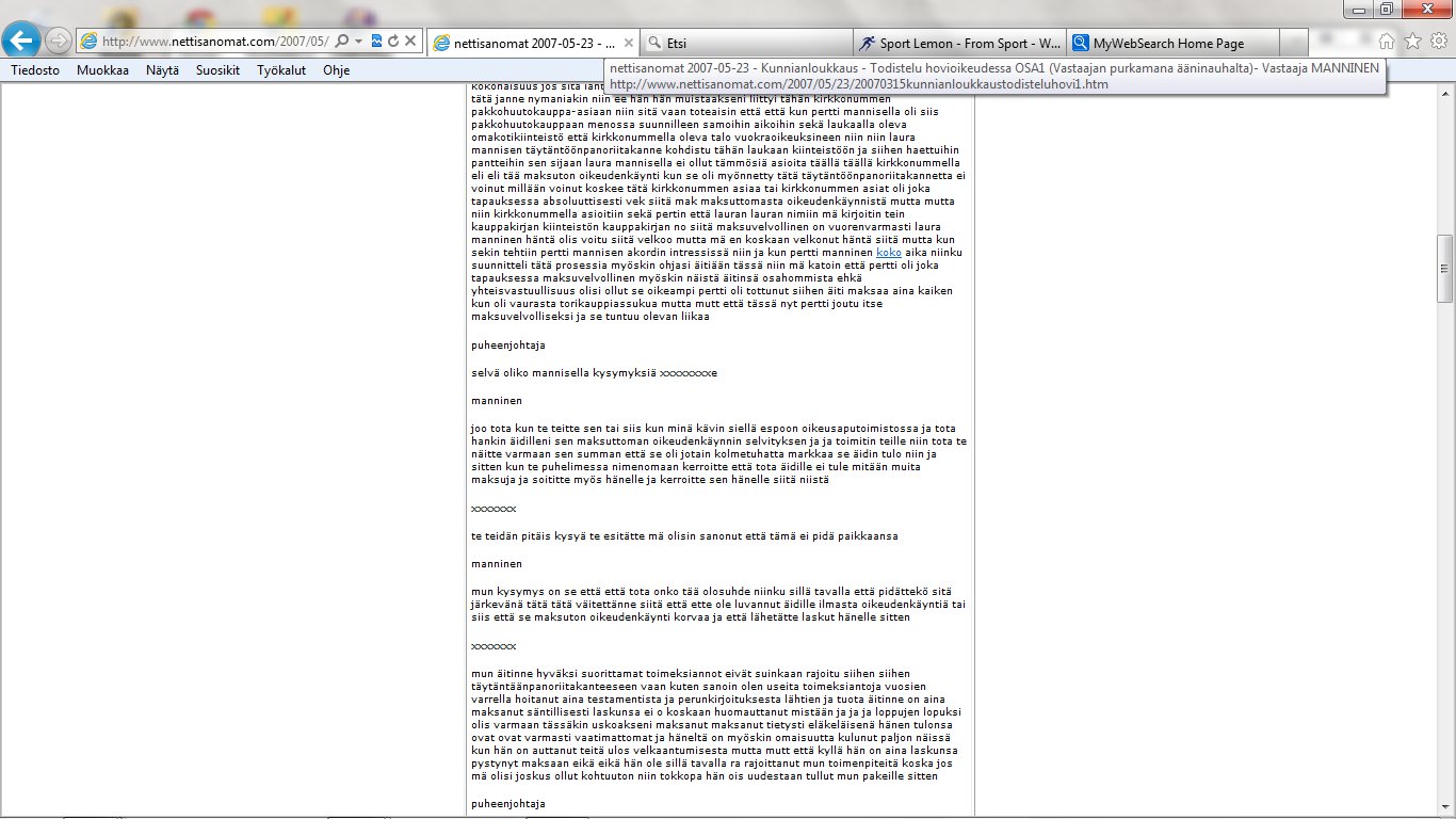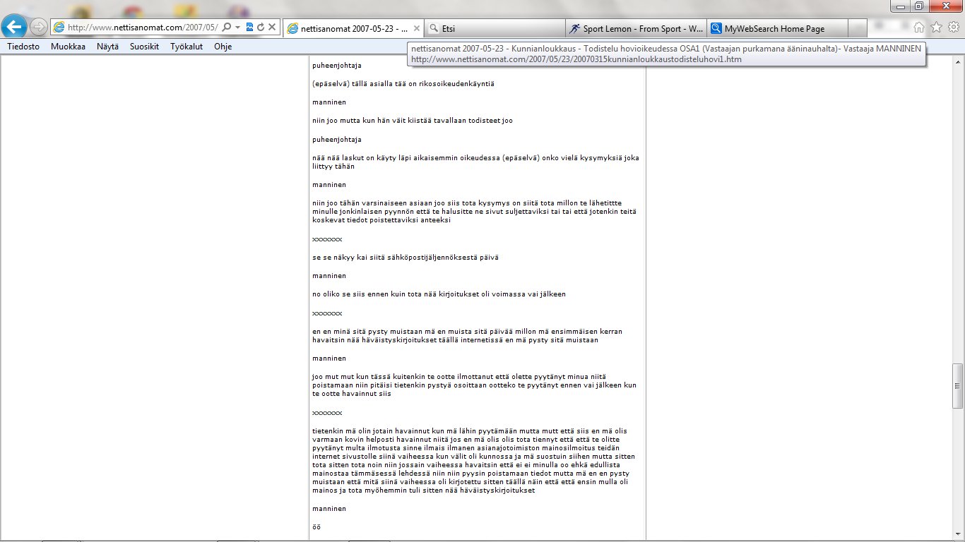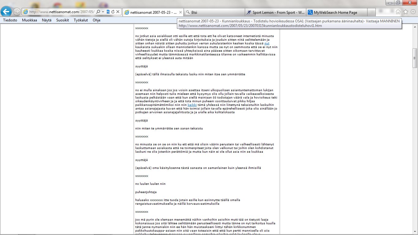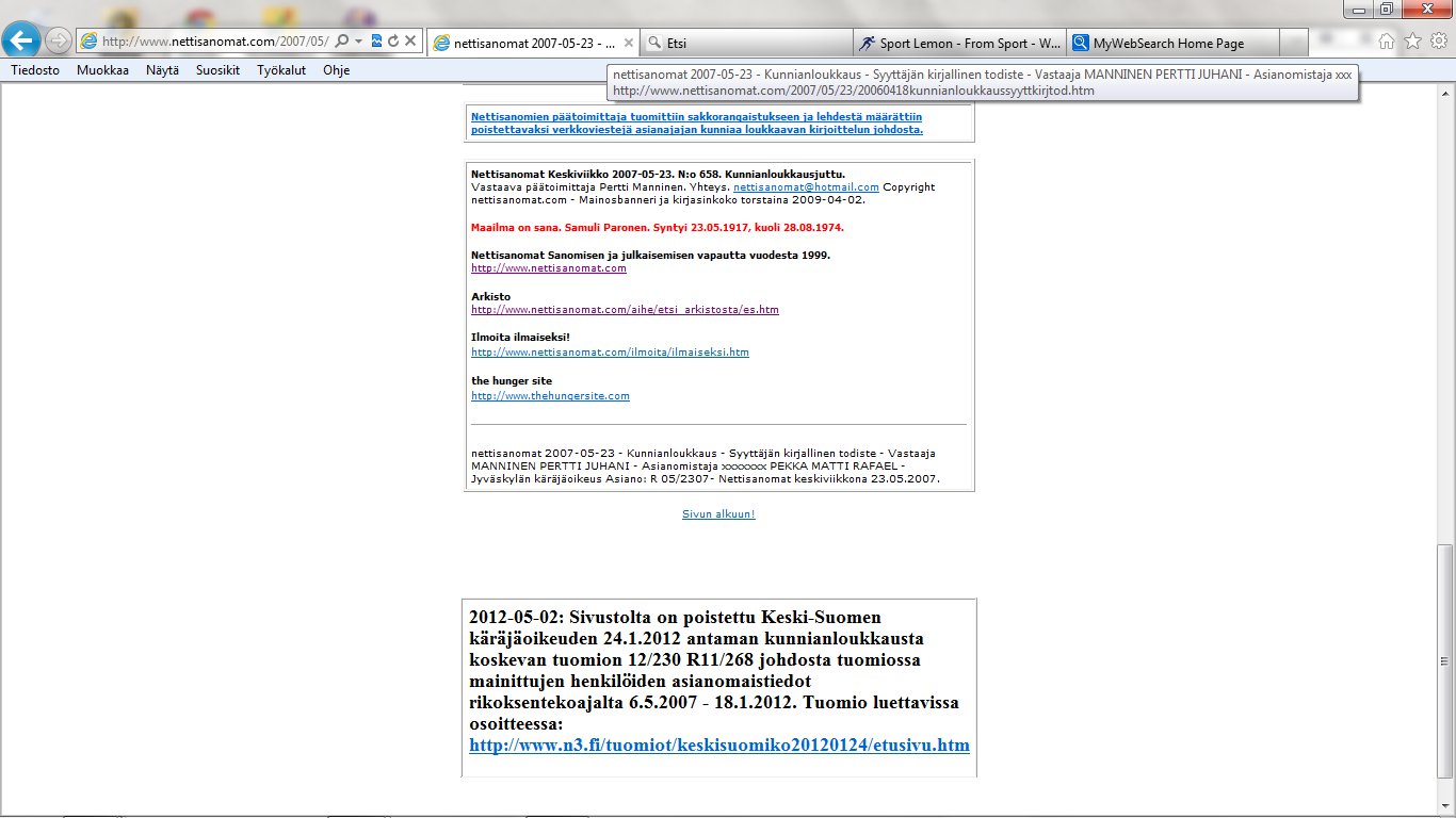 Nettisanomat 2012/06/25 - LIITE. Sivuja, joissa tuomio on pantu täytäntöön. Sivut89-98/ 565 - VALITUSLUPAHAKEMUS KORKEIMMALLE OIKEUDELLE: Tuomio ja seuraamismääräys sellaisesta rikolliseksi väitetystä teosta, jota ei ole käsitelty oikeudessa ja oikeudessa rikolliseksi todettu, ei ole kansanvaltaisen oikeusvaltion oikeusjärjestyksen mukainen. - Kuva. Poika ja koira. - Kuva. Käden ojennus. Karuselli. - Sunnuntai 24.06.2012 - oikeussivu - Nettisanomat - Sanomanetti - Blogi: Viikkosanomat.fi - Kuvasanomat - Sanomatori - Viikkosanomat - Härkää sarvista - 12.fi -Korkein oikeus, sananvapaus, rajoittaminen, tuomio, käräjäoikeus, kansanvaltainen oikeusvaltio, oikeusjärjestys |