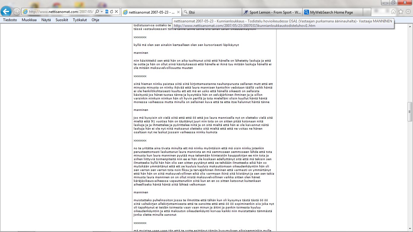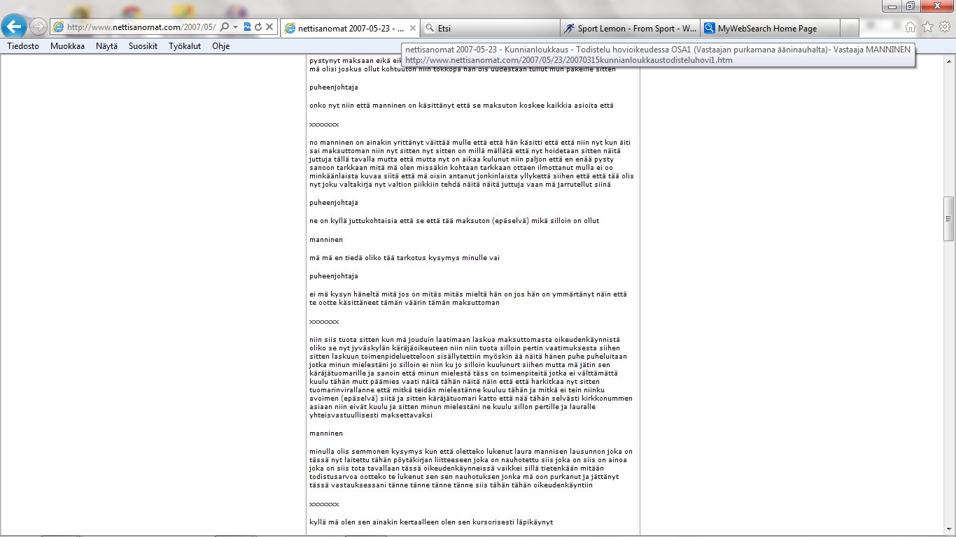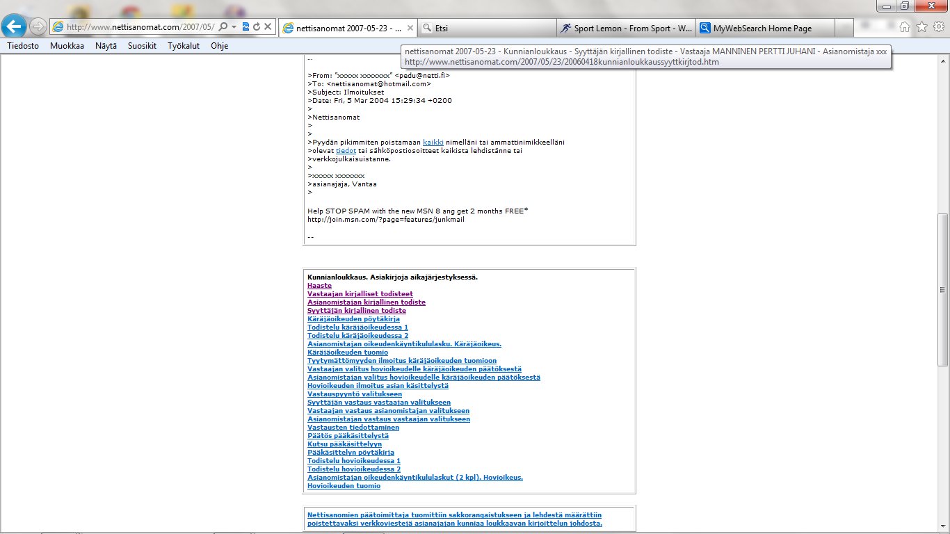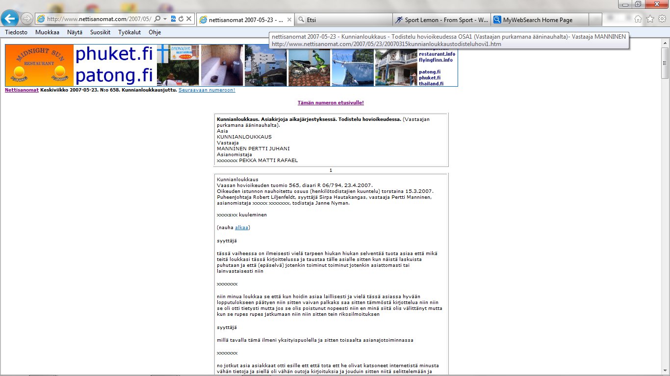Nettisanomat 2012/06/25 - LIITE. Sivuja, joissa tuomio on pantu täytäntöön. Sivut89-98/ 565 - VALITUSLUPAHAKEMUS KORKEIMMALLE OIKEUDELLE: Tuomio ja seuraamismääräys sellaisesta rikolliseksi väitetystä teosta, jota ei ole käsitelty oikeudessa ja oikeudessa rikolliseksi todettu, ei ole kansanvaltaisen oikeusvaltion oikeusjärjestyksen mukainen. - Kuva. Poika ja koira. - Kuva. Käden ojennus. Karuselli. - Sunnuntai 24.06.2012 - oikeussivu - Nettisanomat - Sanomanetti - Blogi: Viikkosanomat.fi - Kuvasanomat - Sanomatori - Viikkosanomat - Härkää sarvista - 12.fi -Korkein oikeus, sananvapaus, rajoittaminen, tuomio, käräjäoikeus, kansanvaltainen oikeusvaltio, oikeusjärjestys |