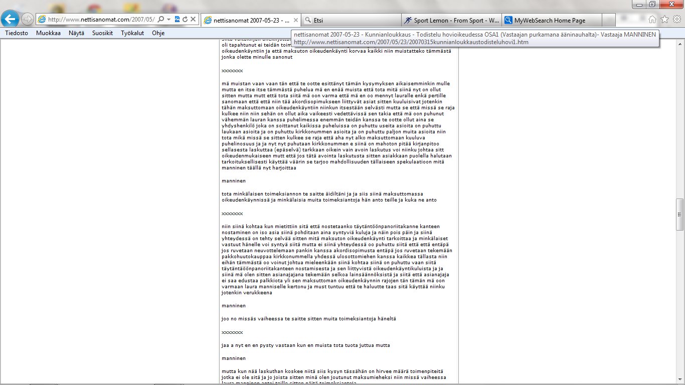 Valituslupahakemus ja valitus. Vaasan hovioikeuden 20.4.2012 antama tuomio nro 438 kunnianloukkausasiassa R 12/275 Kirjallinen todiste. Osa4. Liite. Sivuja, joissa tuomio on pantu täytäntöön. Sivut 89-98/ 565. |