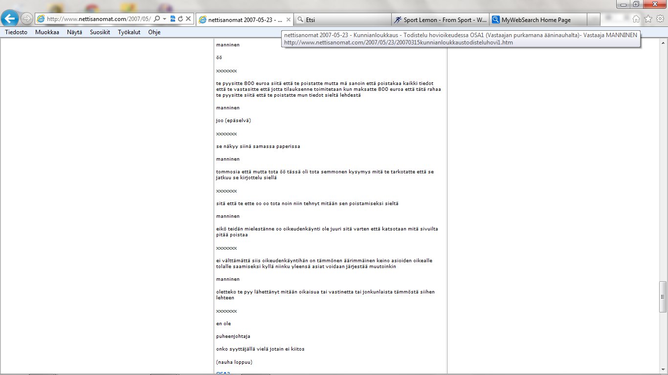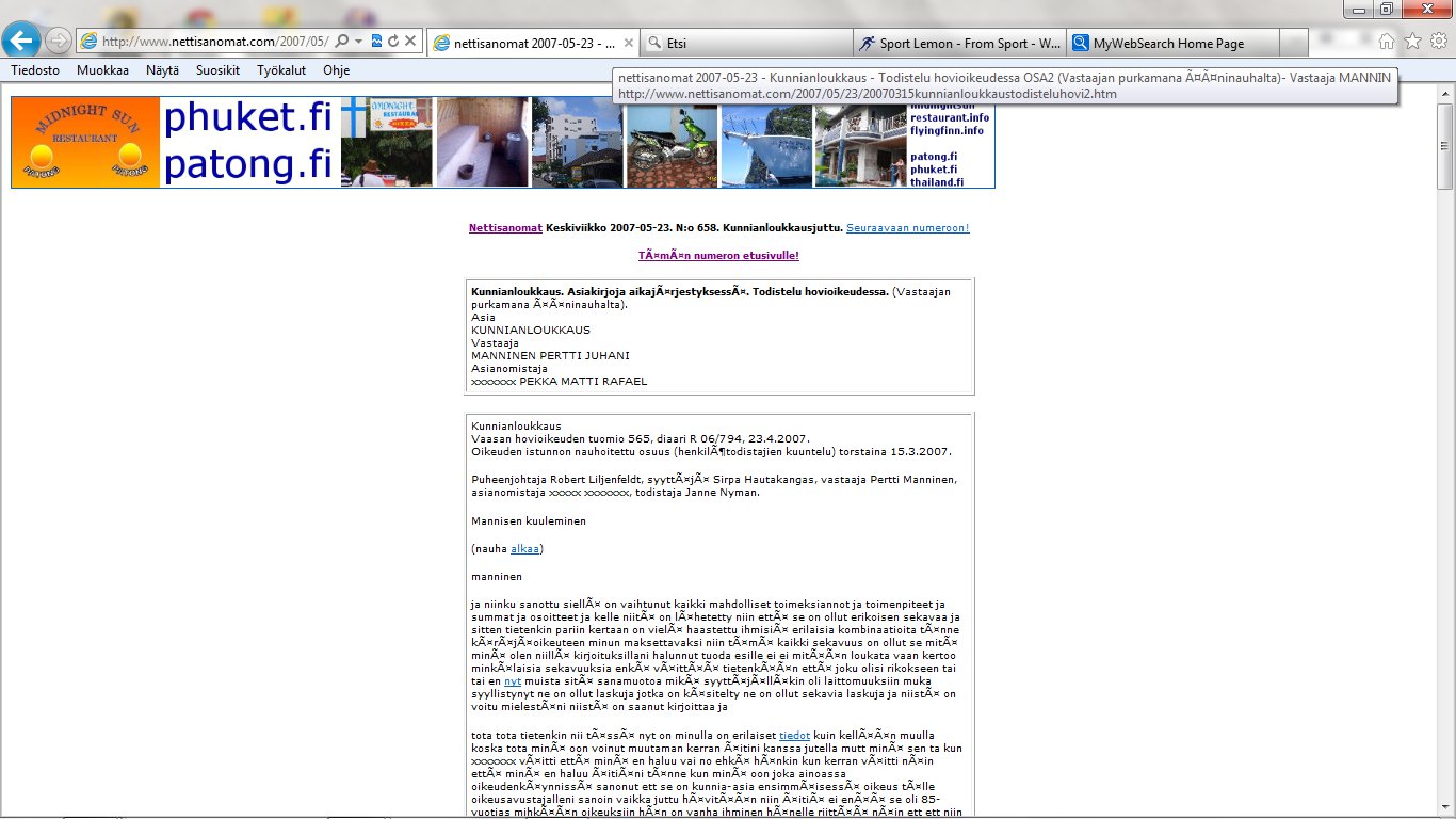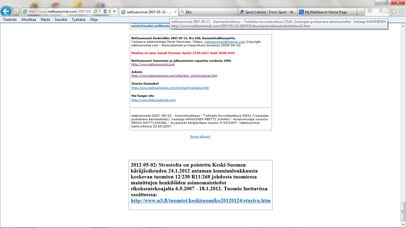 Nettisanomat 2012/06/25 - LIITE. Sivuja, joissa tuomio on pantu täytäntöön. Sivut 99-108/ 565 - VALITUSLUPAHAKEMUS KORKEIMMALLE OIKEUDELLE: Tuomio ja seuraamismääräys sellaisesta rikolliseksi väitetystä teosta, jota ei ole käsitelty oikeudessa ja oikeudessa rikolliseksi todettu, ei ole kansanvaltaisen oikeusvaltion oikeusjärjestyksen mukainen. - Kuva. Poika ja koira. - Kuva. Käden ojennus. Karuselli. - Sunnuntai 24.06.2012 - oikeussivu - Nettisanomat - Sanomanetti - Blogi: Viikkosanomat.fi - Kuvasanomat - Sanomatori - Viikkosanomat - Härkää sarvista - 12.fi -Korkein oikeus, sananvapaus, rajoittaminen, tuomio, käräjäoikeus, kansanvaltainen oikeusvaltio, oikeusjärjestys |