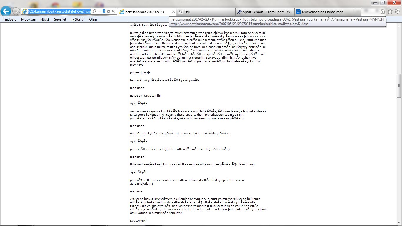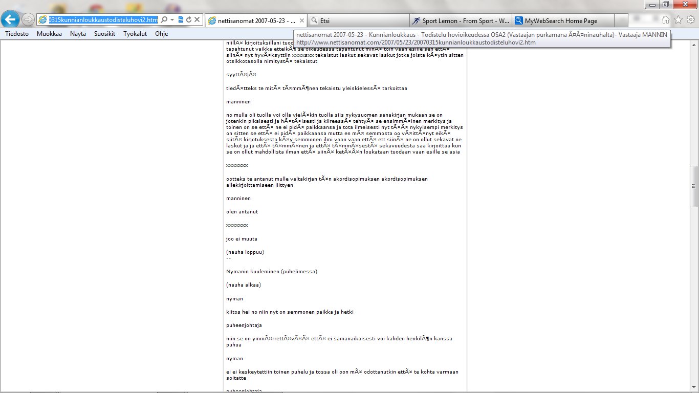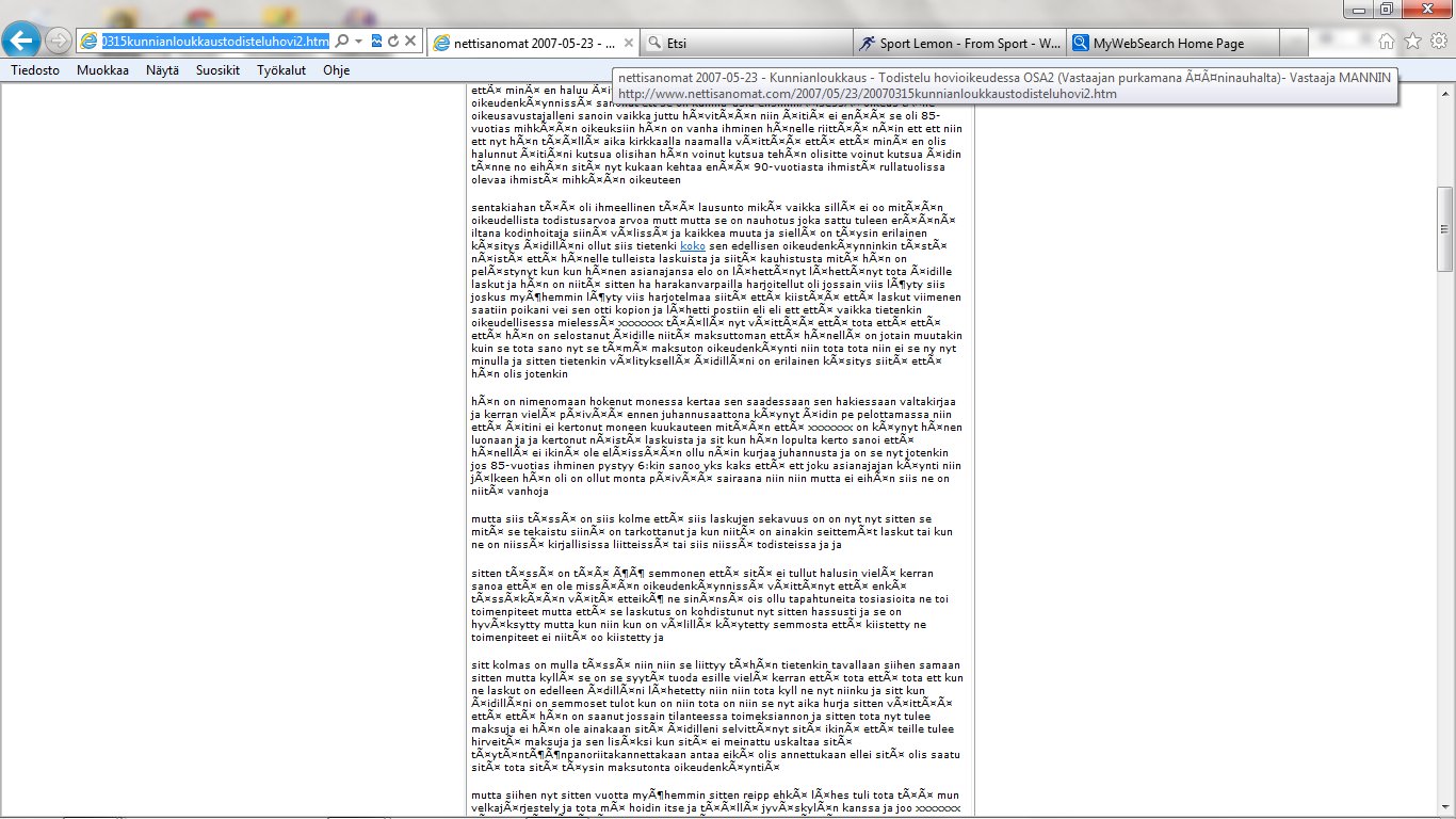 Nettisanomat 2012/06/25 - LIITE. Sivuja, joissa tuomio on pantu täytäntöön. Sivut 99-108/ 565 - VALITUSLUPAHAKEMUS KORKEIMMALLE OIKEUDELLE: Tuomio ja seuraamismääräys sellaisesta rikolliseksi väitetystä teosta, jota ei ole käsitelty oikeudessa ja oikeudessa rikolliseksi todettu, ei ole kansanvaltaisen oikeusvaltion oikeusjärjestyksen mukainen. - Kuva. Poika ja koira. - Kuva. Käden ojennus. Karuselli. - Sunnuntai 24.06.2012 - oikeussivu - Nettisanomat - Sanomanetti - Blogi: Viikkosanomat.fi - Kuvasanomat - Sanomatori - Viikkosanomat - Härkää sarvista - 12.fi -Korkein oikeus, sananvapaus, rajoittaminen, tuomio, käräjäoikeus, kansanvaltainen oikeusvaltio, oikeusjärjestys |