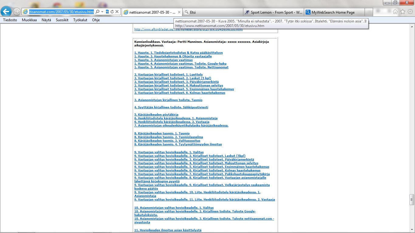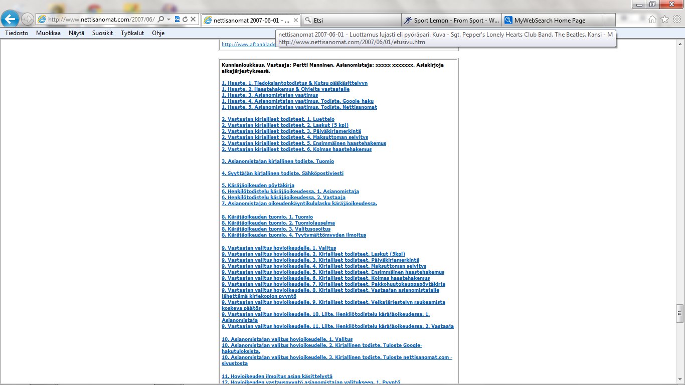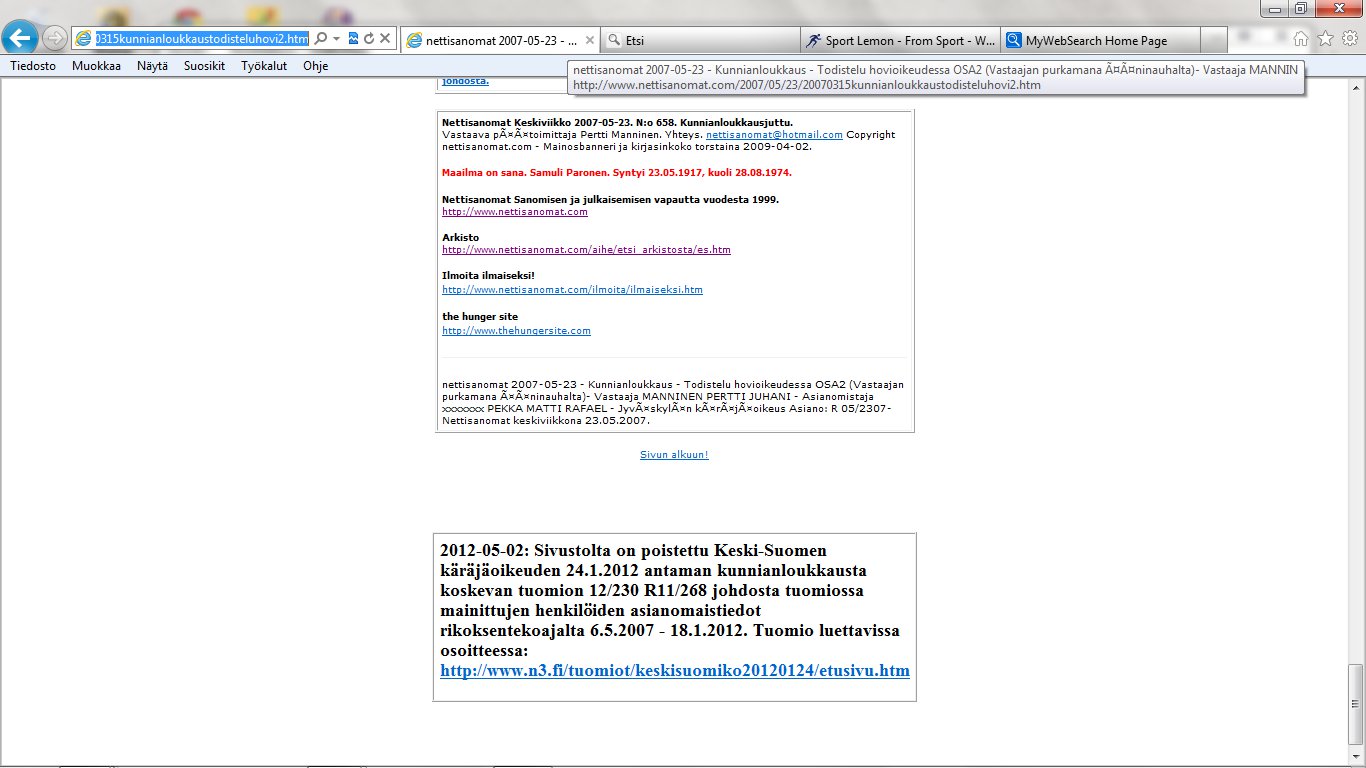 Nettisanomat 2012/06/25 - LIITE. Sivuja, joissa tuomio on pantu täytäntöön. Sivut 109-118/ 565 - VALITUSLUPAHAKEMUS KORKEIMMALLE OIKEUDELLE: Tuomio ja seuraamismääräys sellaisesta rikolliseksi väitetystä teosta, jota ei ole käsitelty oikeudessa ja oikeudessa rikolliseksi todettu, ei ole kansanvaltaisen oikeusvaltion oikeusjärjestyksen mukainen. - Kuva. Poika ja koira. - Kuva. Käden ojennus. Karuselli. - Sunnuntai 24.06.2012 - oikeussivu - Nettisanomat - Sanomanetti - Blogi: Viikkosanomat.fi - Kuvasanomat - Sanomatori - Viikkosanomat - Härkää sarvista - 12.fi -Korkein oikeus, sananvapaus, rajoittaminen, tuomio, käräjäoikeus, kansanvaltainen oikeusvaltio, oikeusjärjestys |