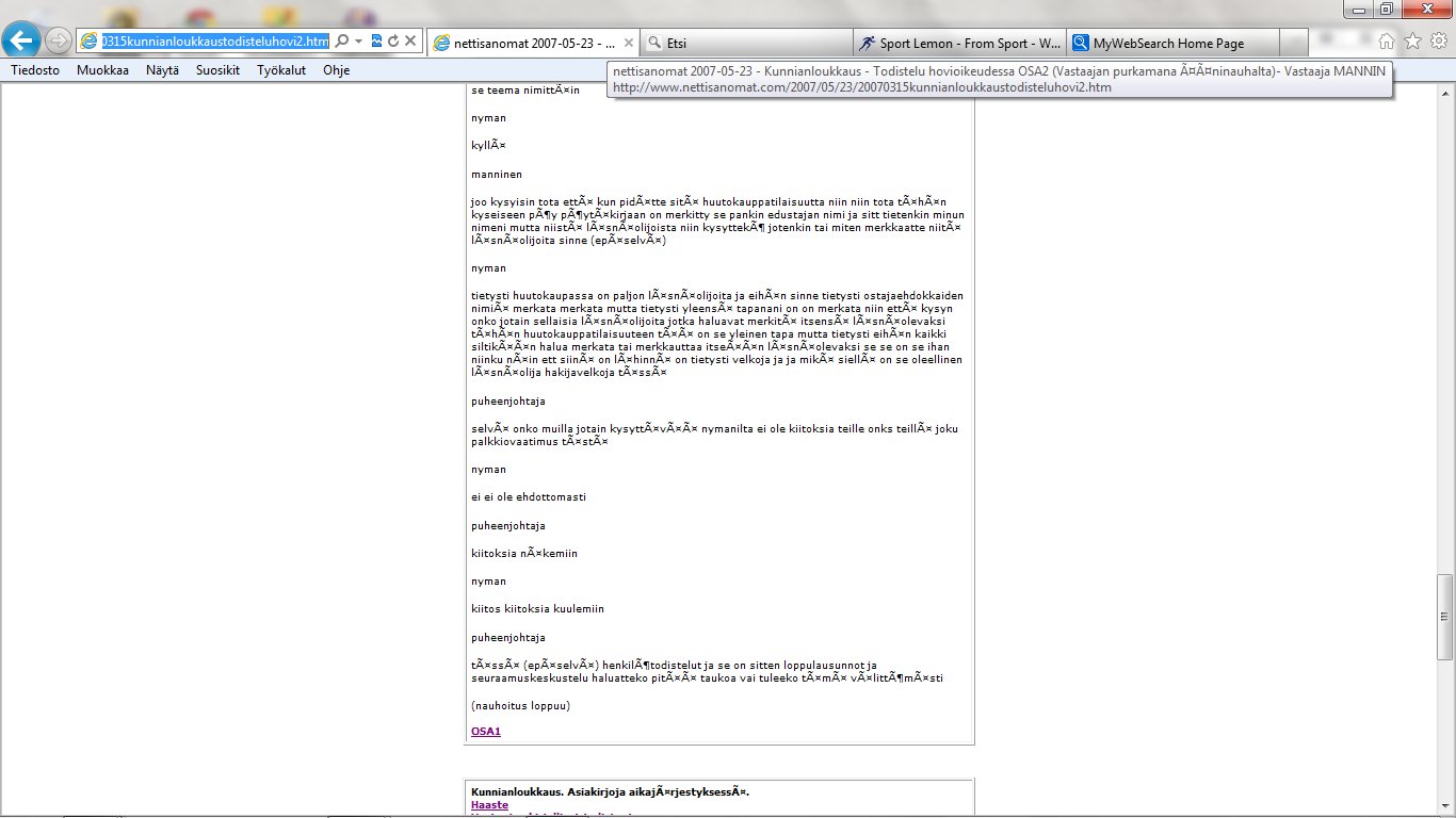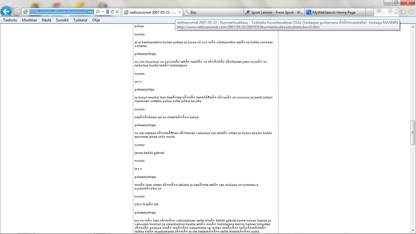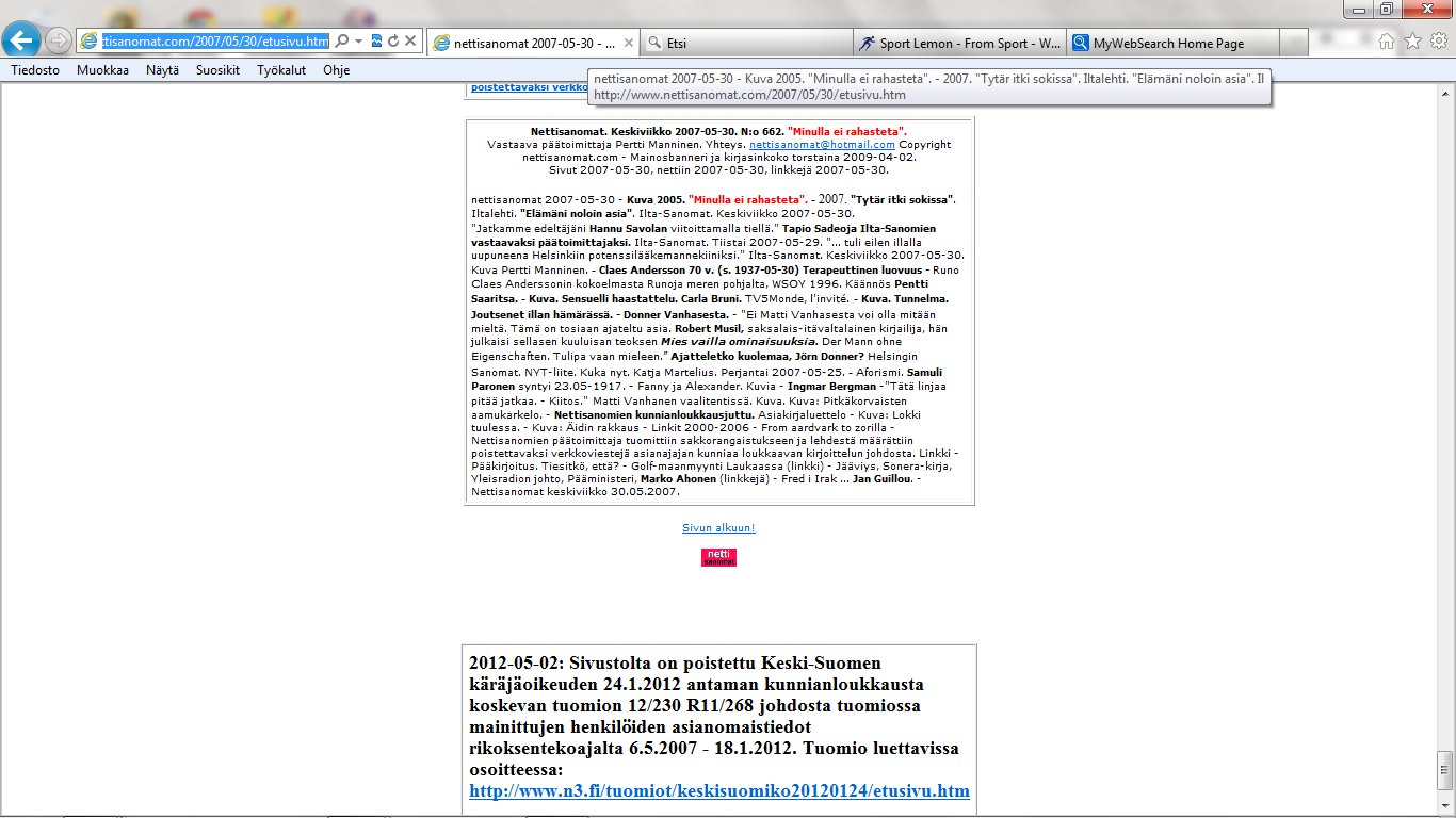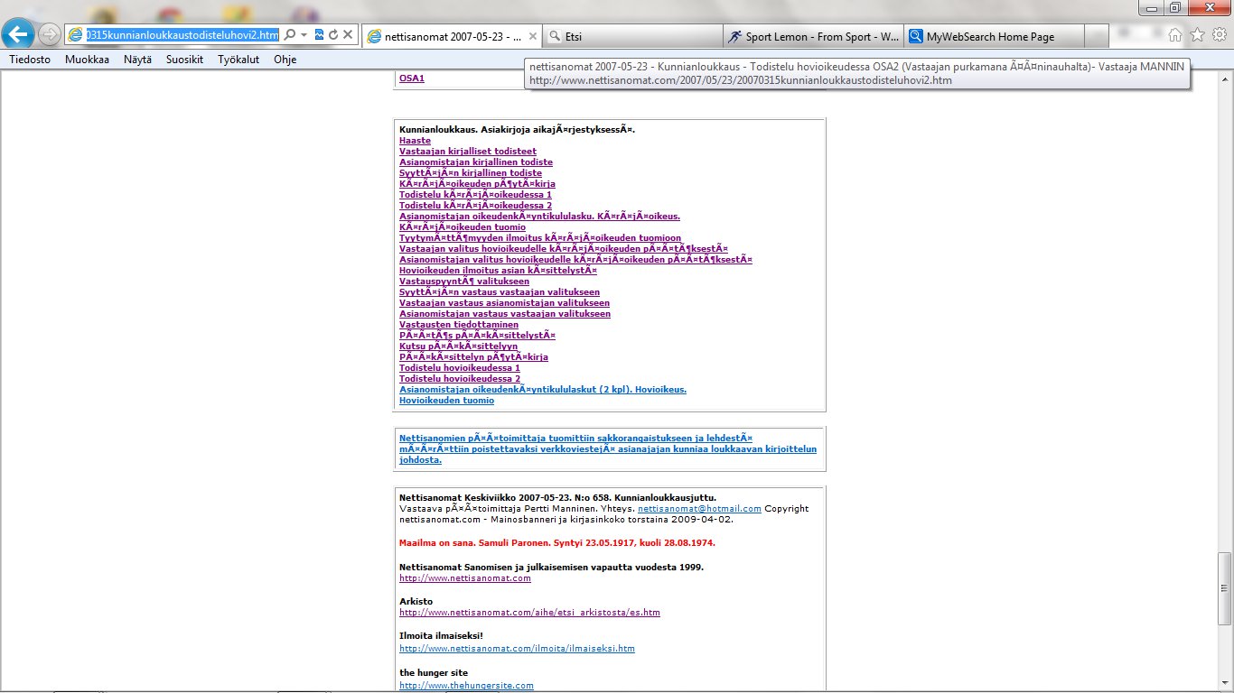 Nettisanomat 2012/06/25 - LIITE. Sivuja, joissa tuomio on pantu täytäntöön. Sivut 109-118/ 565 - VALITUSLUPAHAKEMUS KORKEIMMALLE OIKEUDELLE: Tuomio ja seuraamismääräys sellaisesta rikolliseksi väitetystä teosta, jota ei ole käsitelty oikeudessa ja oikeudessa rikolliseksi todettu, ei ole kansanvaltaisen oikeusvaltion oikeusjärjestyksen mukainen. - Kuva. Poika ja koira. - Kuva. Käden ojennus. Karuselli. - Sunnuntai 24.06.2012 - oikeussivu - Nettisanomat - Sanomanetti - Blogi: Viikkosanomat.fi - Kuvasanomat - Sanomatori - Viikkosanomat - Härkää sarvista - 12.fi -Korkein oikeus, sananvapaus, rajoittaminen, tuomio, käräjäoikeus, kansanvaltainen oikeusvaltio, oikeusjärjestys |