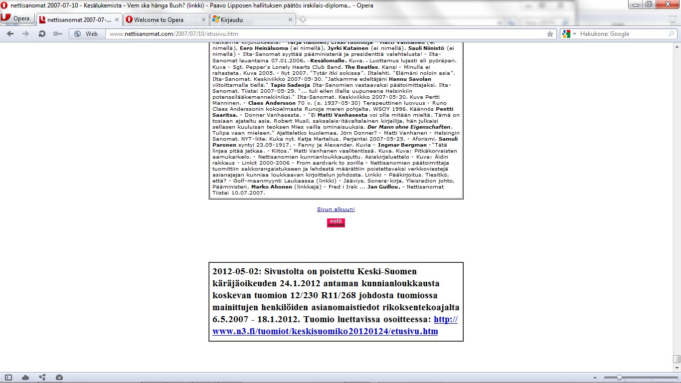 Nettisanomat 2012/06/26 - LIITE. Sivuja, joissa tuomio on pantu täytäntöön. Sivut 139-148/ 565 - VALITUSLUPAHAKEMUS KORKEIMMALLE OIKEUDELLE: Tuomio ja seuraamismääräys sellaisesta rikolliseksi väitetystä teosta, jota ei ole käsitelty oikeudessa ja oikeudessa rikolliseksi todettu, ei ole kansanvaltaisen oikeusvaltion oikeusjärjestyksen mukainen. - Kuva. Poika ja koira. - Kuva. Käden ojennus. Karuselli. - Tiistai 26.06.2012 - oikeussivu - Nettisanomat - Sanomanetti - Blogi: Viikkosanomat.fi - Kuvasanomat - Sanomatori - Viikkosanomat - Härkää sarvista - 12.fi - Korkein oikeus, sananvapaus, rajoittaminen, tuomio, käräjäoikeus, kansanvaltainen oikeusvaltio, oikeusjärjestys |