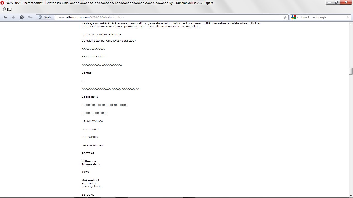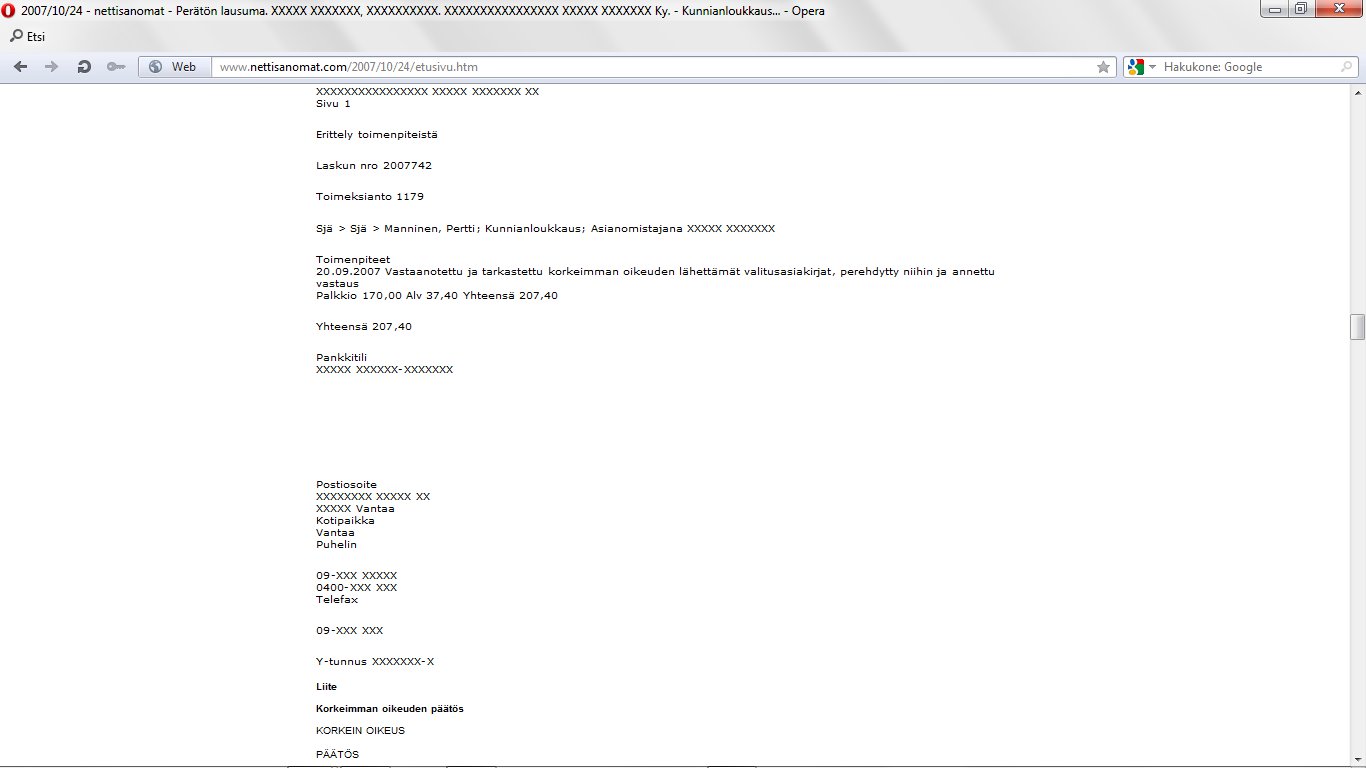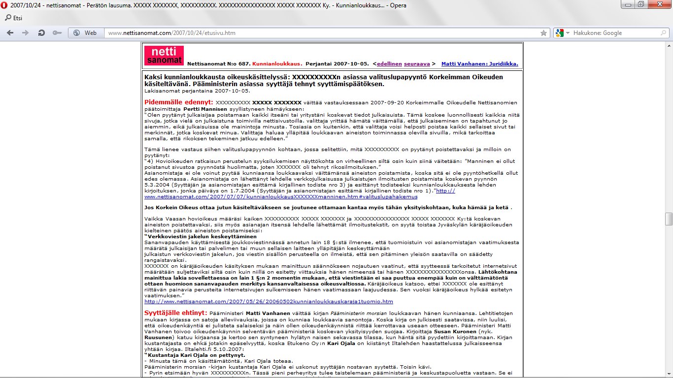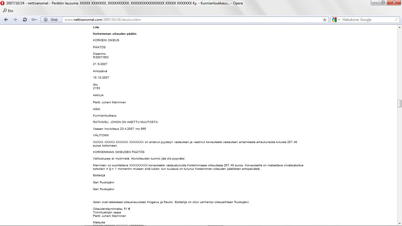 Nettisanomat 2012/06/28 - LIITE. Sivuja, joissa tuomio on pantu täytäntöön. Sivut 179-188/ 565 - VALITUSLUPAHAKEMUS KORKEIMMALLE OIKEUDELLE: Tuomio ja seuraamismääräys sellaisesta rikolliseksi väitetystä teosta, jota ei ole käsitelty oikeudessa ja oikeudessa rikolliseksi todettu, ei ole kansanvaltaisen oikeusvaltion oikeusjärjestyksen mukainen. - Kuva. Poika ja koira. - Kuva. Käden ojennus. Karuselli. - Torstai 28.06.2012 - oikeussivu - Nettisanomat - Sanomanetti - Blogi: Viikkosanomat.fi - Kuvasanomat - Sanomatori - Viikkosanomat - Härkää sarvista - 12.fi - Korkein oikeus, sananvapaus, rajoittaminen, tuomio, käräjäoikeus, kansanvaltainen oikeusvaltio, oikeusjärjestys |