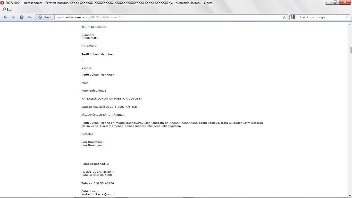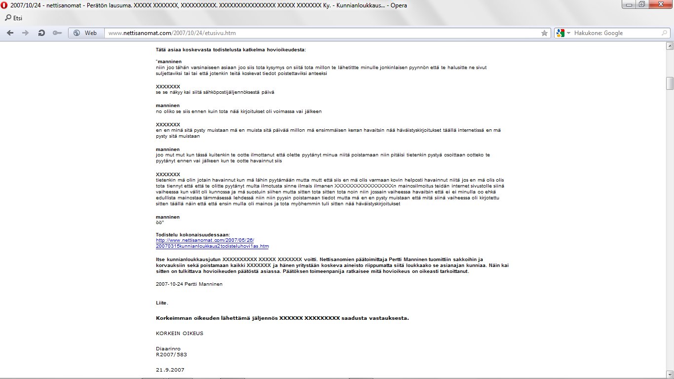 ASIA Valituslupahakemus ja valitus. MUUTOKSENHAUN KOHDE Vaasan hovioikeuden 20.4.2012 antama tuomio nro 438 kunnianloukkausasiassa R 12/275 HAKIJA Manninen, Pertti Juhani I VALITUSLUPAHAKEMUS PERUSTE Pyydän kunnioittavasti, että korkein oikeus myöntäisi minulle luvan hakea muutosta yllämainittuun hovioikeuden tuomioon, koska 1) siihen on erityistä aihetta asiassa tapahtuneen sellaisen oikeudenkäyntivirheen takia, jonka perusteella ratkaisu olisi purettava tai poistettava 2) siihen on erityistä aihetta asiassa tapahtuneen muun virheen takia, jonka perusteella ratkaisu olisi purettava tai poistettava 3) lain soveltamisen kannalta muissa samanlaisissa tapauksissa on tärkeätä saattaa asia Korkeimman oikeuden ratkaistavaksi PERUSTELUT 1. Hovioikeus on evännyt jatkokäsittelyluvan perustelunaan, ettei ole syytä epäillä käräjäoikeuden ratkaisun lopputuloksen oikeellisuutta. Ratkaisu on sananvapauslain vastainen, kun siinä vastoin lain määräystä rajoitetaan tarpeettomasti sananvapautta. 2. Hovioikeus on jättänyt voimaan sellaisen käräjäoikeuden tuomion, jossa käräjäoikeus on määrännyt rangaistuksen ja seuraamukset sellaisista asioista (kirjoituksista), joita ei ollenkaan käsitelty käräjäoikeudessa. Lisäksi käräjäoikeus on määrännyt poistettavaksi sellaisenaan (ilman minkäänlaista kommentointia) julkaistut oikeudenkäyntipöytäkirjat. II VALITUS VAATIMUKSET Kunnioittavasti pyydän, että korkein oikeus kumoaa käräjäoikeuden ja hovioikeuden tuomiot. PERUSTELUT Toistan kaikki tässä asiassa aikaisemmin suullisesti lausumani ja esille tuomani kirjallisen materiaalin. Tarkoitukseni ei ole ollut loukata asianomistajien kunniaa, vaan kirjoittaa ja selostaa asianomistajien toimintaa niin kuin se on oikeasti tapahtunut. Tällaisten asioiden esille tuominen ja siitä kirjoittaminen ei voi olla loukkaavaa eikä tällä mitenkään väitetä, että asianomistajat olisivat olleet mukana jossakin lainvastaisessa toiminnassa. Asianomistaja Lauri Kara on esittänyt kaksi kirjoitusta, jotka ovat mukana oikeudenkäyntiaineistossa ja lukuisan joukon hakutuloksia, jotka tulevat näistä kirjoituksista ja myös oikeudenkäyntipöytäkirjoista. Käräjäoikeus on määrännyt näistä kirjoituksista poistettavaksi asiaosaistiedot, jotka olivat edellä kerrotun mukaan jo poistettu ennen oikeudenkäyntiä, joista dokumentit esitettiin käräjäoikeuden istunnon aikana ja jotka ovat mukana oikeudenkäyntiaineistossa. Käräjäoikeus on vastoin lain selvää määräystä siitä, että sananvapautta ei pidä tarpeettomasti rajoittaa, menetellyt juuri näin. Näiden kirjoitusten lisäksi käräjäoikeus määräsi poistettavaksi asianosaistiedot myös sellaisista kirjoituksista ja oikeudenkäyntipöytäkirjoista, jotka eivät olleet kirjallisina todisteina tai joita ei muutenkaan käsitelty oikeudenkäynnissä. Oikeudenkäyntipöytäkirjojen osalta tosin käräjäoikeus totesi riittämättömin perustein, että niistä asianosaistiedot piti poistaa, koska pöytäkirjat oli julkaistu "kunnianloukkaustarkoituksessa". Muiden kirjoitusten osalta oikeus katsoi niitä siis mitenkään käsittelemättä, että ne loukkasivat asianomistajan kunniaa. Käräjäoikeus on vastoin lain selvää määräystä siitä, että sananvapautta ei pidä tarpeettomasti rajoittaa, menetellyt juuri näin. TÄYTÄNTÖÖNPANO ja "Vastaus kuulemiskirjeeseen 27/IJJ (Kihlakunnanvouti Iivari Järvinen) Oheisissa liitteissä on sivut siitä aineistosta, jotka käräjäoikeuden tuomion mukaan piti poistaa, mutta jota aineistoa ei ollenkaan käsitelty oikeudenistunnossa. Pyydän, että tämä aineisto otetaan huomioon kirjallisina todisteina, koska sitä ei ollut vielä silloin poistot tehtyinä, kun hovioikeus teki päätöksensä siitä, että se ei ota valitustani käsittelyyn. Nämä todisteet osoittavat sen, että käräjäoikeus on tarpeettomasti rajoittanut sananvapautta, koska niissä ei ole mitään asianomistajien kunniaa loukkaavaa. ASIANOMISTAJIEN ERILLISYYS Vaikka käräjäoikeuden tuomio on yhteinen molempien asianomistajien kanssa, niin tietenkään Lauri Karan esittämät kunniaansa loukkaavaksi väittämänsä kirjoitukset eivät loukkaa Pekka Monosen kunniaa, jollei tämä asianomistaja näin väitä. Näin hän ei oikeudenkäynnissä missään yhteydessä väittänyt, joten asianosaistietojen poistovaatimus voi koskea vain Lauri Karaa näissä kirjoituksissa. Käräjäoikeus ei ole tätä rajannut ja on siis tältäkin osin rajoittanut tarpeettomasti sananvapautta tässä asiassa. Mikäli korkein oikeus kuitenkin katsoo minun syyllistyneen kunnianloukkausrikokseen ja määrää siitä rangaistuksen pyydän kunnioittavasti seuraavaa: 1) Rangaistusseuraamus Pyydän lieventämään rangaistusta. 2) Korvausvelvollisuus Pyydän lieventämään korvausvelvollisuutta hovioikeuteen jättämäni pyynnön mukaisesti koskien Pekka Monosen ja Lauri Karan vaatimuksia.. 3) Verkkoviestin jakelun keskeyttäminen Lähtökohtana mainittua lakia sovellettaessa on lain 1 §:n 2 momentin mukaan, että viestintään ei saa puuttua enempää kuin on välttämätöntä ottaen huomioon sananvapauden merkitys kansanvaltaisessa oikeusvaltiossa. Asianomistajien vaatimus ja käräjäoikeuden tuomio on edellä esitettyjen lainkohtien mukaan liian laaja. Poistamisvaatimus voi näin ollen kohdistua vain siihen aineistoon, joka oikeudessa esiteltiin ja käsiteltiin ja joka todettiin rikolliseksi, kunniaa loukkaavaksi. Tuomio ja seuraamismääräys sellaisesta rikolliseksi väitetystä teosta, jota ei ole käsitelty oikeudessa ja oikeudessa rikolliseksi todettu, ei ole kansanvaltaisen oikeusvaltion oikeusjärjestyksen mukainen. LIITTEET Kunnioittavasti PÄIVÄYS Laukaassa kesäkuun 18. päivänä 2012 Pertti Manninen |