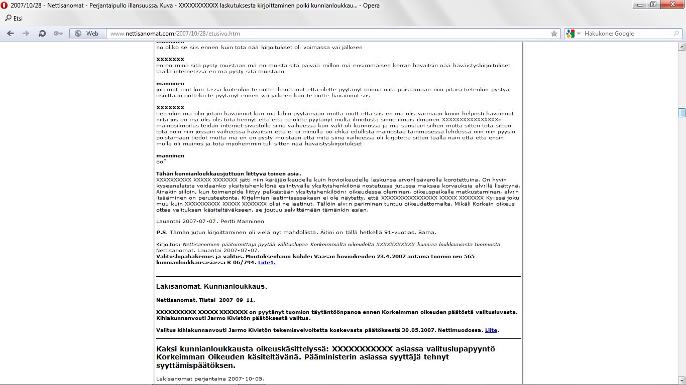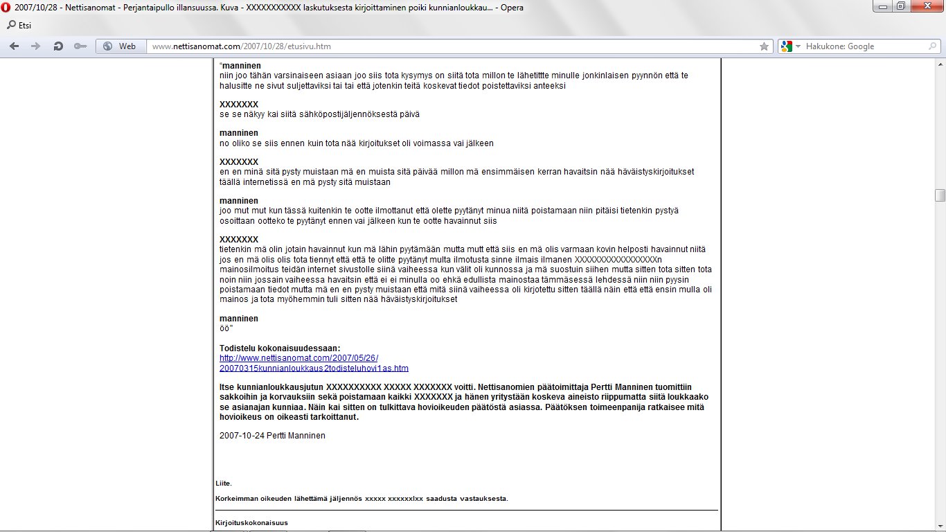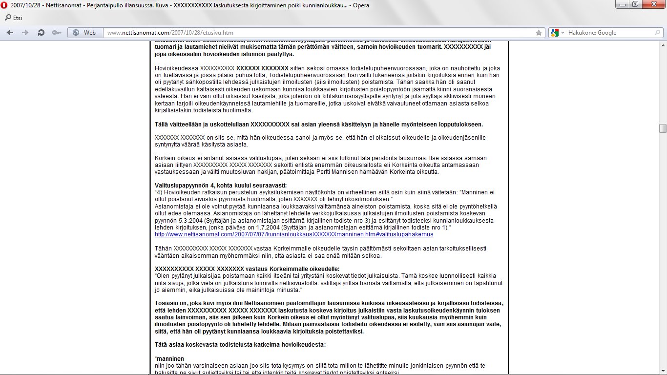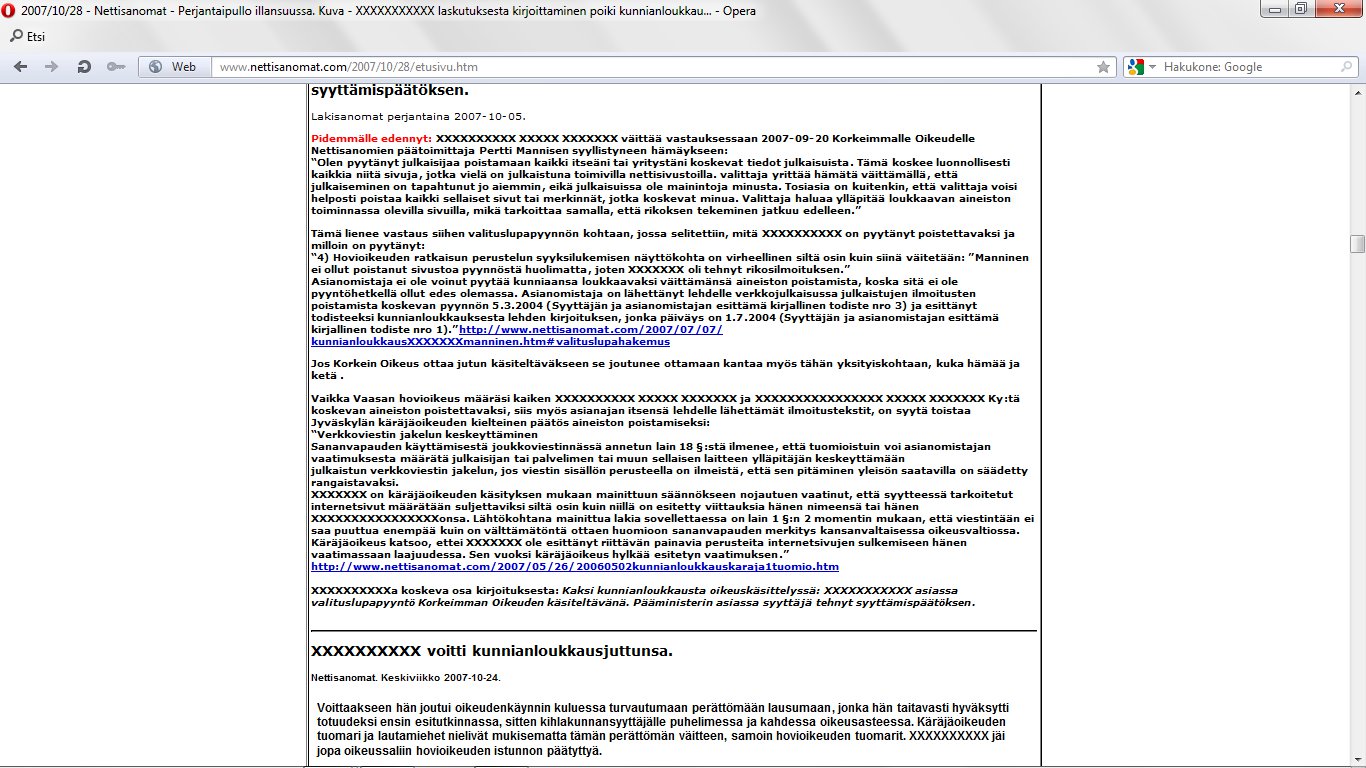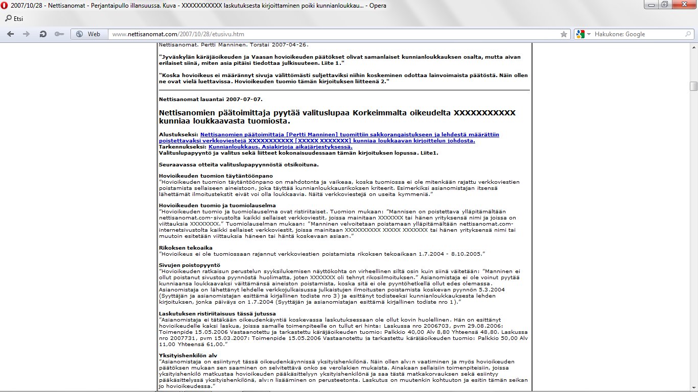 ASIA Valituslupahakemus ja valitus. MUUTOKSENHAUN KOHDE Vaasan hovioikeuden 20.4.2012 antama tuomio nro 438 kunnianloukkausasiassa R 12/275 HAKIJA Manninen, Pertti Juhani I VALITUSLUPAHAKEMUS PERUSTE Pyydän kunnioittavasti, että korkein oikeus myöntäisi minulle luvan hakea muutosta yllämainittuun hovioikeuden tuomioon, koska 1) siihen on erityistä aihetta asiassa tapahtuneen sellaisen oikeudenkäyntivirheen takia, jonka perusteella ratkaisu olisi purettava tai poistettava 2) siihen on erityistä aihetta asiassa tapahtuneen muun virheen takia, jonka perusteella ratkaisu olisi purettava tai poistettava 3) lain soveltamisen kannalta muissa samanlaisissa tapauksissa on tärkeätä saattaa asia Korkeimman oikeuden ratkaistavaksi PERUSTELUT 1. Hovioikeus on evännyt jatkokäsittelyluvan perustelunaan, ettei ole syytä epäillä käräjäoikeuden ratkaisun lopputuloksen oikeellisuutta. Ratkaisu on sananvapauslain vastainen, kun siinä vastoin lain määräystä rajoitetaan tarpeettomasti sananvapautta. 2. Hovioikeus on jättänyt voimaan sellaisen käräjäoikeuden tuomion, jossa käräjäoikeus on määrännyt rangaistuksen ja seuraamukset sellaisista asioista (kirjoituksista), joita ei ollenkaan käsitelty käräjäoikeudessa. Lisäksi käräjäoikeus on määrännyt poistettavaksi sellaisenaan (ilman minkäänlaista kommentointia) julkaistut oikeudenkäyntipöytäkirjat. II VALITUS VAATIMUKSET Kunnioittavasti pyydän, että korkein oikeus kumoaa käräjäoikeuden ja hovioikeuden tuomiot. PERUSTELUT Toistan kaikki tässä asiassa aikaisemmin suullisesti lausumani ja esille tuomani kirjallisen materiaalin. Tarkoitukseni ei ole ollut loukata asianomistajien kunniaa, vaan kirjoittaa ja selostaa asianomistajien toimintaa niin kuin se on oikeasti tapahtunut. Tällaisten asioiden esille tuominen ja siitä kirjoittaminen ei voi olla loukkaavaa eikä tällä mitenkään väitetä, että asianomistajat olisivat olleet mukana jossakin lainvastaisessa toiminnassa. Asianomistaja Lauri Kara on esittänyt kaksi kirjoitusta, jotka ovat mukana oikeudenkäyntiaineistossa ja lukuisan joukon hakutuloksia, jotka tulevat näistä kirjoituksista ja myös oikeudenkäyntipöytäkirjoista. Käräjäoikeus on määrännyt näistä kirjoituksista poistettavaksi asiaosaistiedot, jotka olivat edellä kerrotun mukaan jo poistettu ennen oikeudenkäyntiä, joista dokumentit esitettiin käräjäoikeuden istunnon aikana ja jotka ovat mukana oikeudenkäyntiaineistossa. Käräjäoikeus on vastoin lain selvää määräystä siitä, että sananvapautta ei pidä tarpeettomasti rajoittaa, menetellyt juuri näin. Näiden kirjoitusten lisäksi käräjäoikeus määräsi poistettavaksi asianosaistiedot myös sellaisista kirjoituksista ja oikeudenkäyntipöytäkirjoista, jotka eivät olleet kirjallisina todisteina tai joita ei muutenkaan käsitelty oikeudenkäynnissä. Oikeudenkäyntipöytäkirjojen osalta tosin käräjäoikeus totesi riittämättömin perustein, että niistä asianosaistiedot piti poistaa, koska pöytäkirjat oli julkaistu "kunnianloukkaustarkoituksessa". Muiden kirjoitusten osalta oikeus katsoi niitä siis mitenkään käsittelemättä, että ne loukkasivat asianomistajan kunniaa. Käräjäoikeus on vastoin lain selvää määräystä siitä, että sananvapautta ei pidä tarpeettomasti rajoittaa, menetellyt juuri näin. TÄYTÄNTÖÖNPANO ja "Vastaus kuulemiskirjeeseen 27/IJJ (Kihlakunnanvouti Iivari Järvinen) Oheisissa liitteissä on sivut siitä aineistosta, jotka käräjäoikeuden tuomion mukaan piti poistaa, mutta jota aineistoa ei ollenkaan käsitelty oikeudenistunnossa. Pyydän, että tämä aineisto otetaan huomioon kirjallisina todisteina, koska sitä ei ollut vielä silloin poistot tehtyinä, kun hovioikeus teki päätöksensä siitä, että se ei ota valitustani käsittelyyn. Nämä todisteet osoittavat sen, että käräjäoikeus on tarpeettomasti rajoittanut sananvapautta, koska niissä ei ole mitään asianomistajien kunniaa loukkaavaa. ASIANOMISTAJIEN ERILLISYYS Vaikka käräjäoikeuden tuomio on yhteinen molempien asianomistajien kanssa, niin tietenkään Lauri Karan esittämät kunniaansa loukkaavaksi väittämänsä kirjoitukset eivät loukkaa Pekka Monosen kunniaa, jollei tämä asianomistaja näin väitä. Näin hän ei oikeudenkäynnissä missään yhteydessä väittänyt, joten asianosaistietojen poistovaatimus voi koskea vain Lauri Karaa näissä kirjoituksissa. Käräjäoikeus ei ole tätä rajannut ja on siis tältäkin osin rajoittanut tarpeettomasti sananvapautta tässä asiassa. Mikäli korkein oikeus kuitenkin katsoo minun syyllistyneen kunnianloukkausrikokseen ja määrää siitä rangaistuksen pyydän kunnioittavasti seuraavaa: 1) Rangaistusseuraamus Pyydän lieventämään rangaistusta. 2) Korvausvelvollisuus Pyydän lieventämään korvausvelvollisuutta hovioikeuteen jättämäni pyynnön mukaisesti koskien Pekka Monosen ja Lauri Karan vaatimuksia.. 3) Verkkoviestin jakelun keskeyttäminen Lähtökohtana mainittua lakia sovellettaessa on lain 1 §:n 2 momentin mukaan, että viestintään ei saa puuttua enempää kuin on välttämätöntä ottaen huomioon sananvapauden merkitys kansanvaltaisessa oikeusvaltiossa. Asianomistajien vaatimus ja käräjäoikeuden tuomio on edellä esitettyjen lainkohtien mukaan liian laaja. Poistamisvaatimus voi näin ollen kohdistua vain siihen aineistoon, joka oikeudessa esiteltiin ja käsiteltiin ja joka todettiin rikolliseksi, kunniaa loukkaavaksi. Tuomio ja seuraamismääräys sellaisesta rikolliseksi väitetystä teosta, jota ei ole käsitelty oikeudessa ja oikeudessa rikolliseksi todettu, ei ole kansanvaltaisen oikeusvaltion oikeusjärjestyksen mukainen. LIITTEET Kunnioittavasti PÄIVÄYS Laukaassa kesäkuun 18. päivänä 2012 Pertti Manninen |
