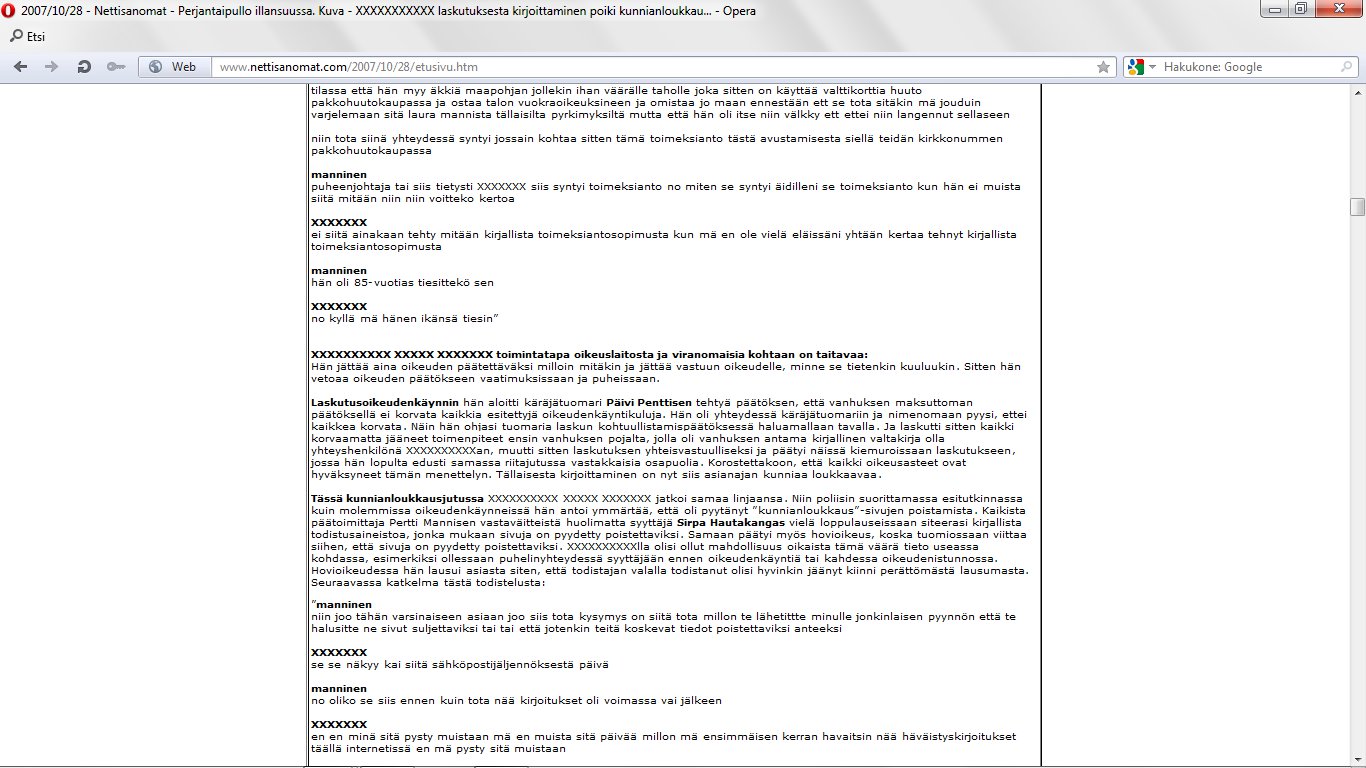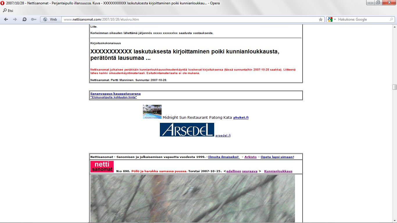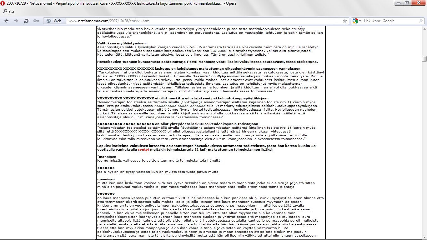 Nettisanomat 2012/06/29 - LIITE. Sivuja, joissa tuomio on pantu täytäntöön. Sivut 209-218/ 565 - VALITUSLUPAHAKEMUS KORKEIMMALLE OIKEUDELLE: Tuomio ja seuraamismääräys sellaisesta rikolliseksi väitetystä teosta, jota ei ole käsitelty oikeudessa ja oikeudessa rikolliseksi todettu, ei ole kansanvaltaisen oikeusvaltion oikeusjärjestyksen mukainen. - Kuva. Poika ja koira. - Kuva. Käden ojennus. Karuselli. - Perjantai 29.06.2012 - oikeussivu - Nettisanomat - Sanomanetti - Blogi: Viikkosanomat.fi - Kuvasanomat - Sanomatori - Viikkosanomat - Härkää sarvista - 12.fi - Korkein oikeus, sananvapaus, rajoittaminen, tuomio, käräjäoikeus, kansanvaltainen oikeusvaltio, oikeusjärjestys |