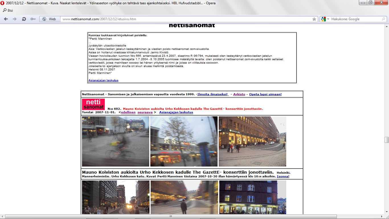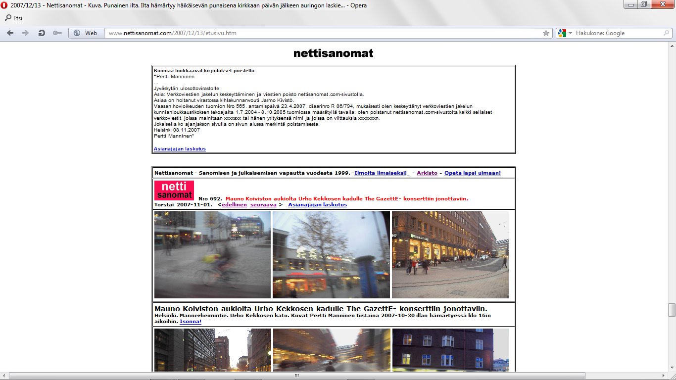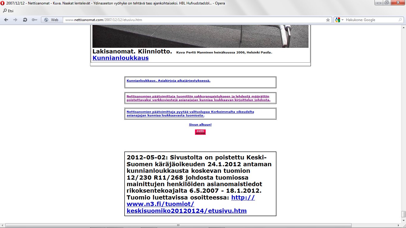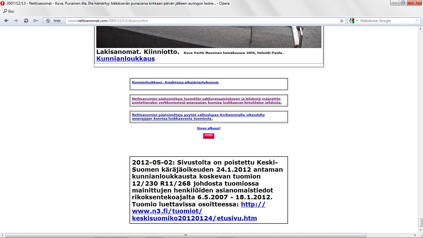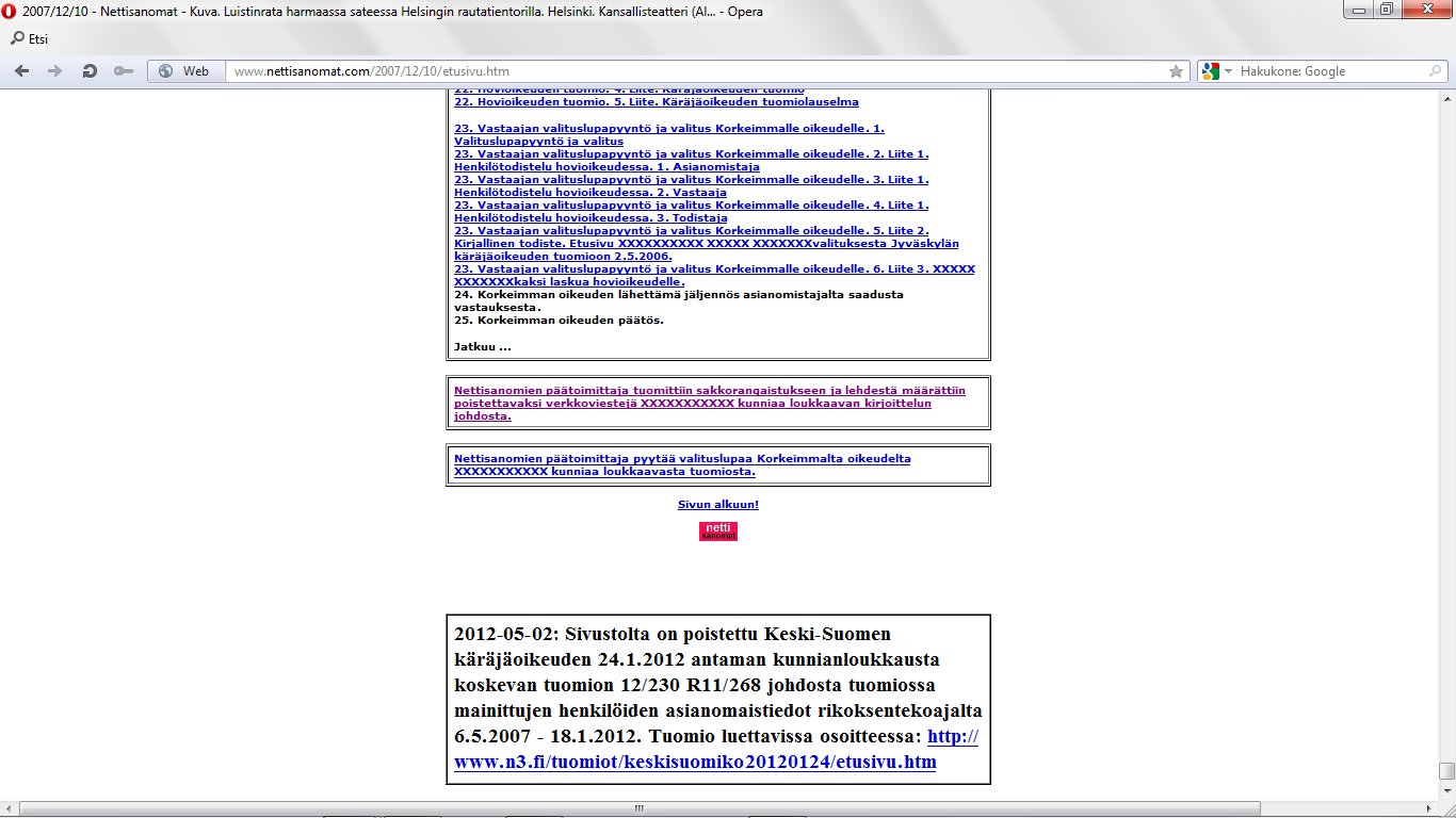 Nettisanomat 2012/06/30 - LIITE. Sivuja, joissa tuomio on pantu täytäntöön. Sivut 249-258/ 565 - VALITUSLUPAHAKEMUS KORKEIMMALLE OIKEUDELLE: Tuomio ja seuraamismääräys sellaisesta rikolliseksi väitetystä teosta, jota ei ole käsitelty oikeudessa ja oikeudessa rikolliseksi todettu, ei ole kansanvaltaisen oikeusvaltion oikeusjärjestyksen mukainen. - Kuva. Poika ja koira. - Kuva. Käden ojennus. Karuselli. - Lauantai 30.06.2012 - oikeussivu - Nettisanomat - Sanomanetti - Blogi: Viikkosanomat.fi - Kuvasanomat - Sanomatori - Viikkosanomat - Härkää sarvista - 12.fi - Korkein oikeus, sananvapaus, rajoittaminen, tuomio, käräjäoikeus, kansanvaltainen oikeusvaltio, oikeusjärjestys |