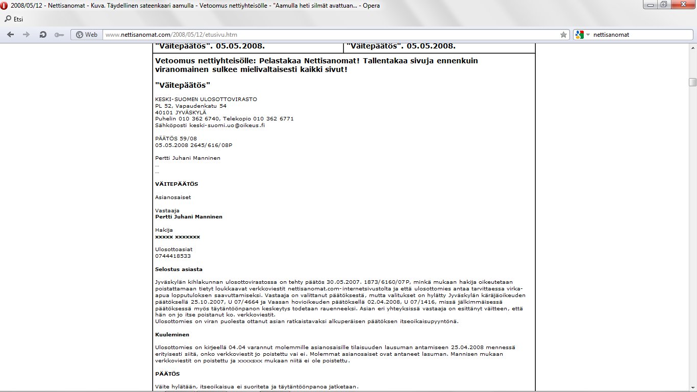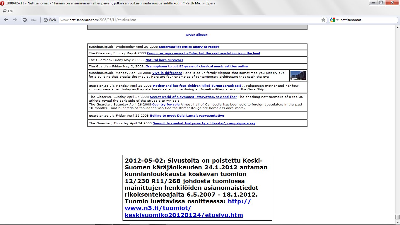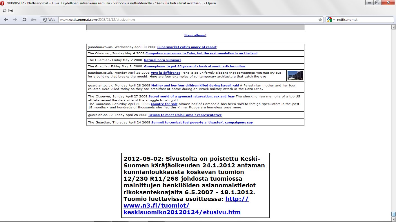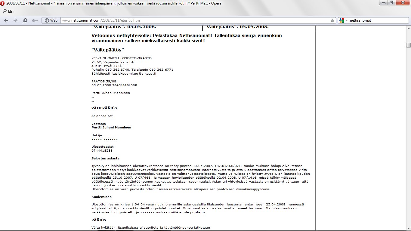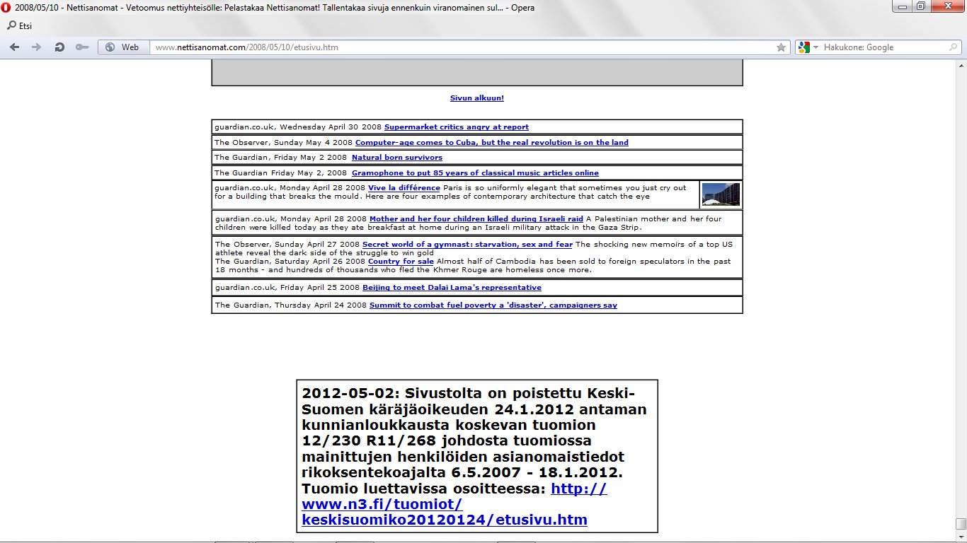 Nettisanomat 2012/07/01 - LIITE. Sivuja, joissa tuomio on pantu täytäntöön. Sivut 269-278/ 565 - VALITUSLUPAHAKEMUS KORKEIMMALLE OIKEUDELLE: Tuomio ja seuraamismääräys sellaisesta rikolliseksi väitetystä teosta, jota ei ole käsitelty oikeudessa ja oikeudessa rikolliseksi todettu, ei ole kansanvaltaisen oikeusvaltion oikeusjärjestyksen mukainen. - Kuva. Poika ja koira. - Kuva. Käden ojennus. Karuselli. - Sunnuntai 01.07.2012 - oikeussivu - Nettisanomat - Sanomanetti - Blogi: Viikkosanomat.fi - Kuvasanomat - Sanomatori - Viikkosanomat - Härkää sarvista - 12.fi - Korkein oikeus, sananvapaus, rajoittaminen, tuomio, käräjäoikeus, kansanvaltainen oikeusvaltio, oikeusjärjestys |